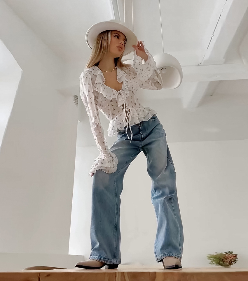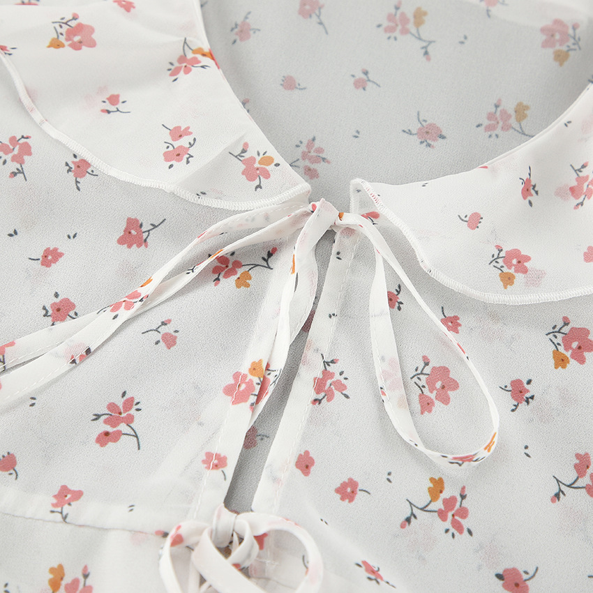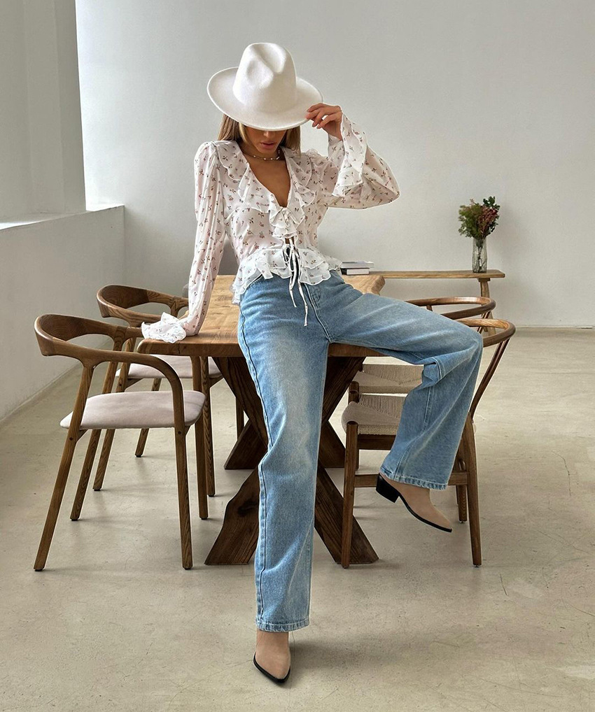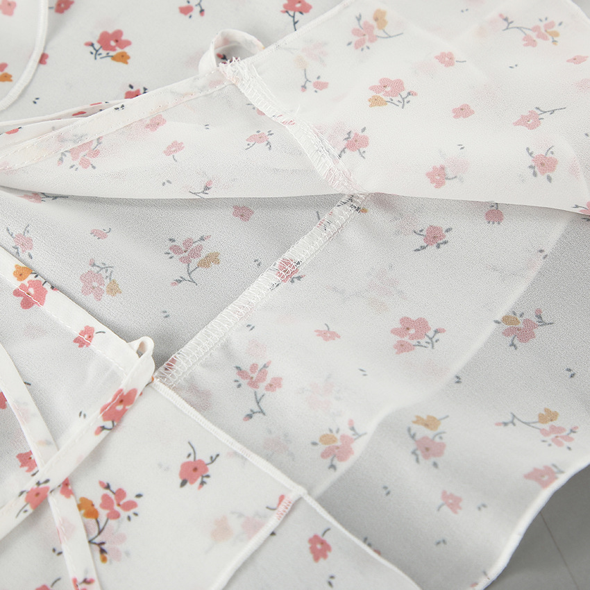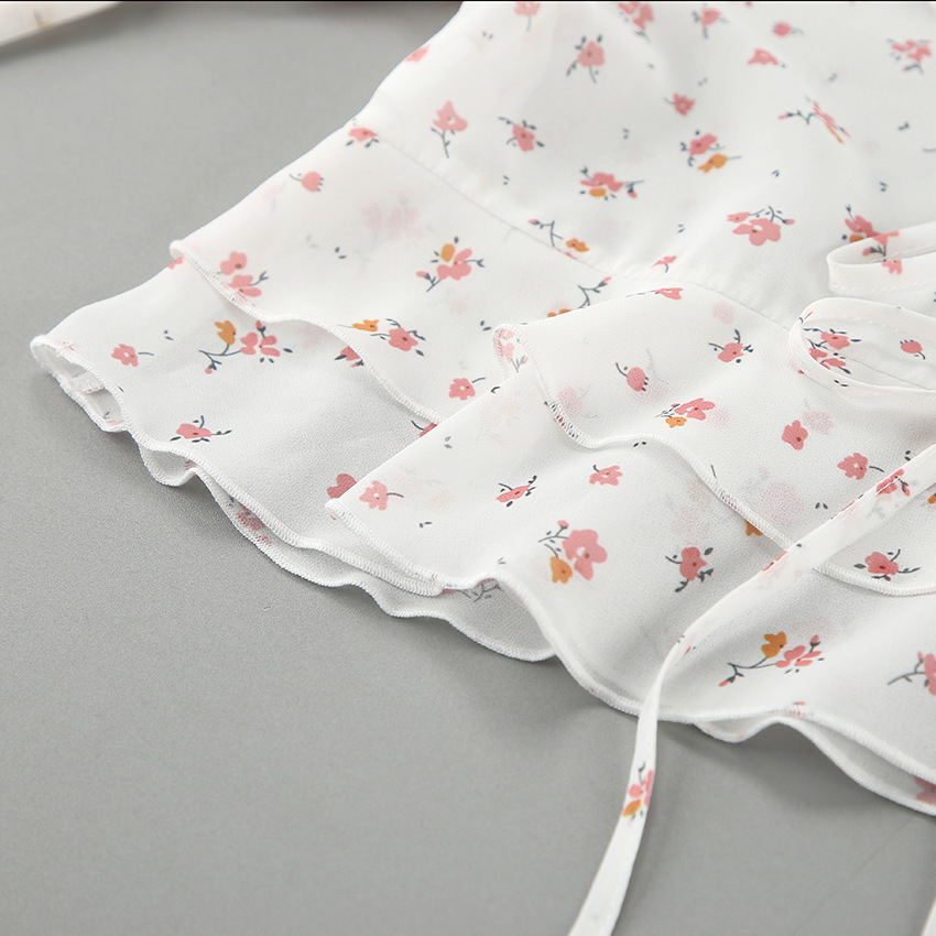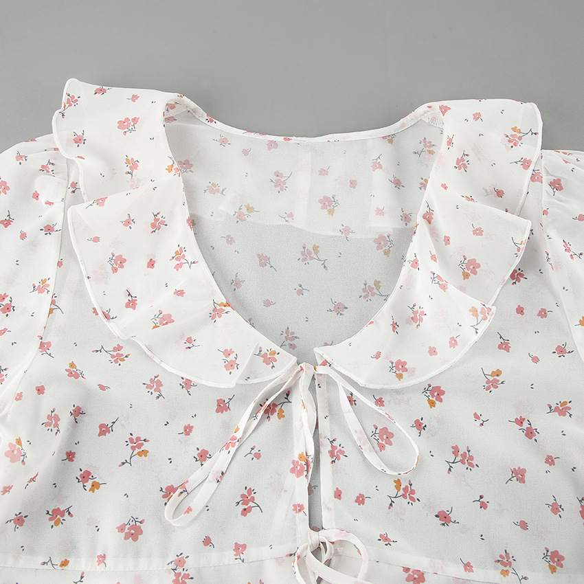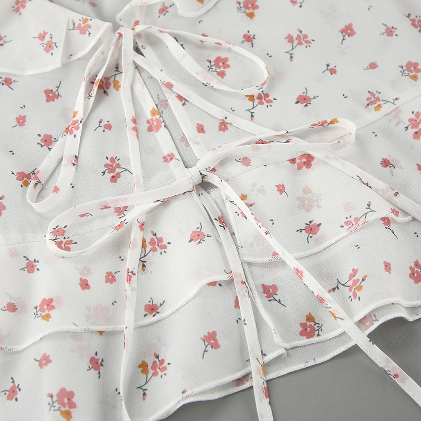프랑스 스타일 우아한 쉬폰 인쇄 가을 슬림 핏 섹시한 V 넥 트럼펫 슬리브 레이스 업 러플 셔츠