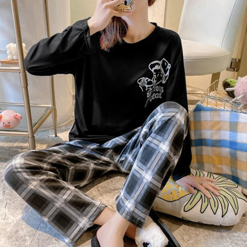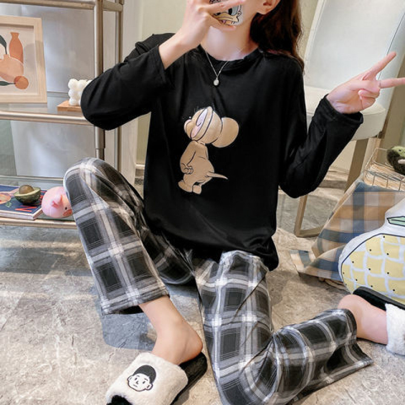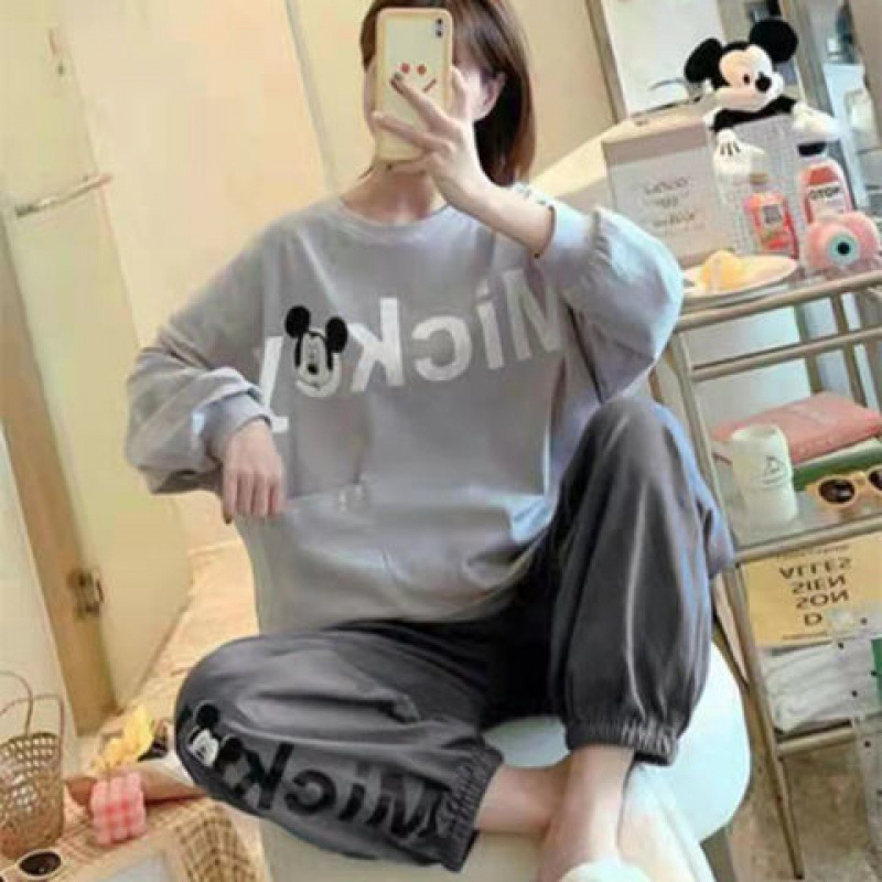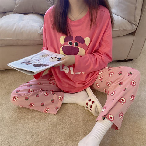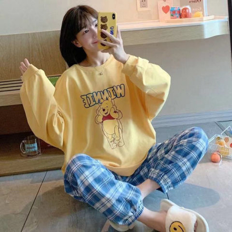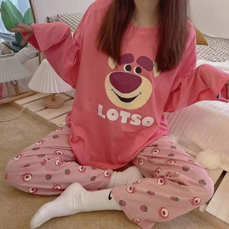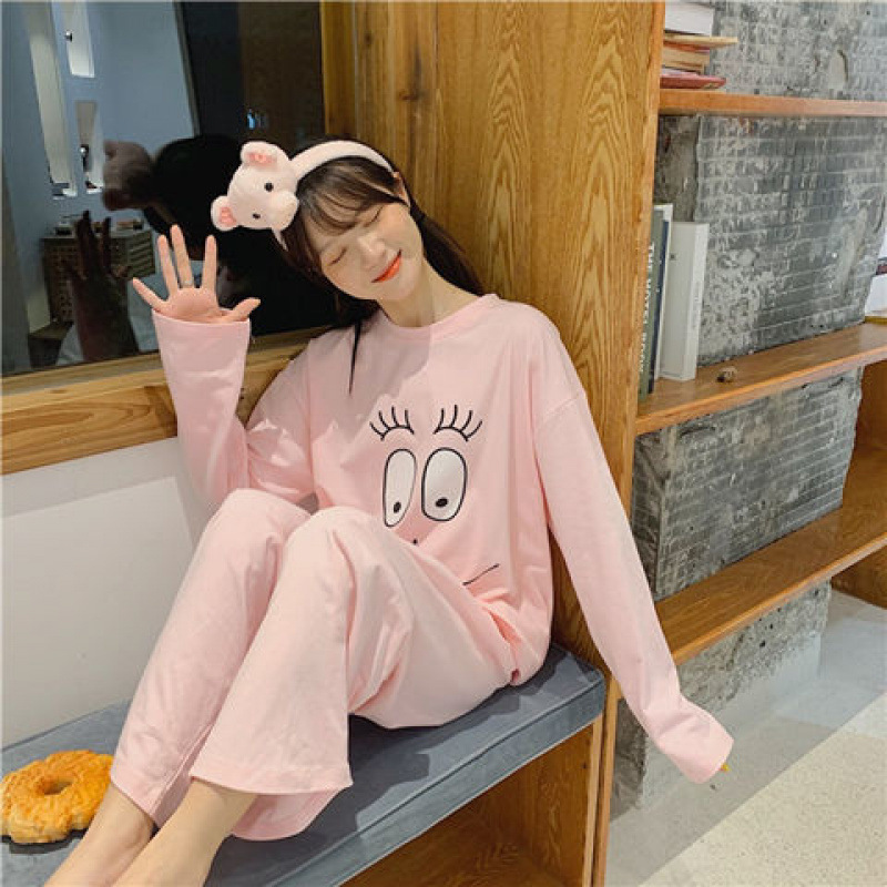 잠옷 여성의 봄과 가을 새로운 한국식 만화 느슨한 긴 소매 2 세트 학생 플러스 사이즈 집 옷스토어 가기