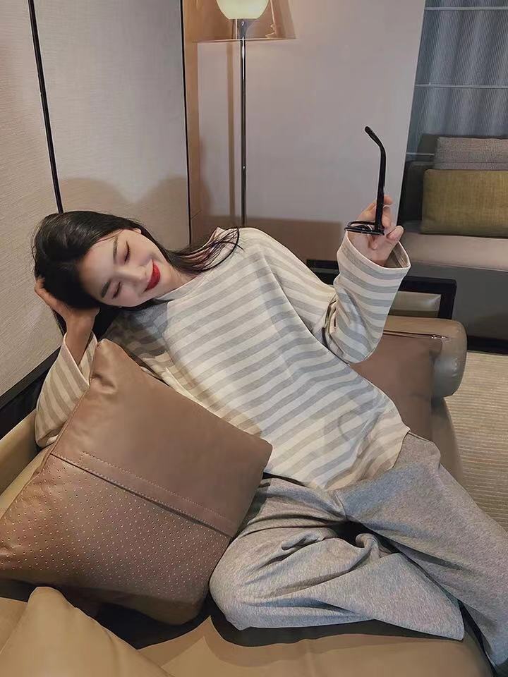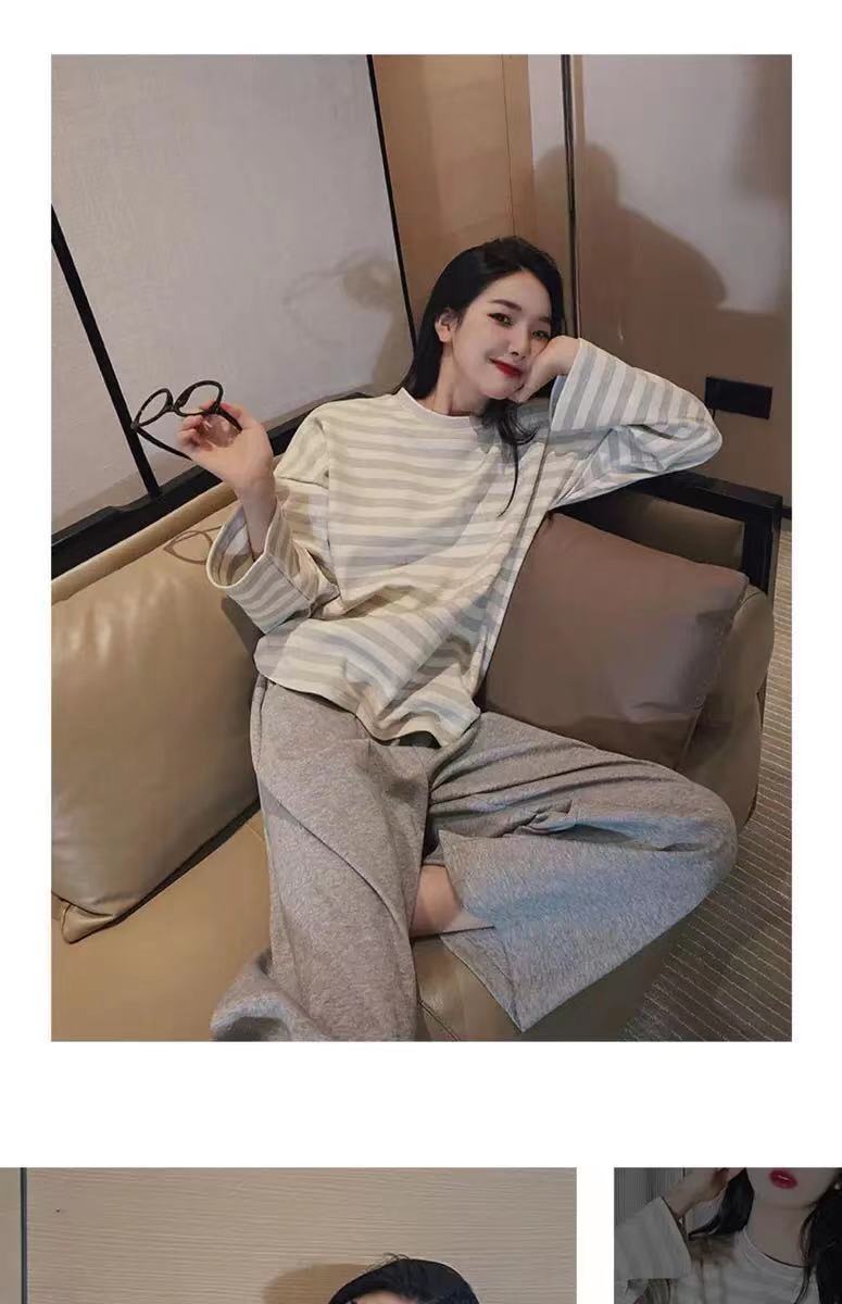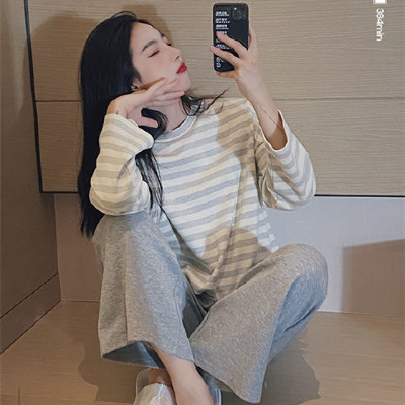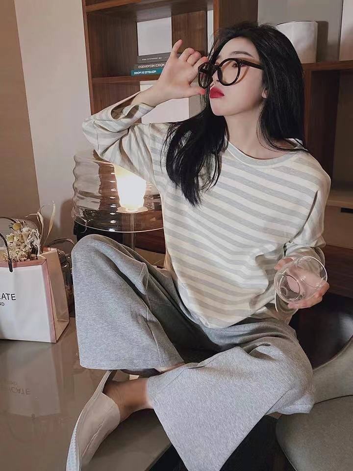 • 크림 그레이 스트라이프 긴팔 탑 + 바지