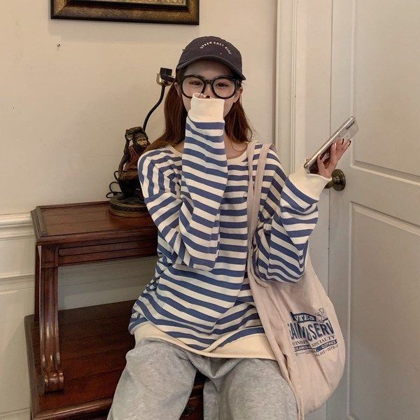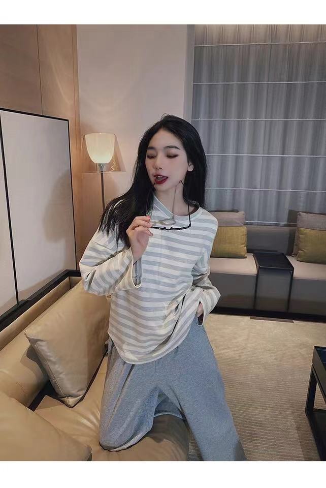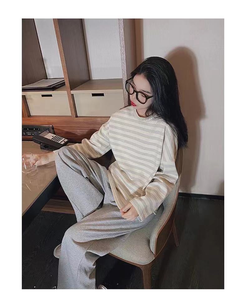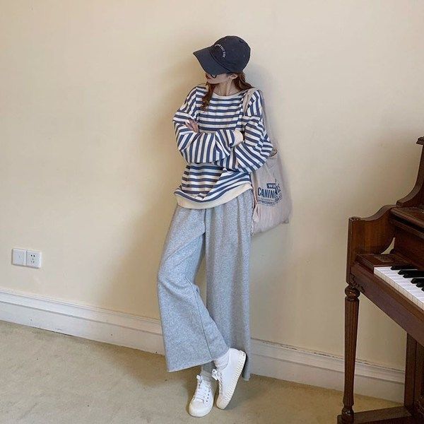 • 살구 블루 스트라이프 긴팔 스웨트셔츠 + 그레이 팬츠