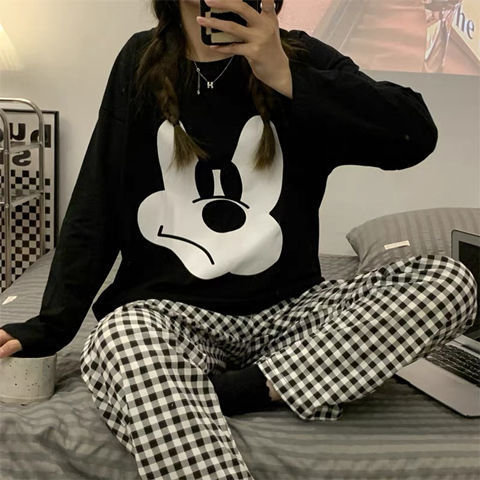 • 여성용 흑백 미키 헤드 긴팔 탑 + 작은 체크 무늬 바지
