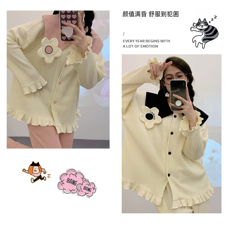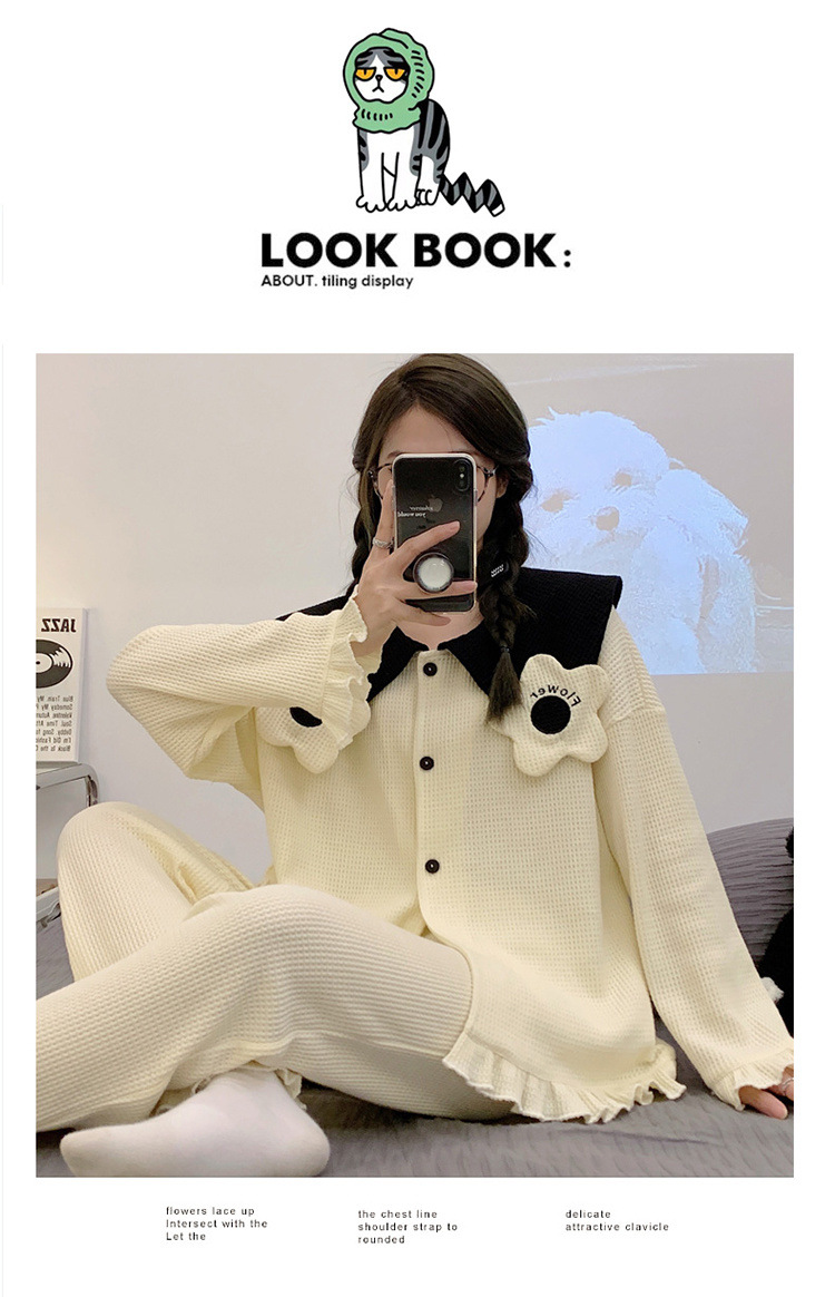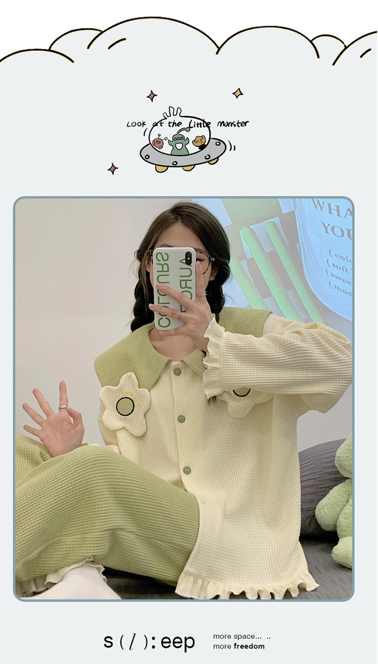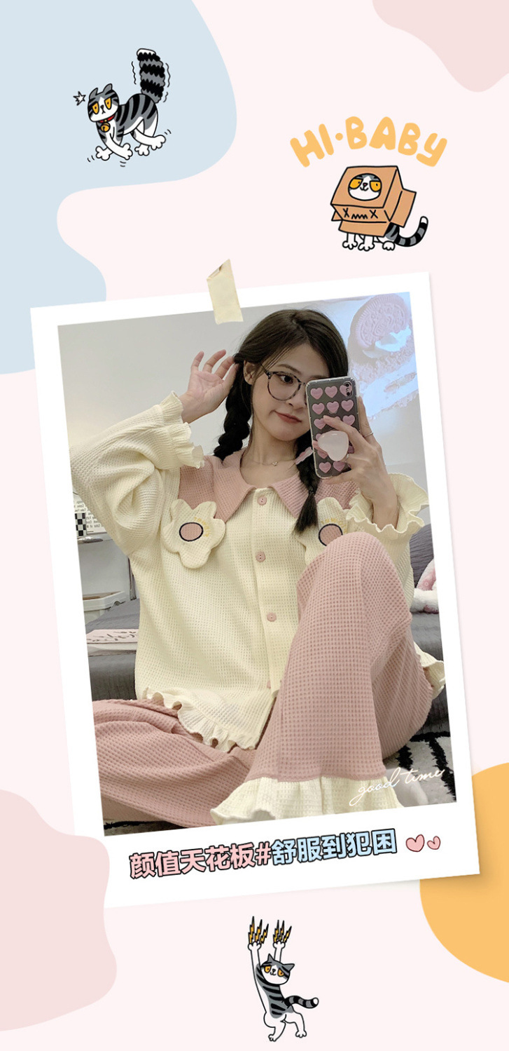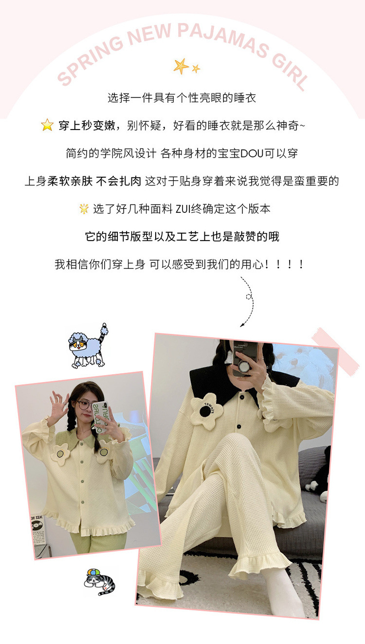 Waffleshian Pajamas 여성의 봄과 가을 서양 스타일 새로운 긴 소매 사이버 인기 만화 귀여운 달콤한 겉옷 홈 세트스토어 가기