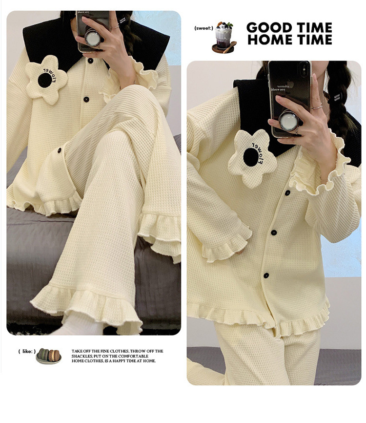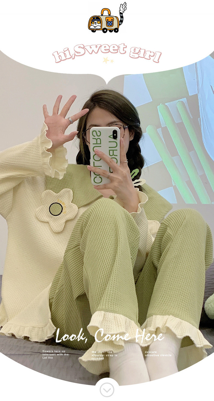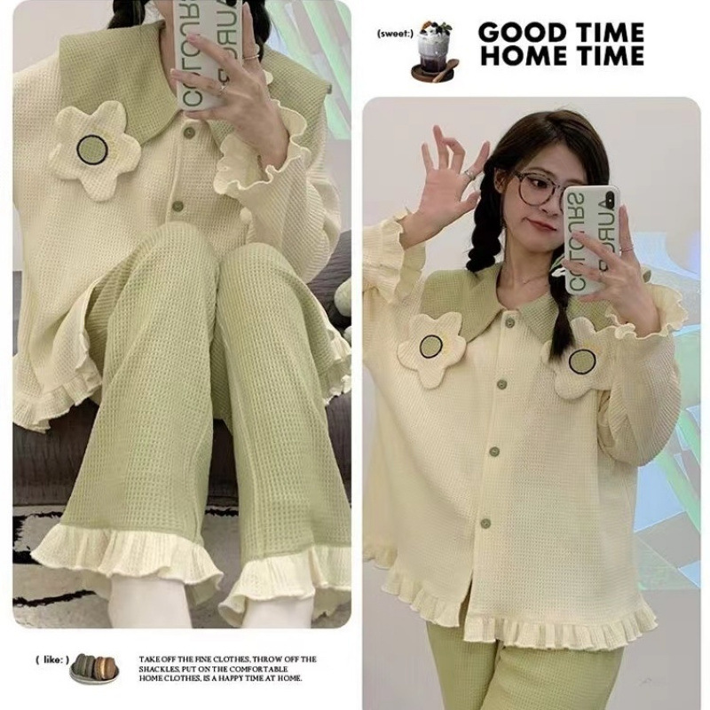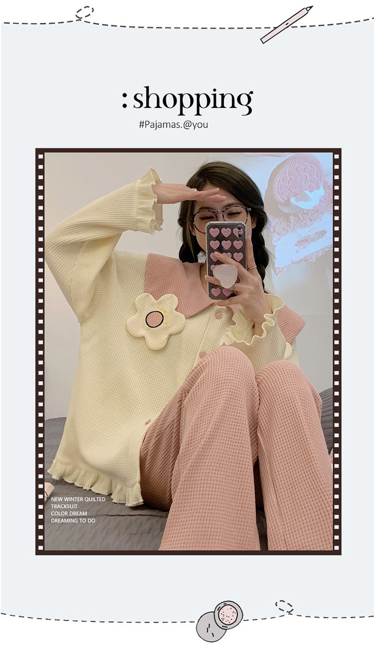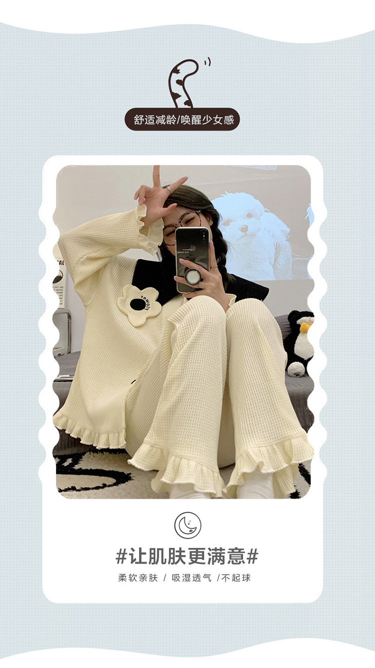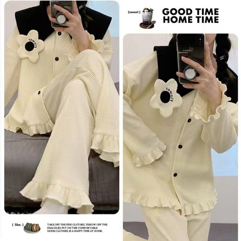Waffleshian Pajamas 여성의 봄과 가을 서양 스타일 새로운 긴 소매 사이버 인기 만화 귀여운 달콤한 겉옷 홈 세트스토어 가기