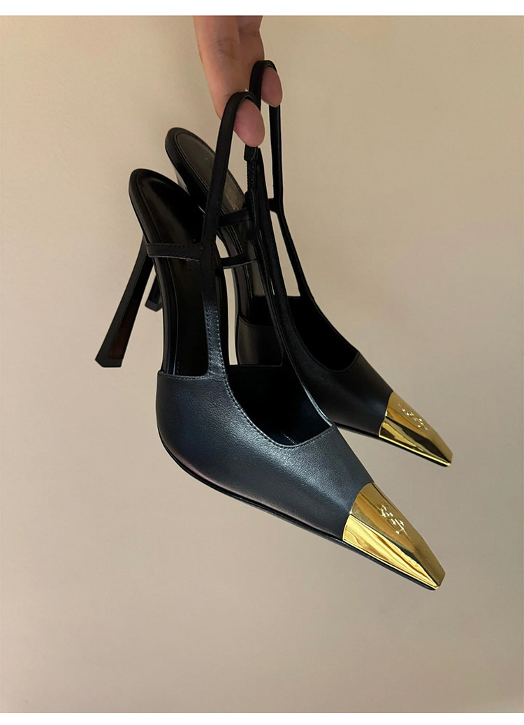 2024 년 초 가을 새로운 하이힐 신발 황금 금속 커버 발가락 스틸레토 힐로 입 뾰족한 뒤 빈 싱글 레이어 신발스토어 가기
