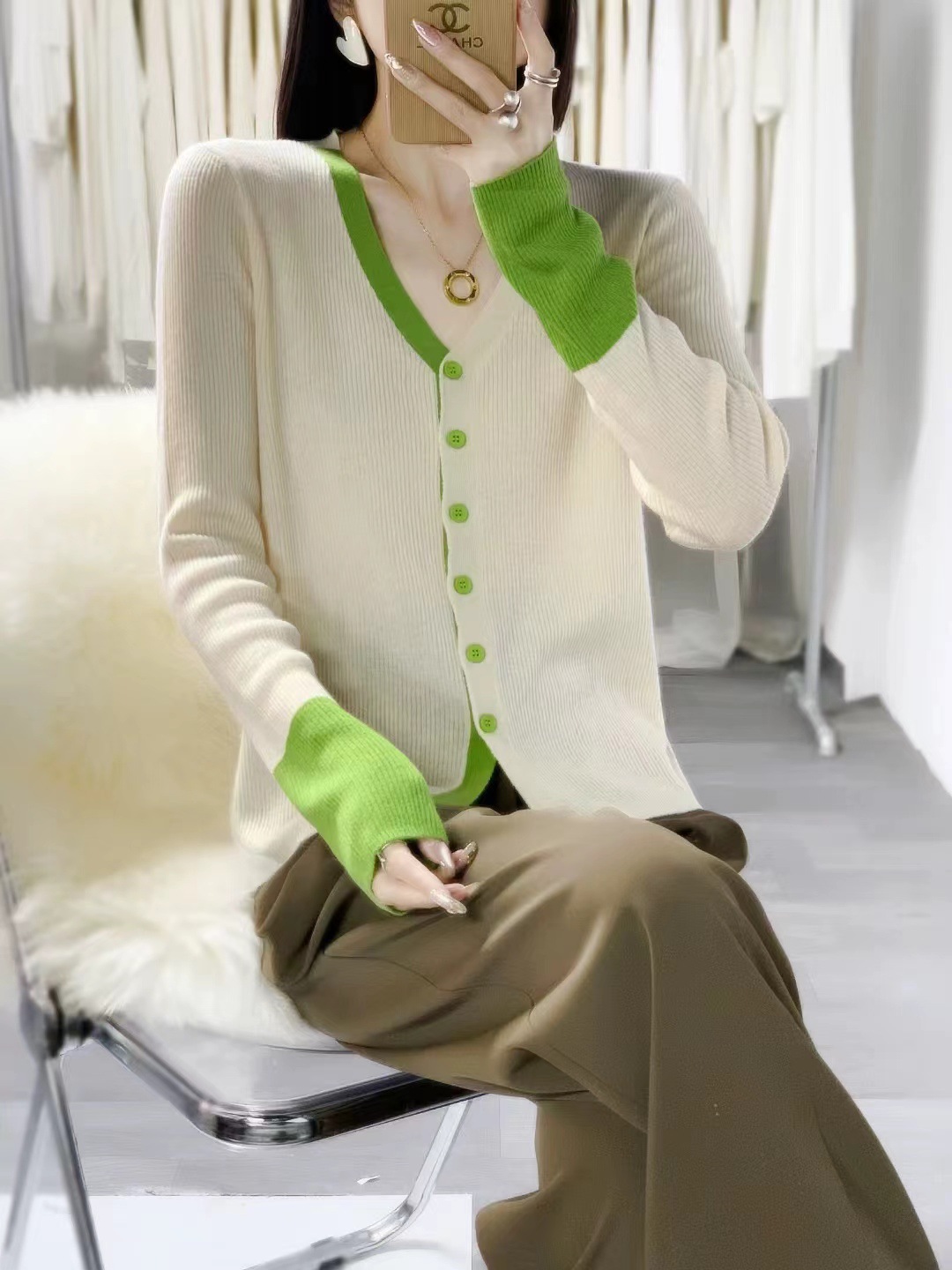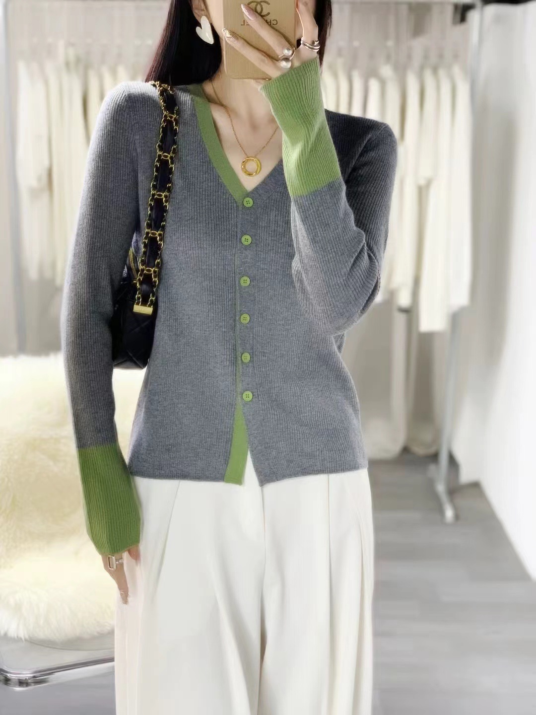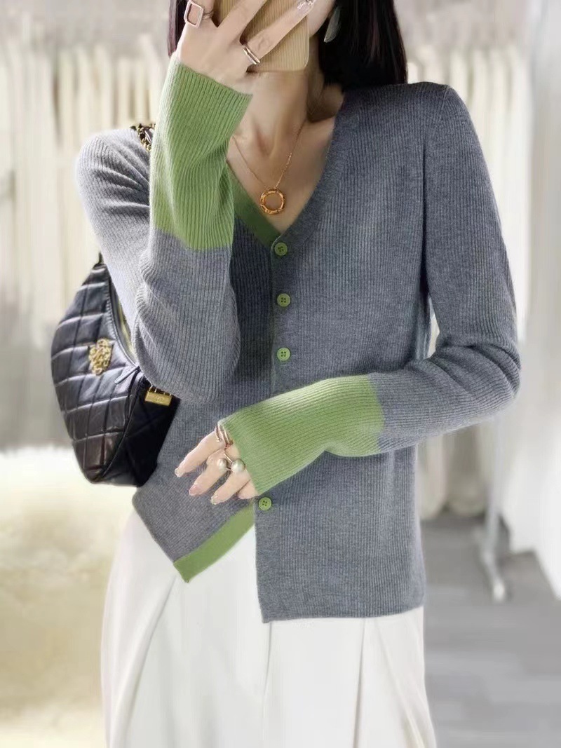 외국 스타일의 컬러 매칭 슬림 스웨터 2024 가을 새로운 수직 스트라이프 커프 v-neck 니트 카디건 얇은 탑스토어 가기