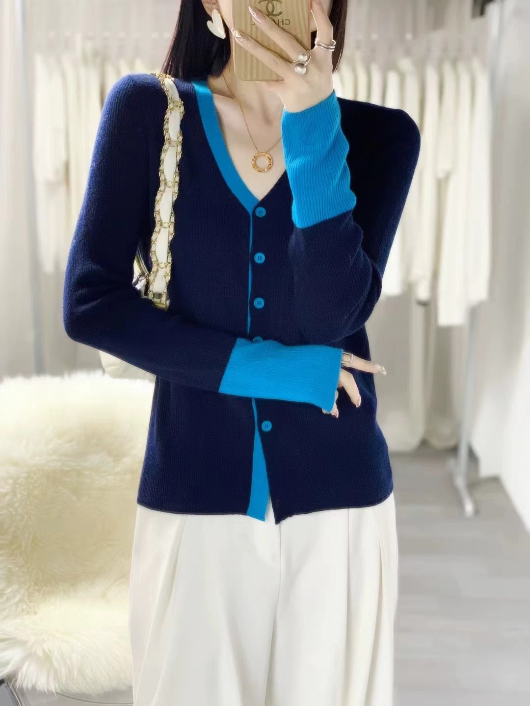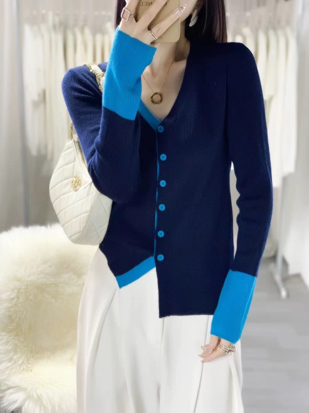 洋气百搭显瘦2024年秋新款竖条纹袖口拼色v领针织开衫薄款上衣女