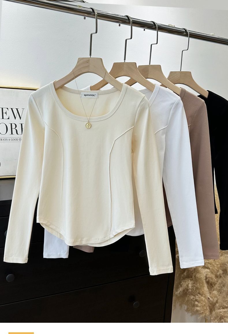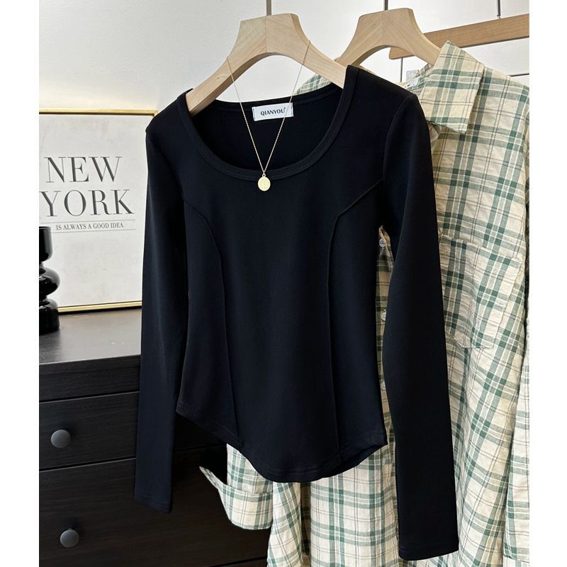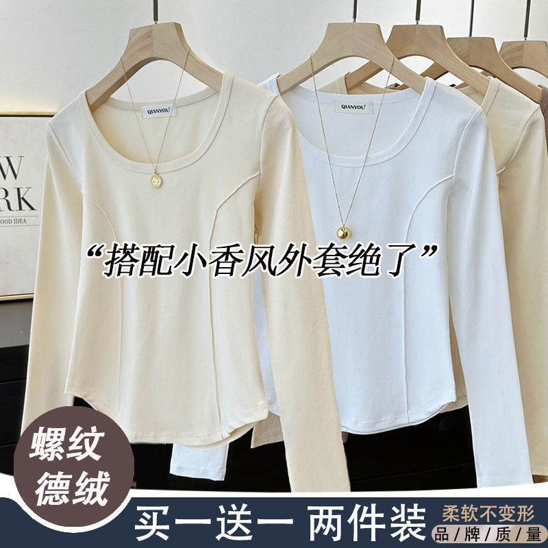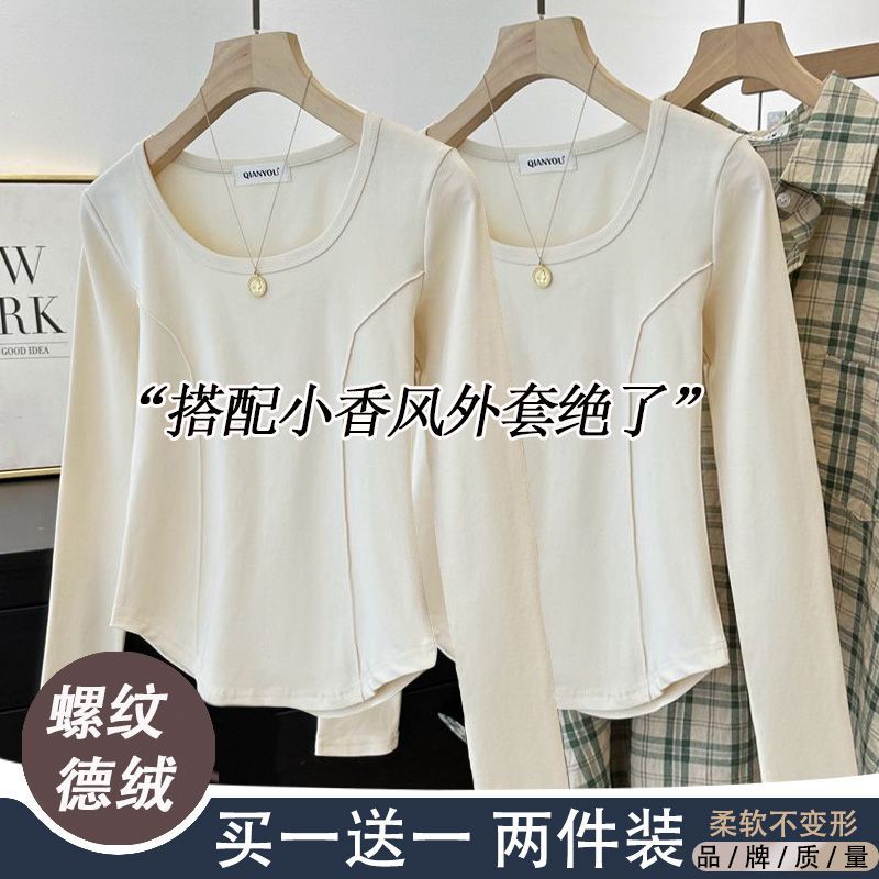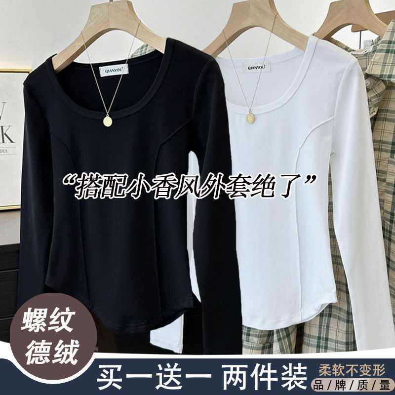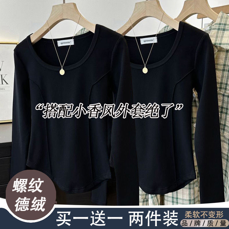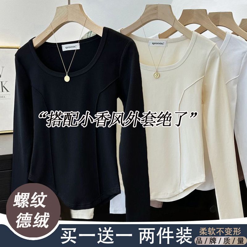 가을과 겨울 벨벳 긴팔 티셔츠 여성용 세련된 순수한 욕망 따뜻한 내부 광장 목걸이 생선 뼈 타이트베이스 셔츠 슬림 핏스토어 가기