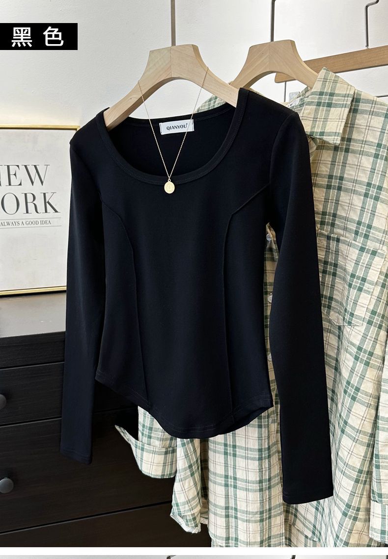 가을과 겨울 벨벳 긴팔 티셔츠 여성용 세련된 순수한 욕망 따뜻한 내부 광장 목걸이 생선 뼈 타이트베이스 셔츠 슬림 핏