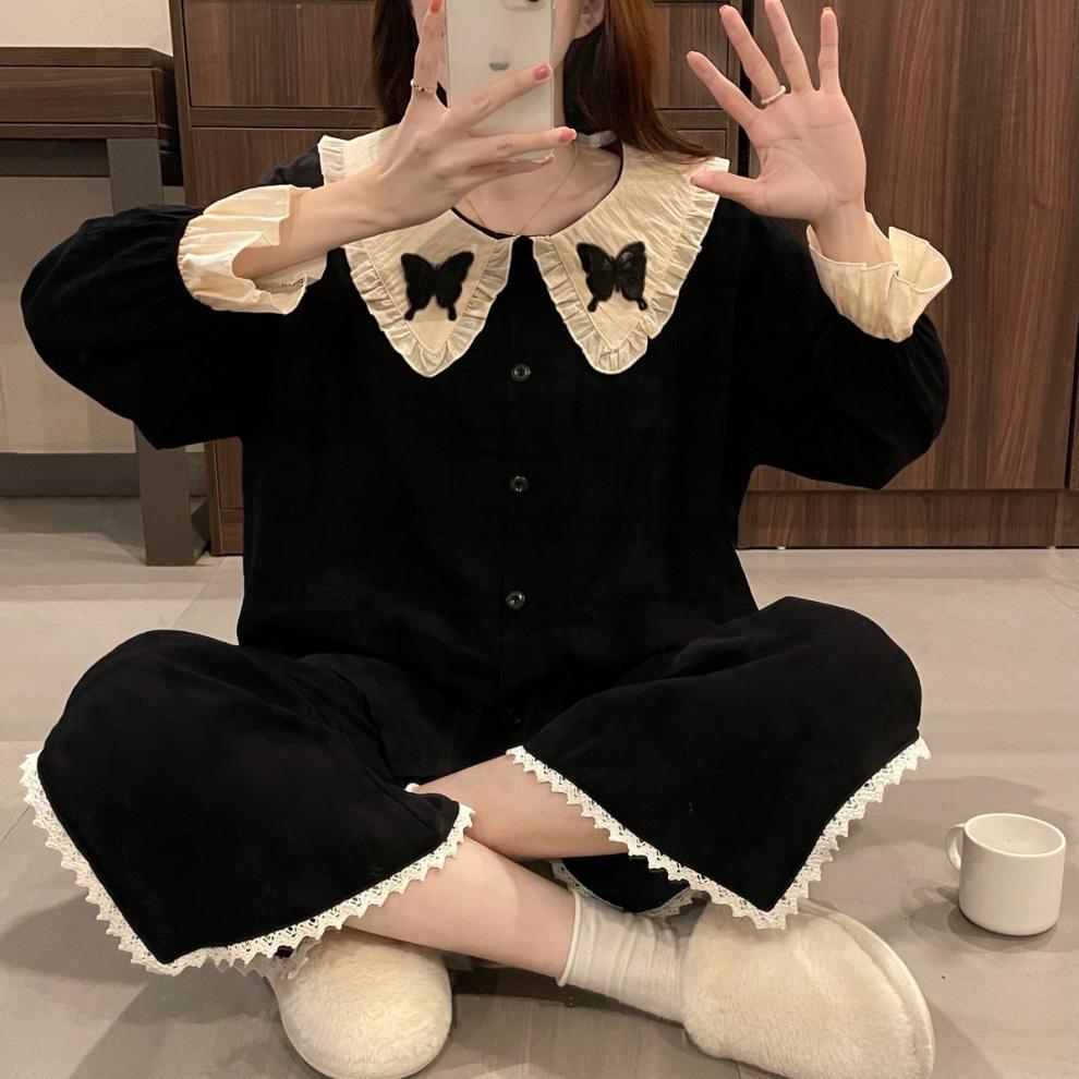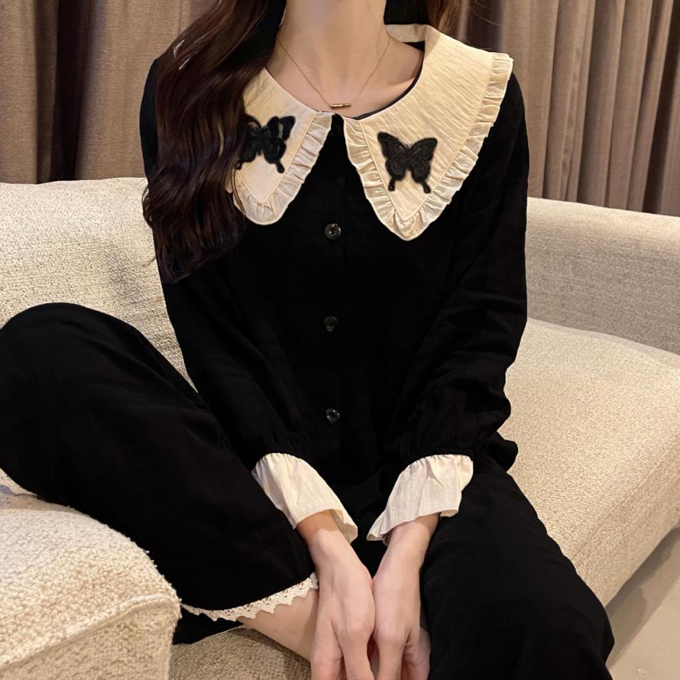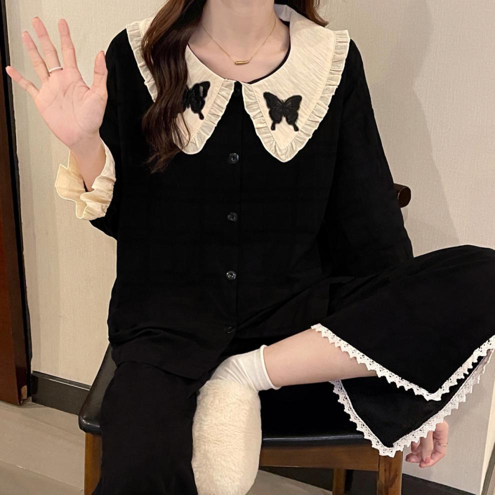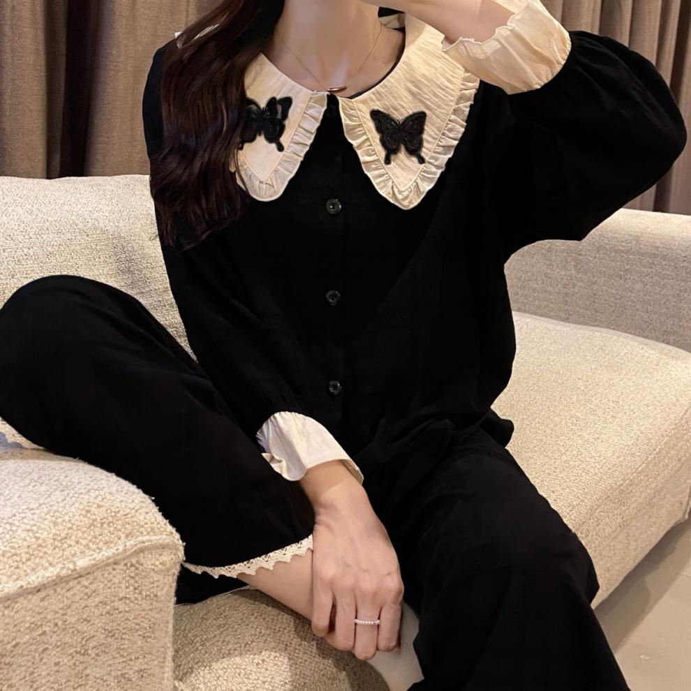 간단한 나비 긴 소매 잠옷 여성의 캐주얼 봄 가을과 여름 2023 새로운 검은 집 옷 바지 세트 입을 수 있습니다
