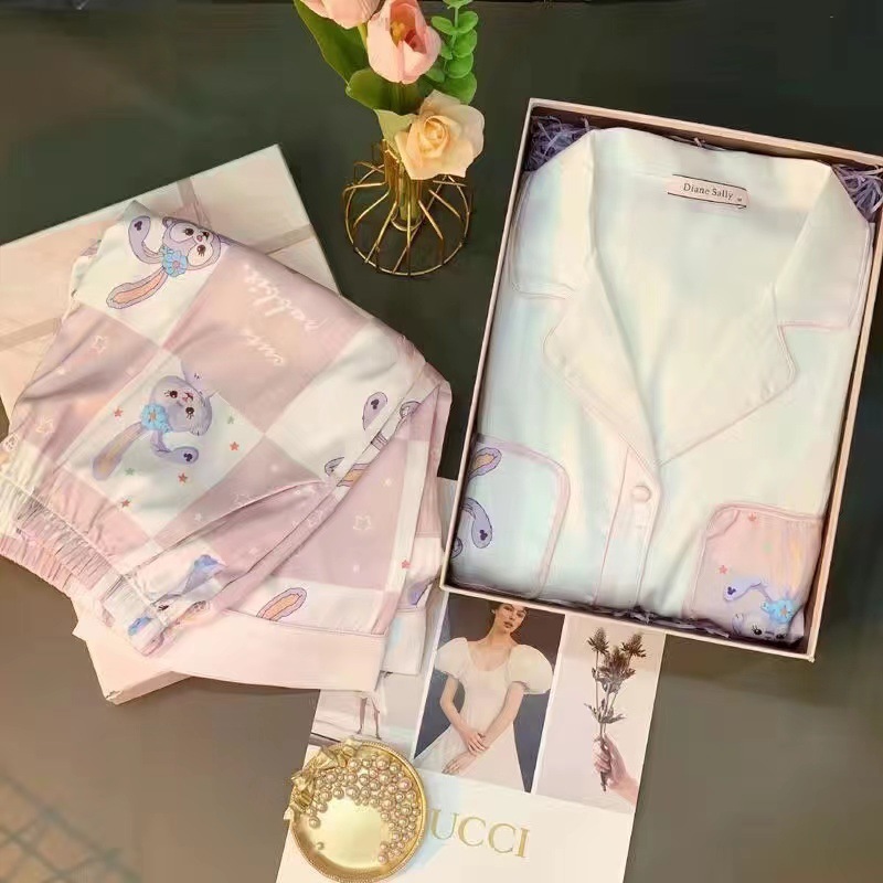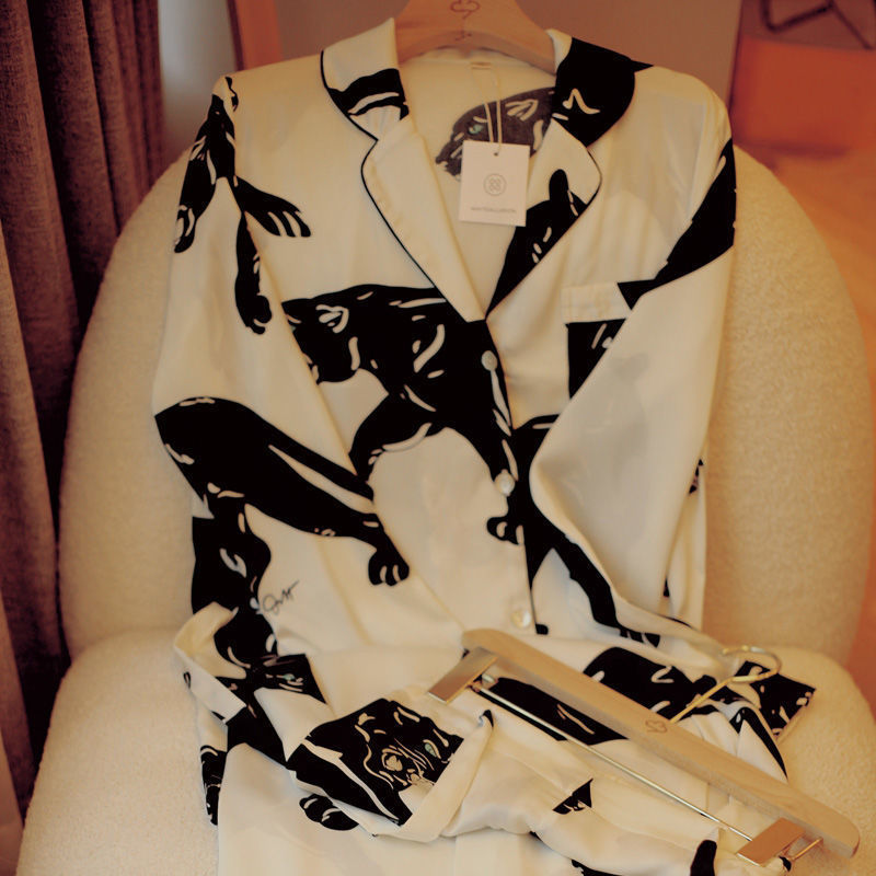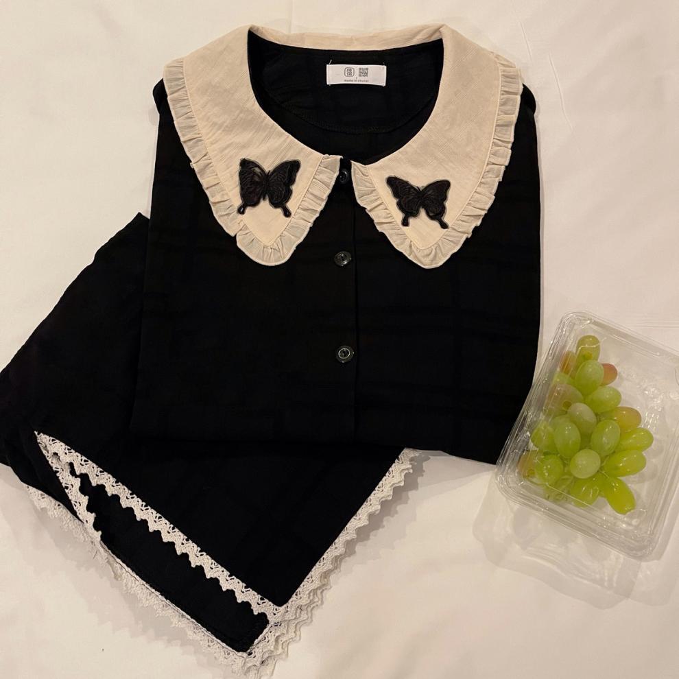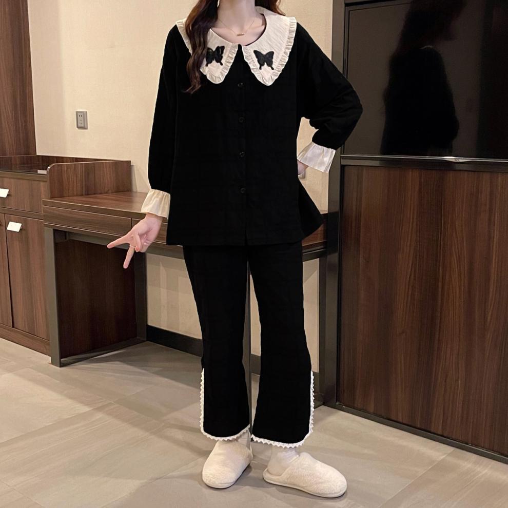 간단한 나비 긴 소매 잠옷 여성의 캐주얼 봄 가을과 여름 2023 새로운 검은 집 옷 바지 세트 입을 수 있습니다