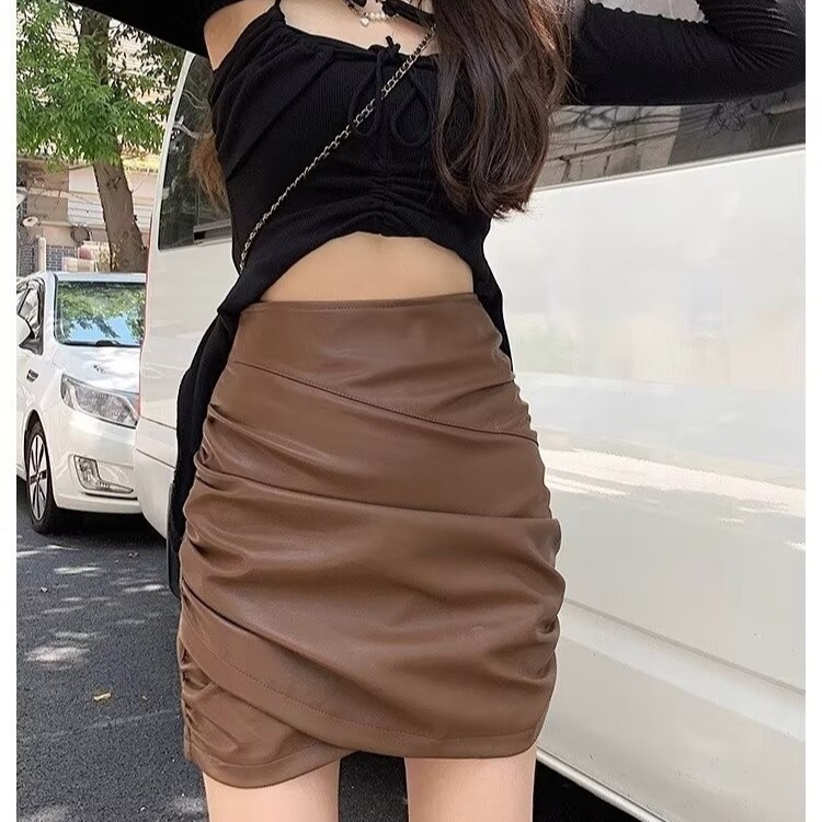 플러스 사이즈 불규칙한 검은 가죽 치마 가을과 겨울 통통녀 주름진 배꼽 덮음 슬리밍 높은 허리 A 라인 엉덩이 절반 길이 짧은 치마