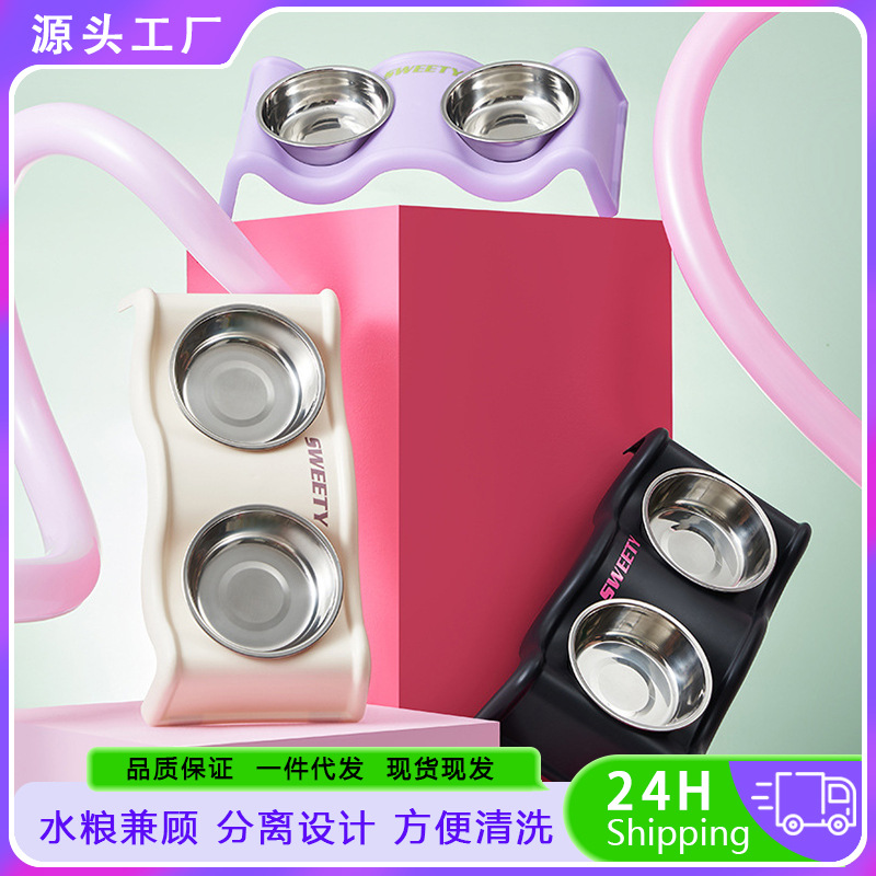 애완 동물 스테인레스 스틸 더블 보울 미끄럼 방지 노크 도그 보울 웨이브 모양의 더블 보울 높이 추가 고양이 먹이 물 피더스토어 가기
