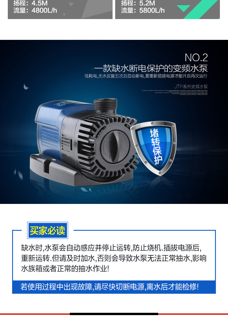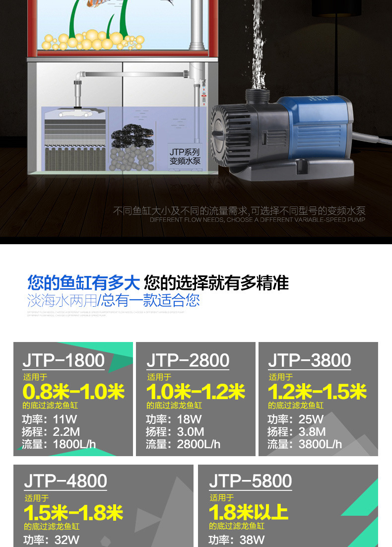 JTP 가변 주파수 워터 펌프 잠수정 펌프 물고기 탱크 수족관 펌핑 순환 펌프 음소거 전력 절약 JTP-1800