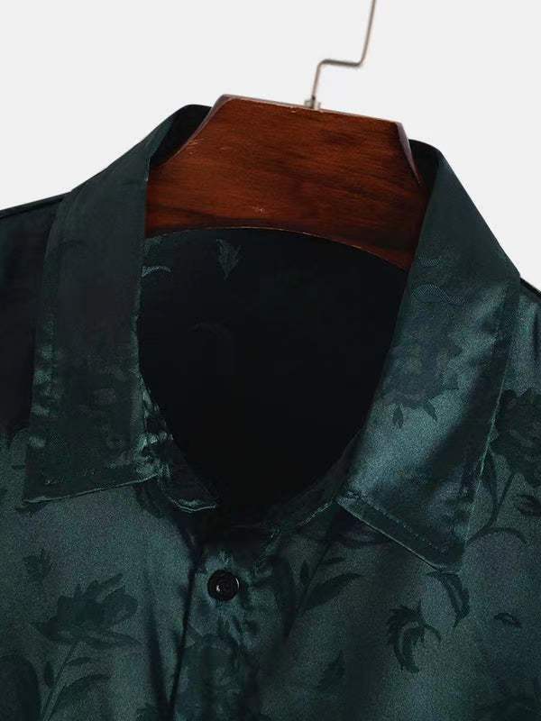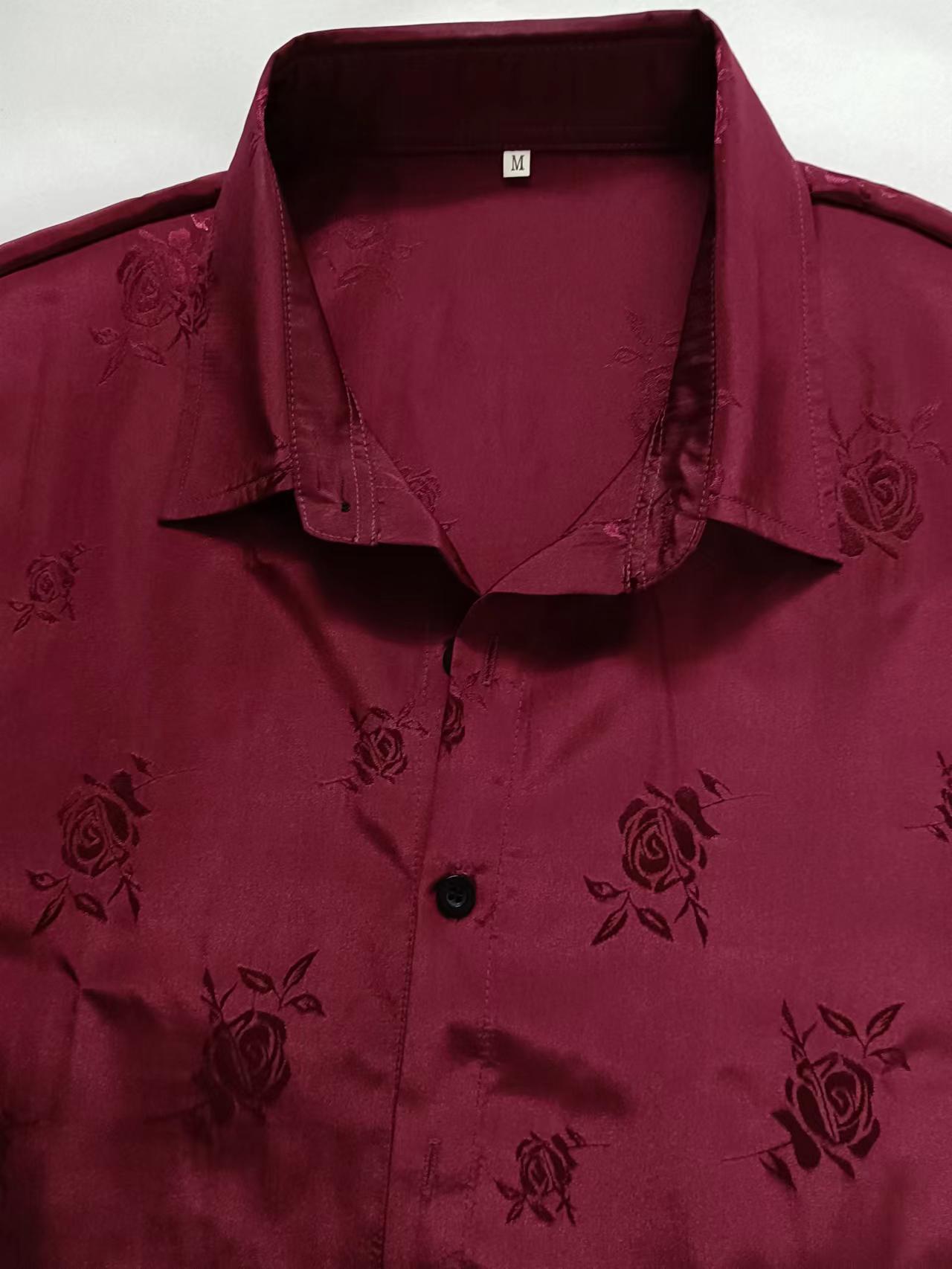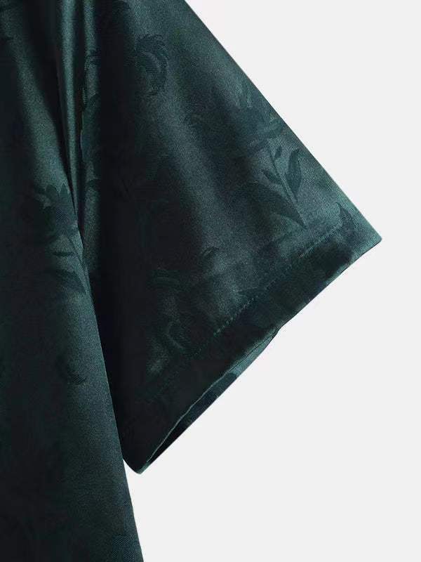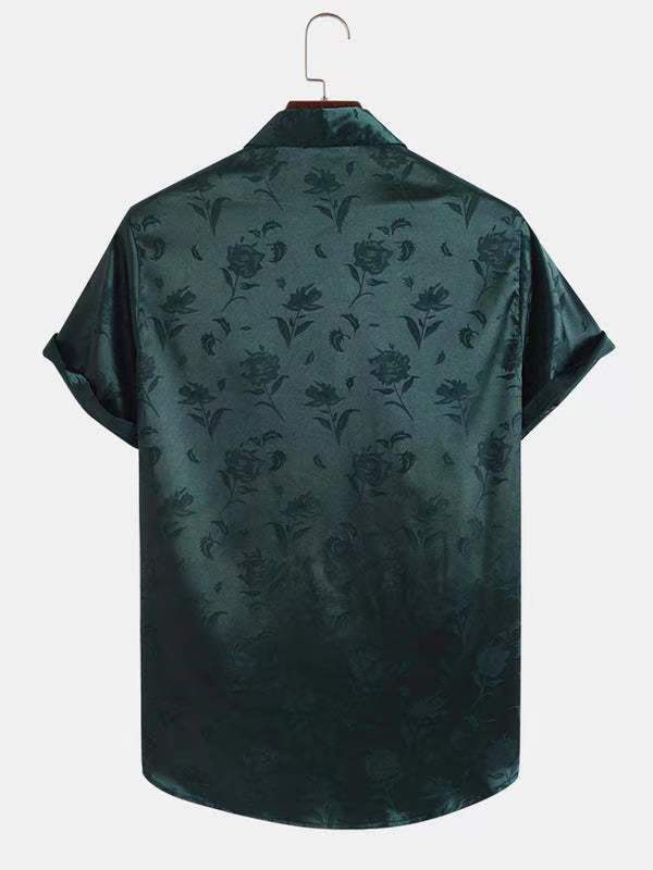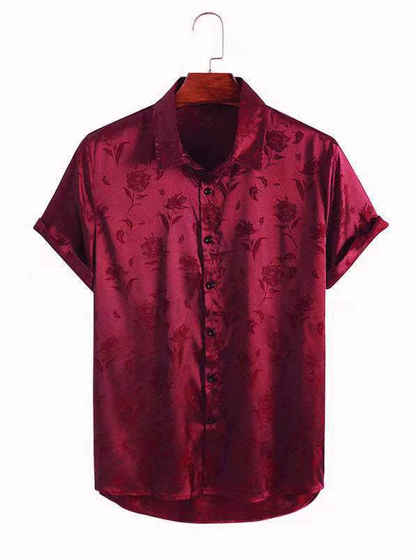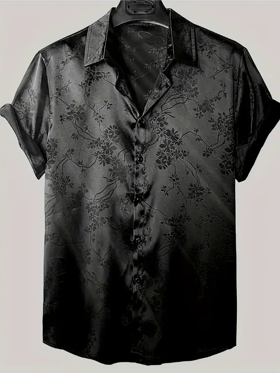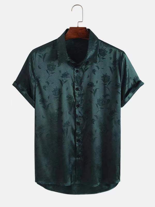2023년 크로스보더 아마존 남성용 반팔 셔츠, 새틴 자카드 라펠 버튼, 남성 캐주얼 만능 셔츠, 여름 전용