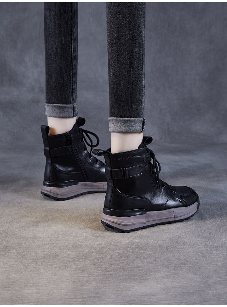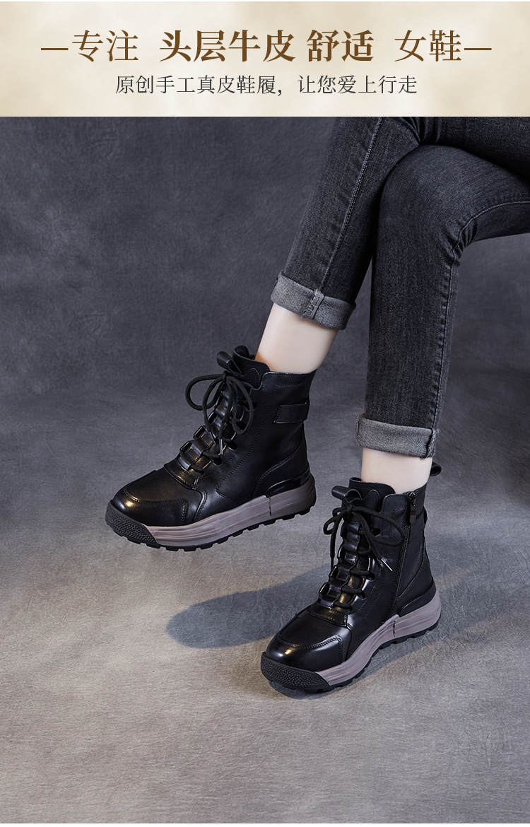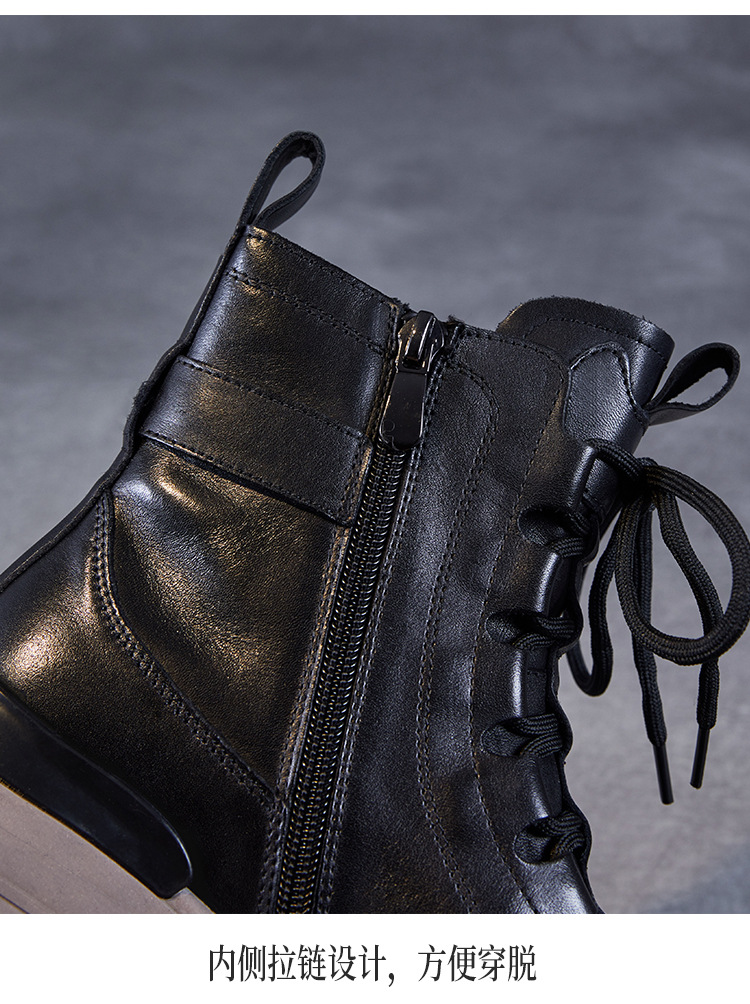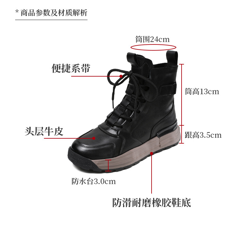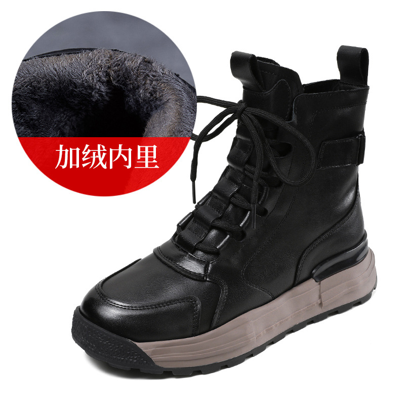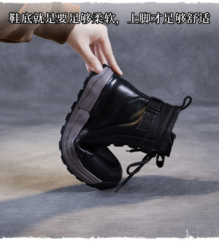 패션 1 층 소 가죽 레이스 업 부드러운 바닥 싱글 부츠 24 가을과 겨울 새로운 평면 두꺼운 바닥 마틴 부츠 캐주얼 기모 여성 신발