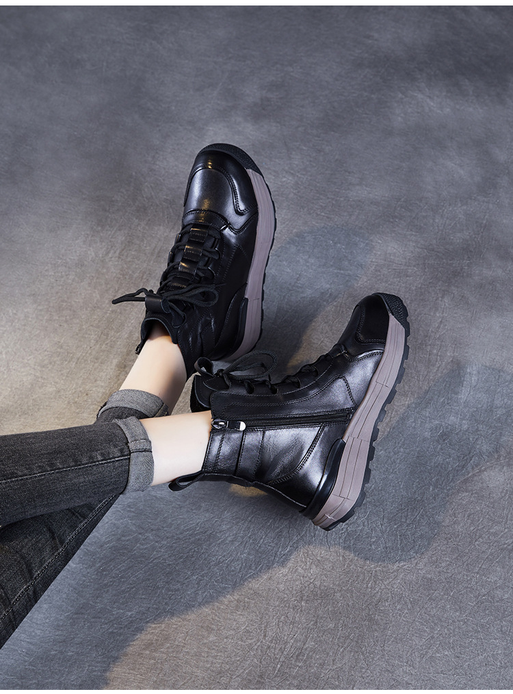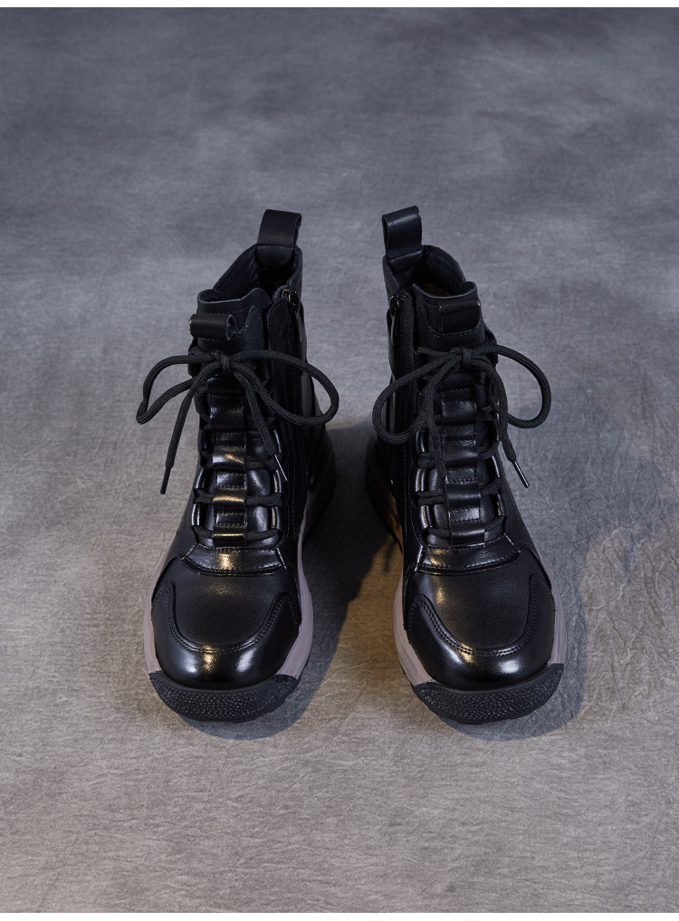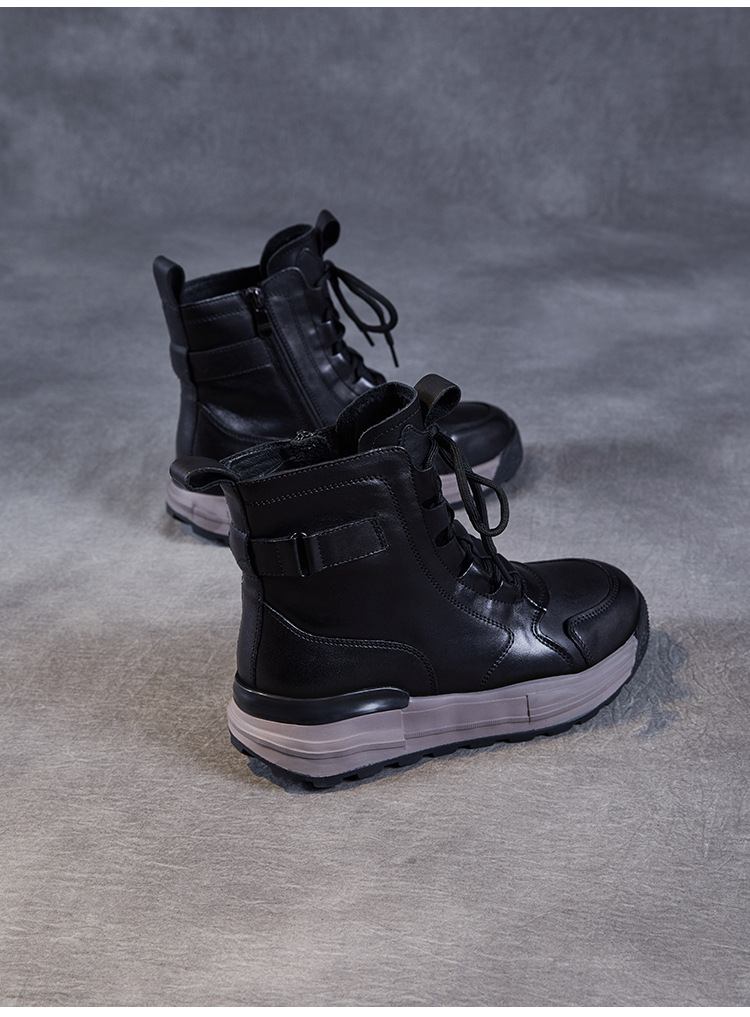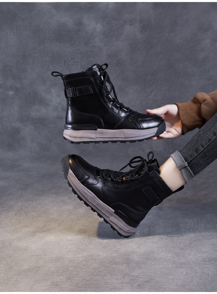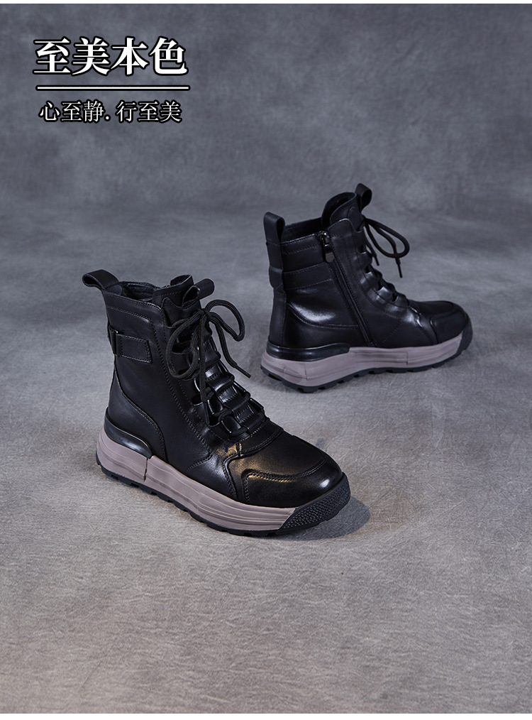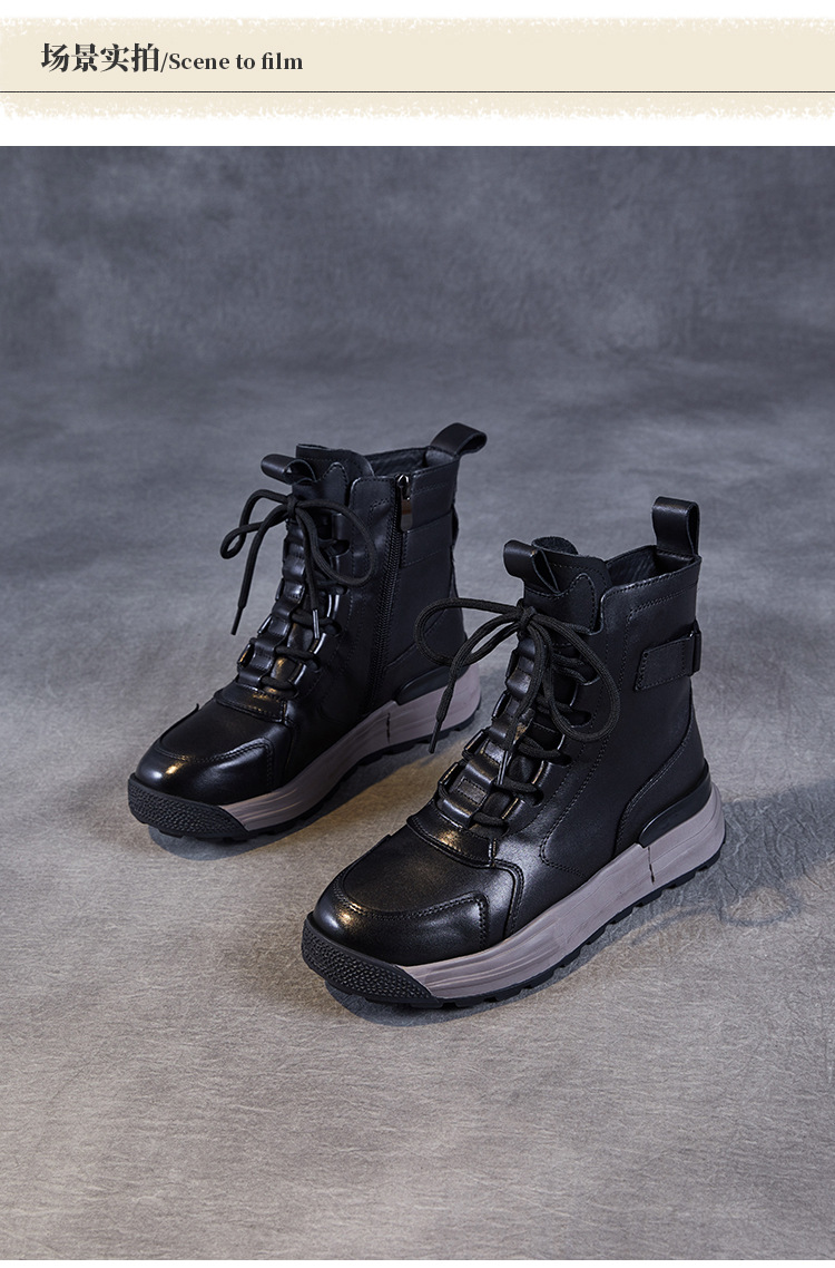패션 1 층 소 가죽 레이스 업 부드러운 바닥 싱글 부츠 24 가을과 겨울 새로운 평면 두꺼운 바닥 마틴 부츠 캐주얼 기모 여성 신발