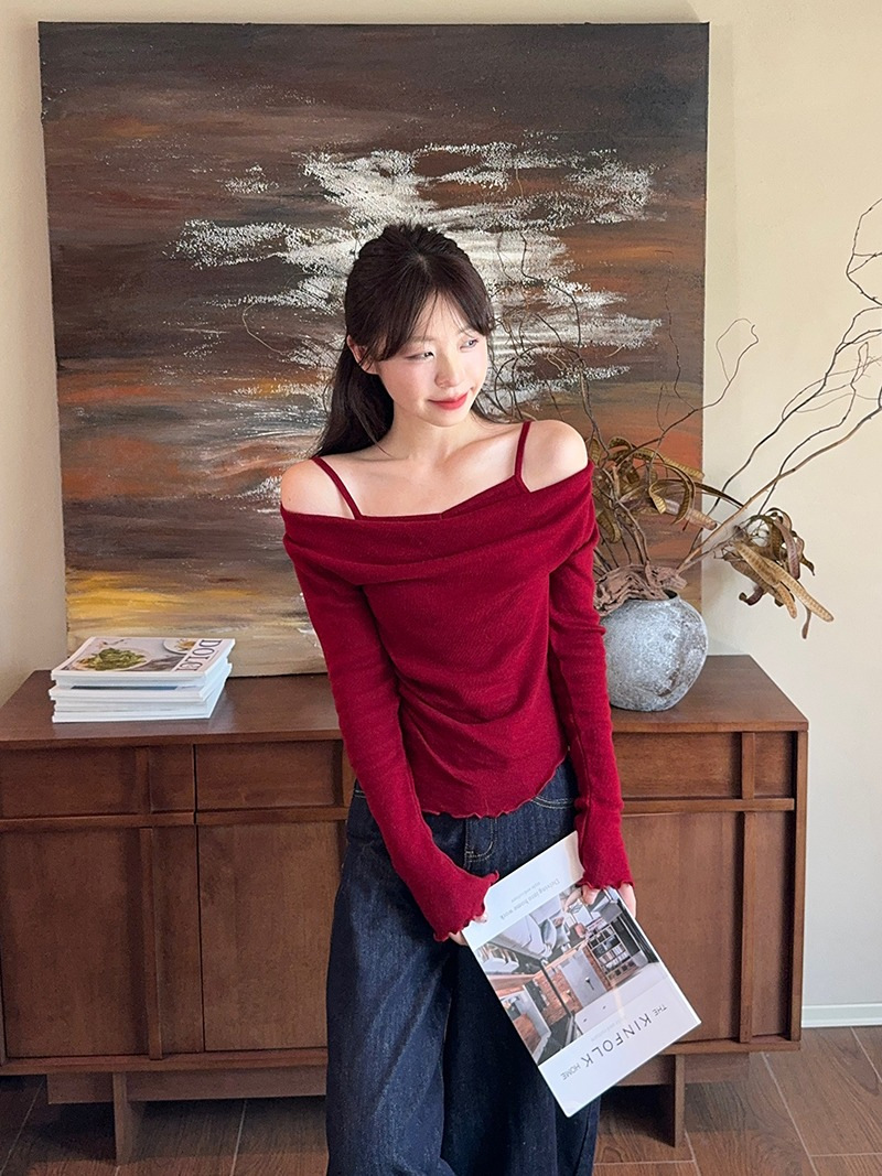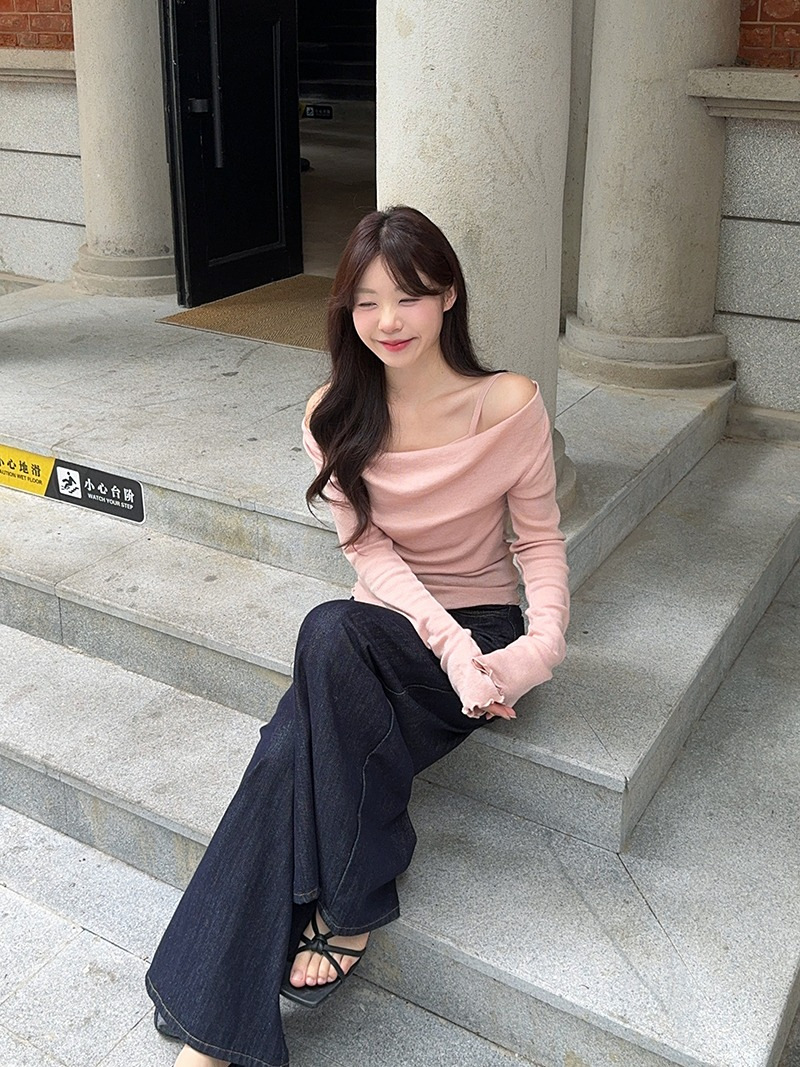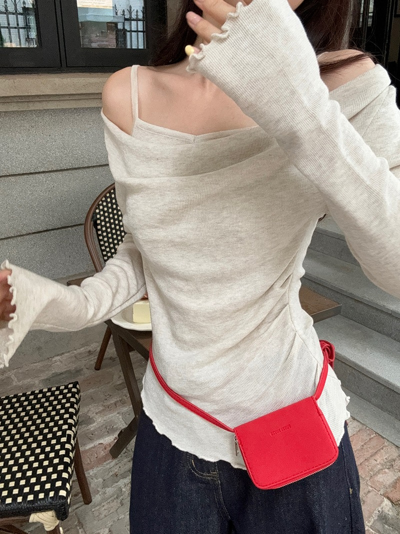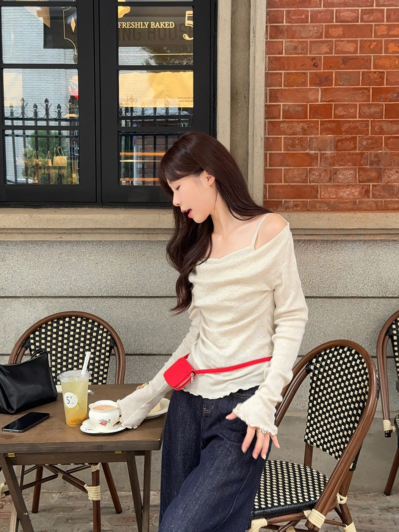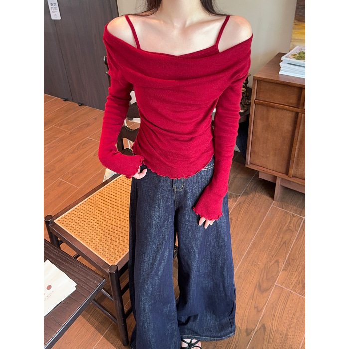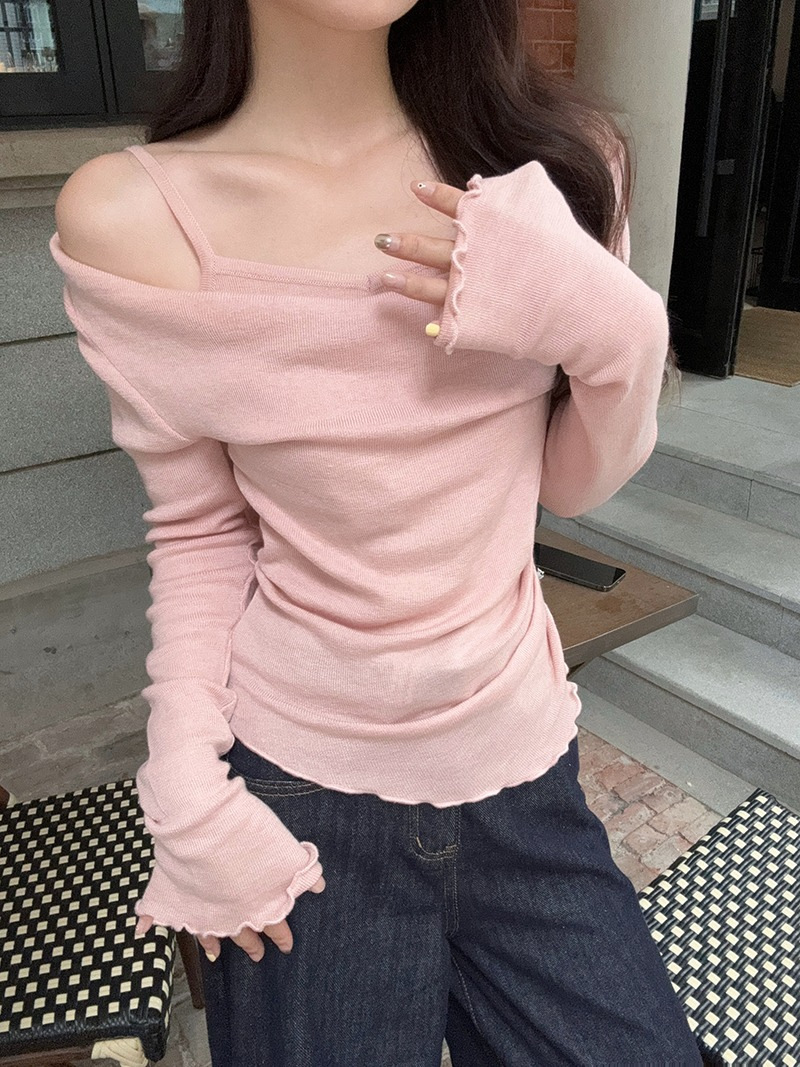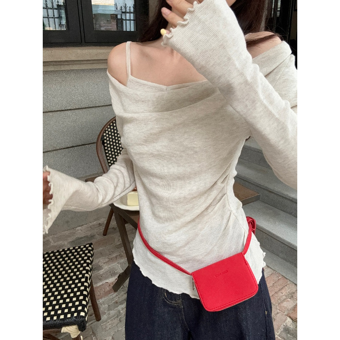 가을 곰팡이 밑단 밑단 탑, 페이크 투피스 디자인, 스플라이스 벨 슬리브, 오프 숄더 긴팔 스웨터, 여성용 한 단어