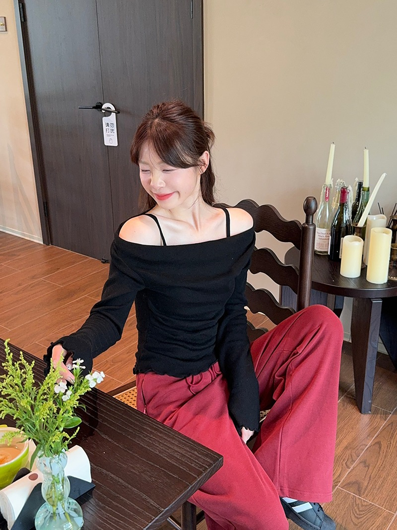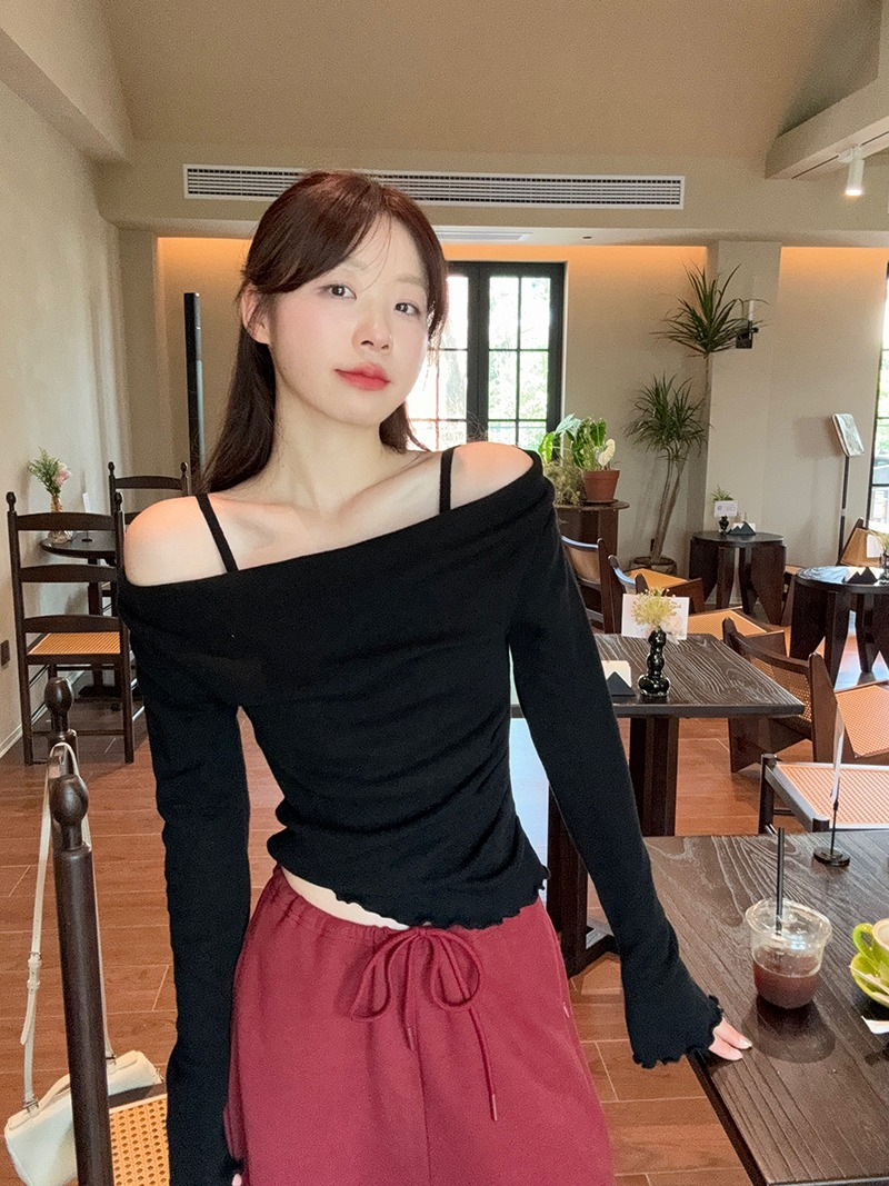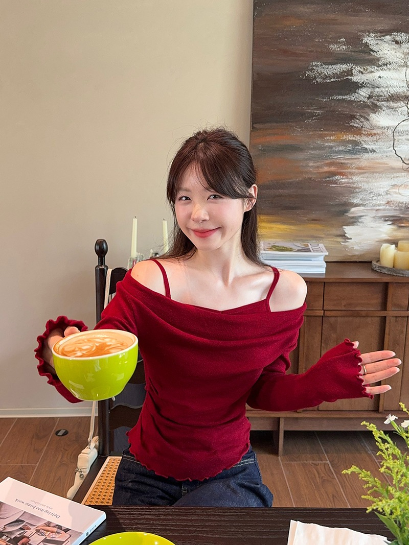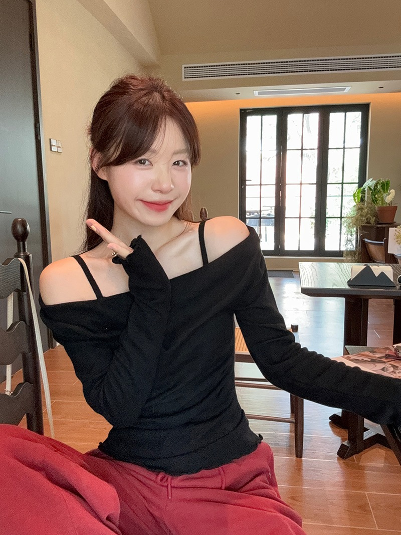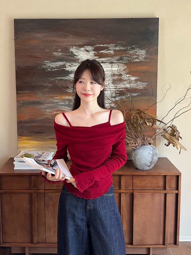 가을 곰팡이 밑단 밑단 탑, 페이크 투피스 디자인, 스플라이스 벨 슬리브, 오프 숄더 긴팔 스웨터, 여성용 한 단어