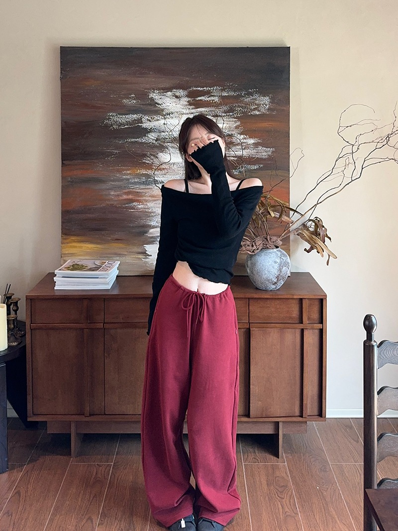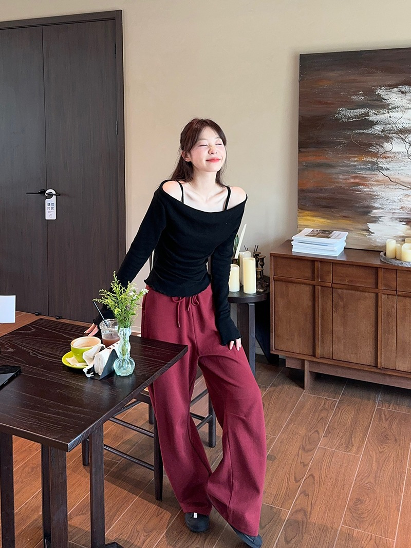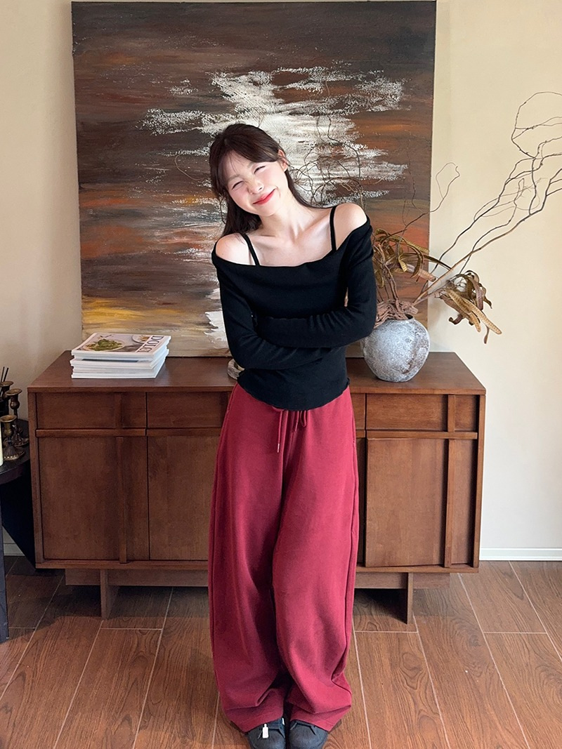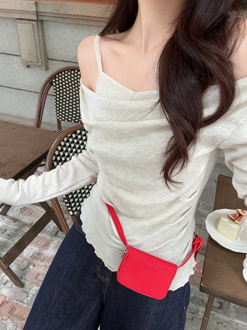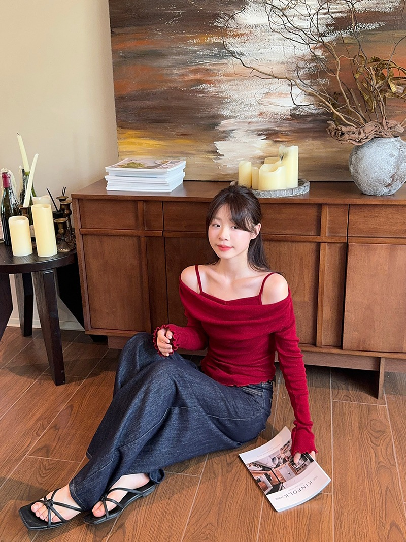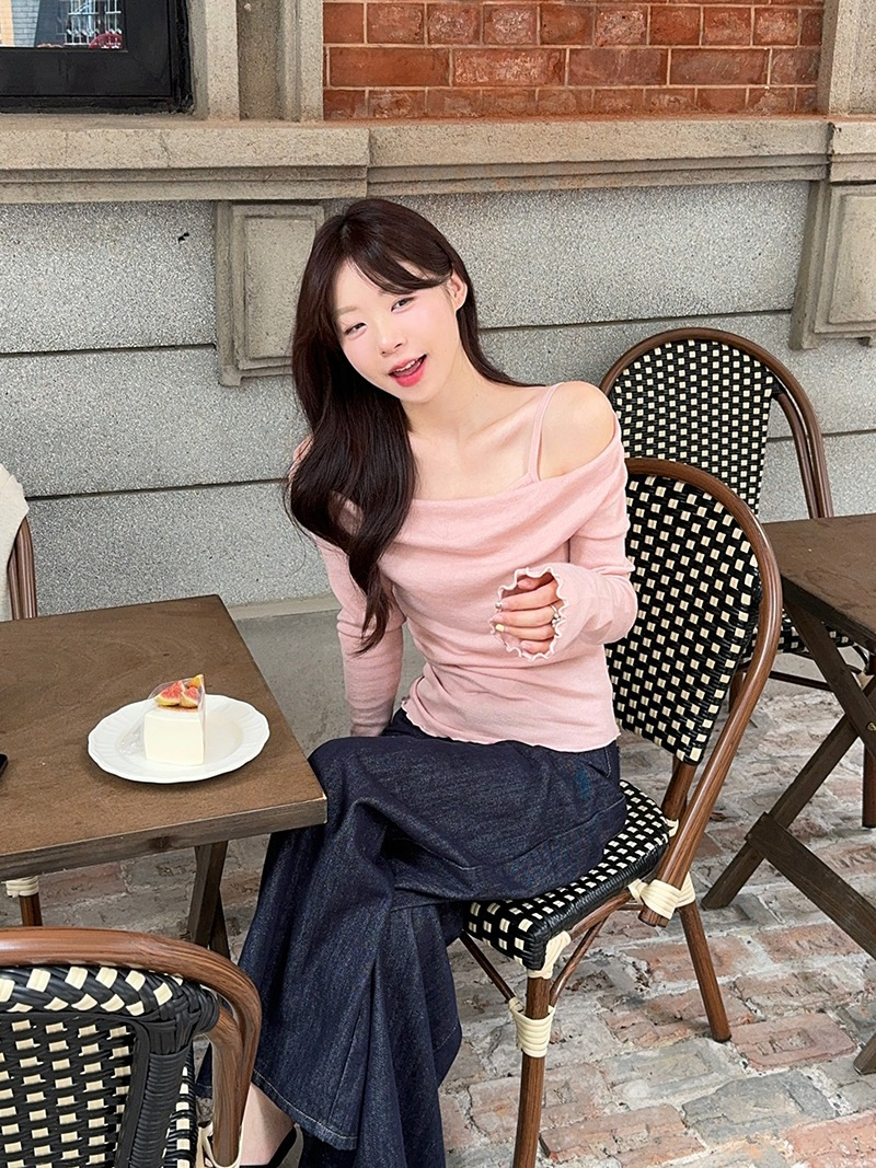 가을 곰팡이 밑단 밑단 탑, 페이크 투피스 디자인, 스플라이스 벨 슬리브, 오프 숄더 긴팔 스웨터, 여성용 한 단어
