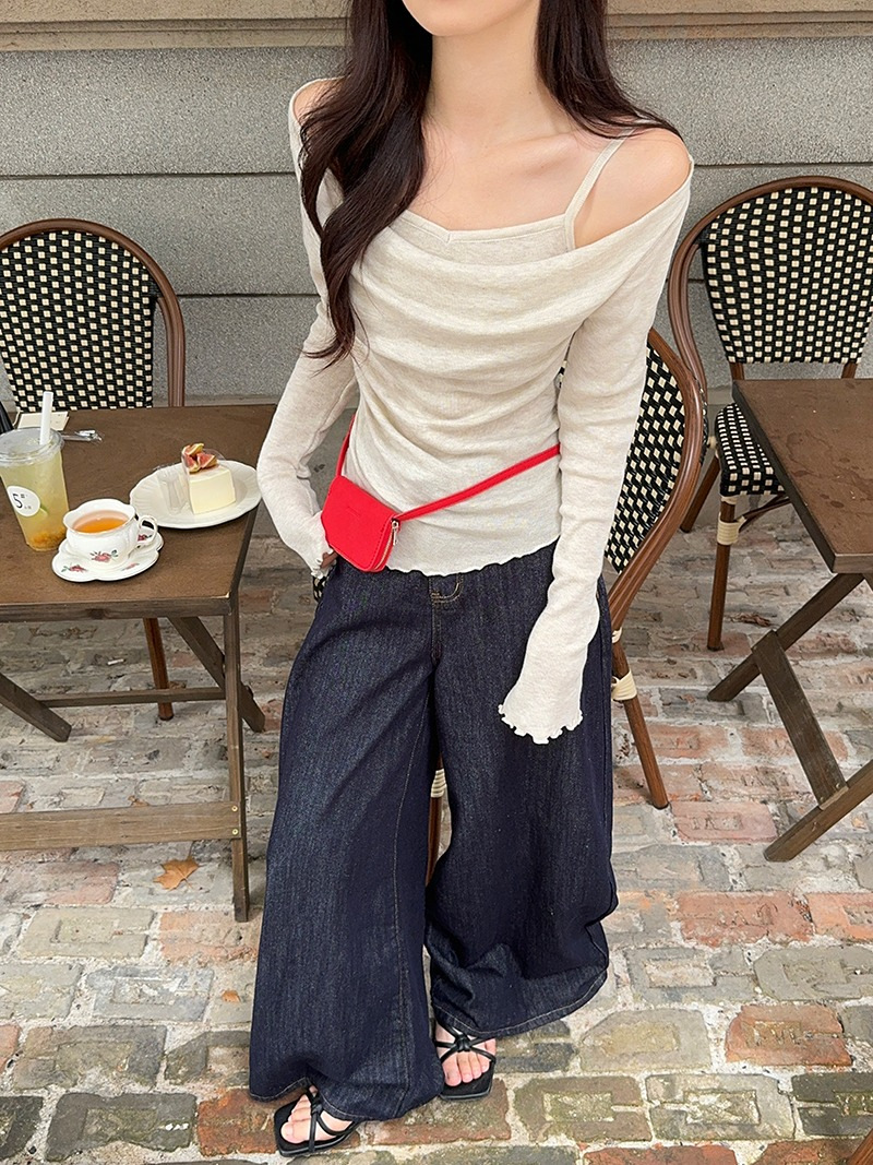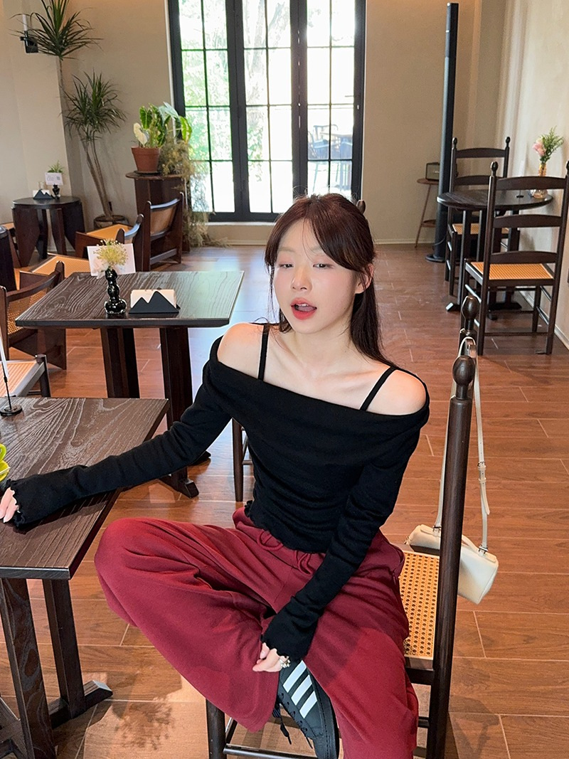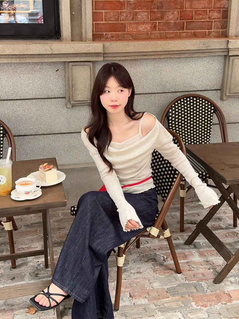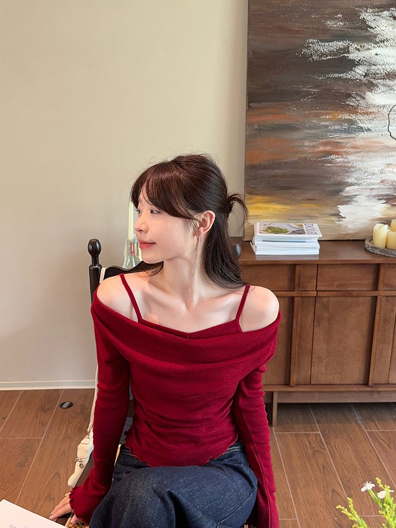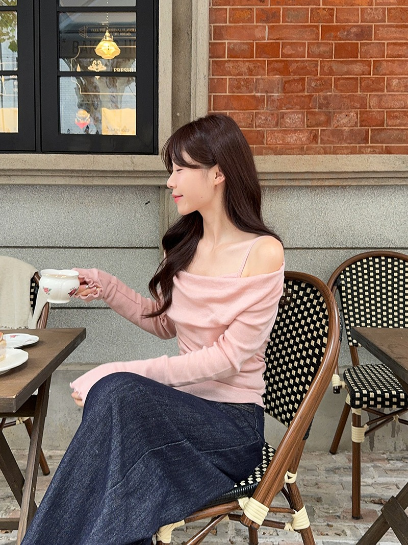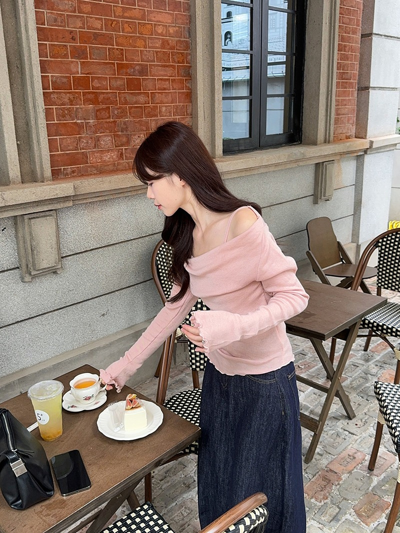 가을 곰팡이 밑단 밑단 탑, 페이크 투피스 디자인, 스플라이스 벨 슬리브, 오프 숄더 긴팔 스웨터, 여성용 한 단어스토어 가기