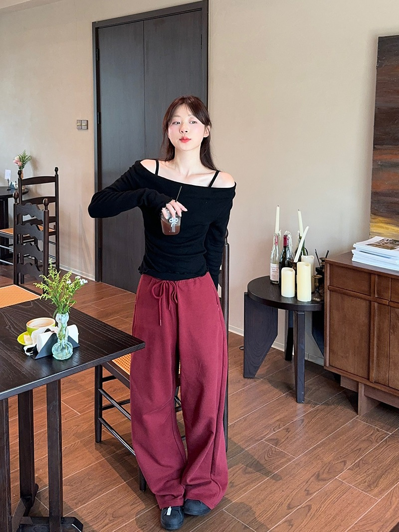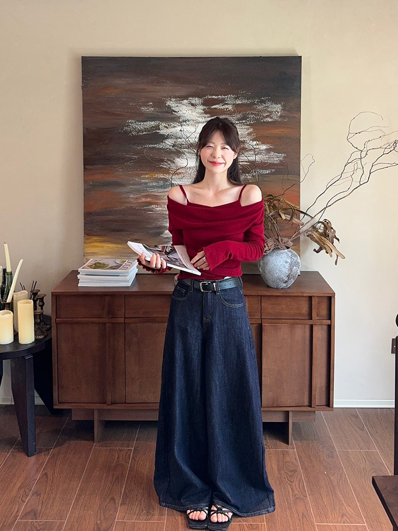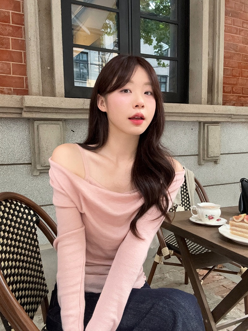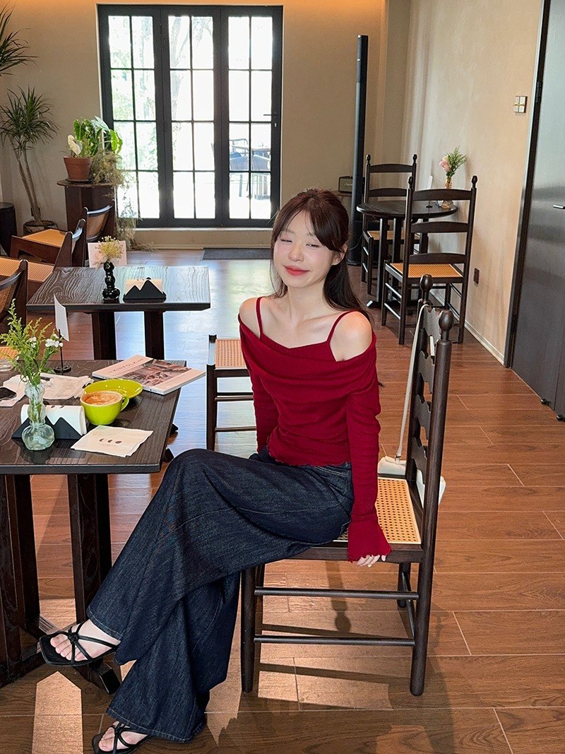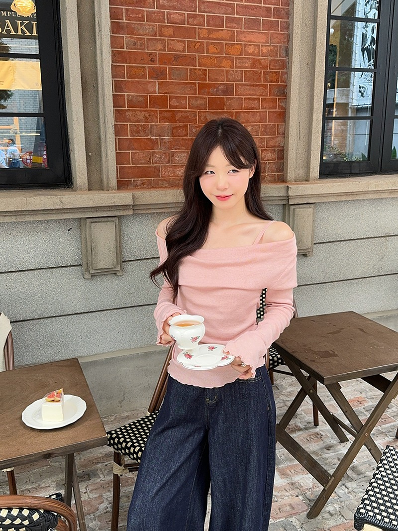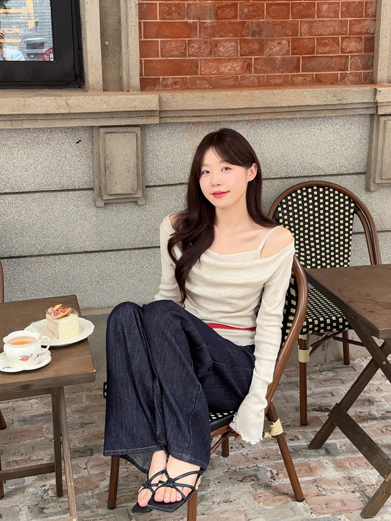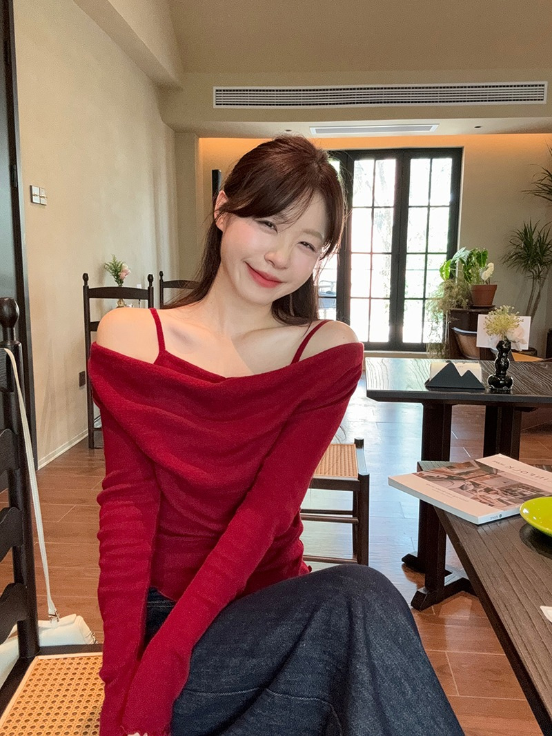 가을 곰팡이 밑단 밑단 탑, 페이크 투피스 디자인, 스플라이스 벨 슬리브, 오프 숄더 긴팔 스웨터, 여성용 한 단어스토어 가기