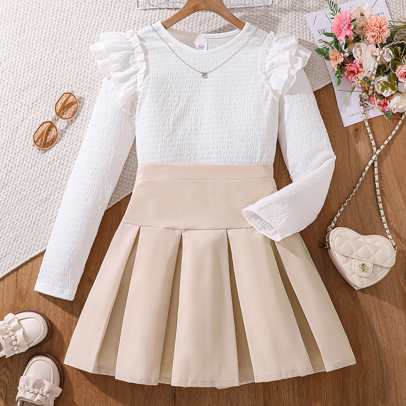 아마존 유럽과 미국의 가을 새로운 대형 어린이 레이스 긴 소매 탑 짧은 스커트 여성 아동복 아마존 2 피스 세트