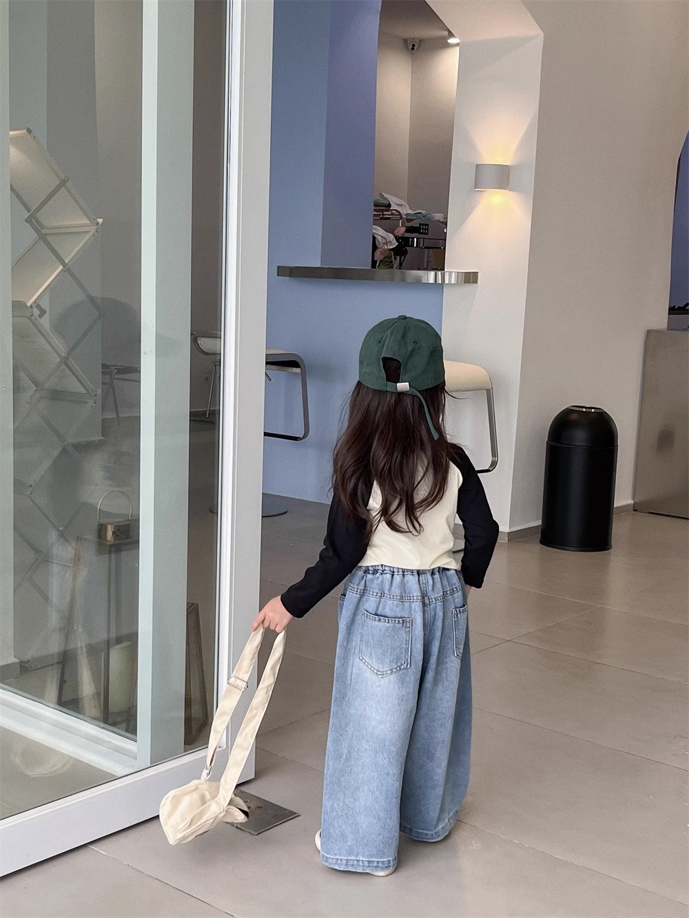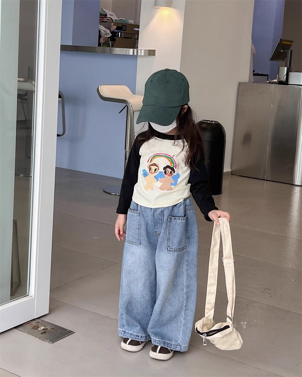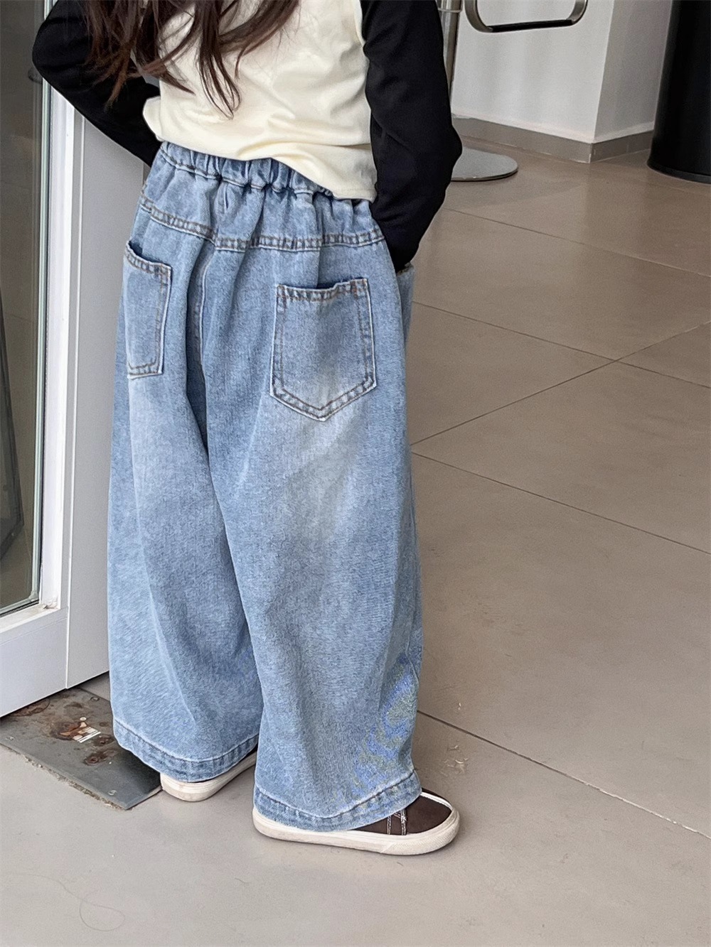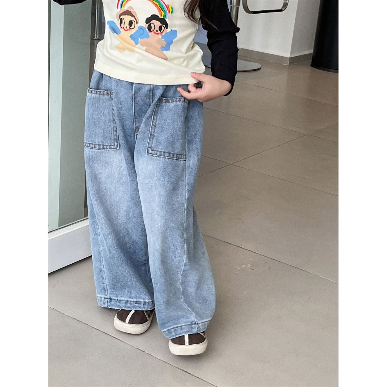 [신간] 어린이 대형 포켓 데님 넓은 다리 바지 봄 · 가을 여아 느슨한 캐주얼 바지 아기 한국식 스트레이트스토어 가기