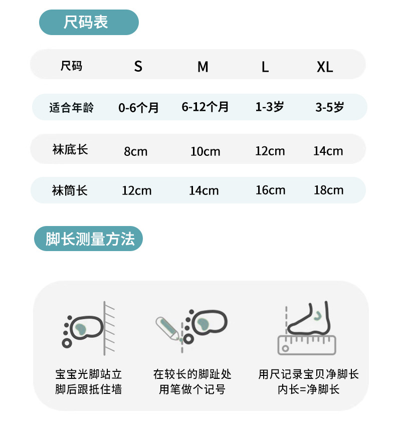 • S 0~6개월 권장 (양말 밑창 길이 약 8cm)