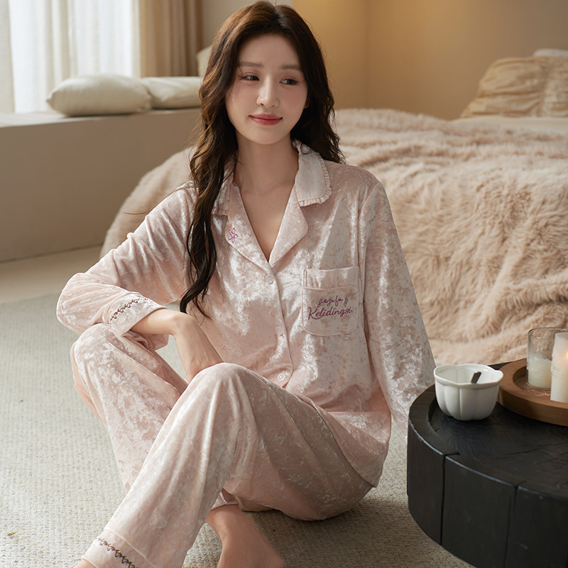 고급 동백 황금 벨벳 커플 잠옷 남자와 여자의 긴 소매 따뜻한 가을과 겨울 카디건 홈 의류 세트스토어 가기