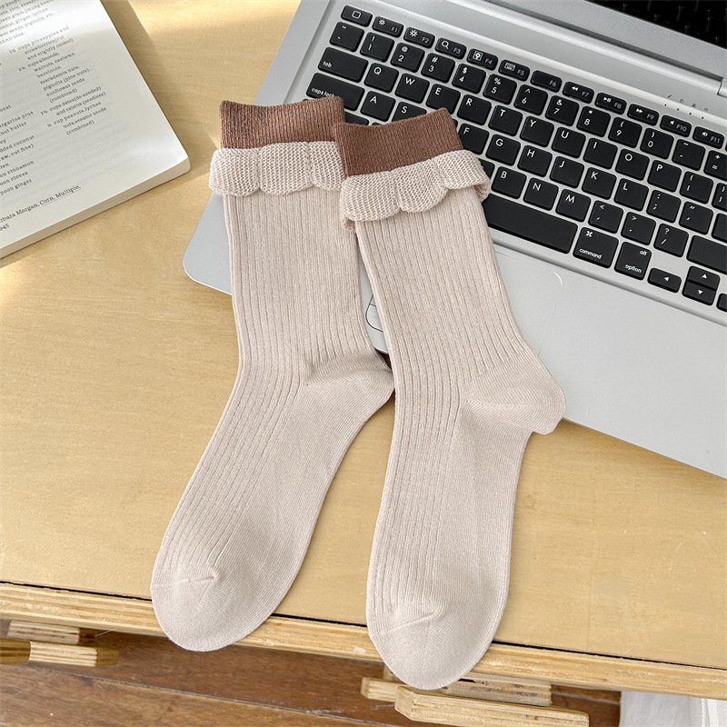 유럽 여성 양말 2024 가을과 겨울 새로운 그물 버전 더블 레이어 양말 입 곰팡이 레이스 컬러 매칭 작은 더미 양말스토어 가기