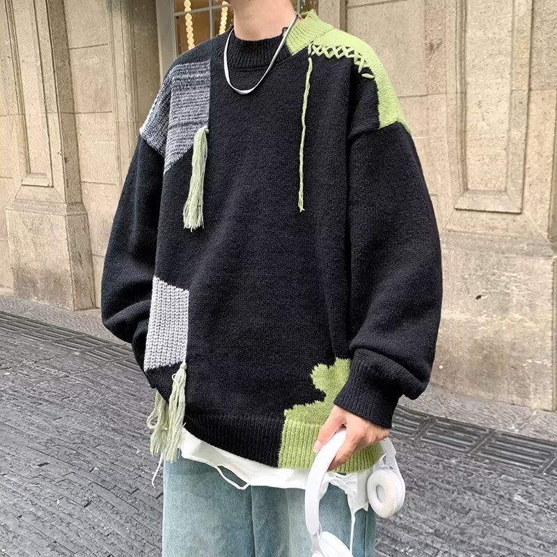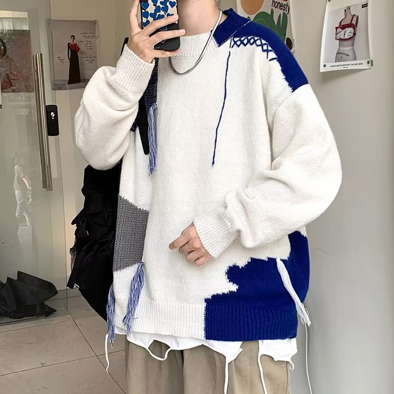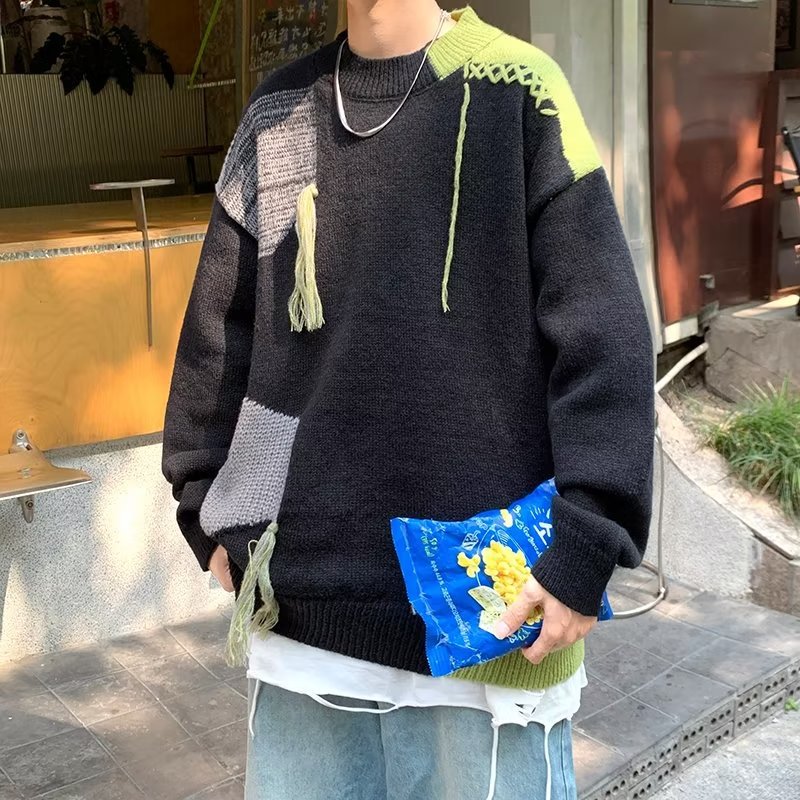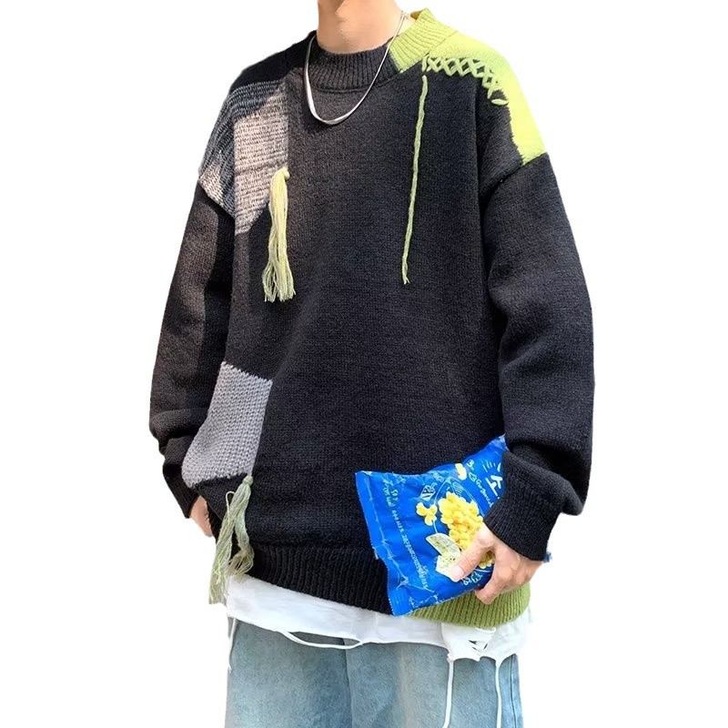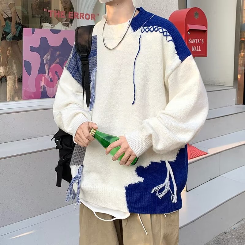 콘트라스트 컬러 디자인 센스 스웨터 남자의 가을과 겨울 Ins 트렌디 한 느슨한 홍콩 스타일 우아한 라운드 넥 커플을위한 독특한 스웨터