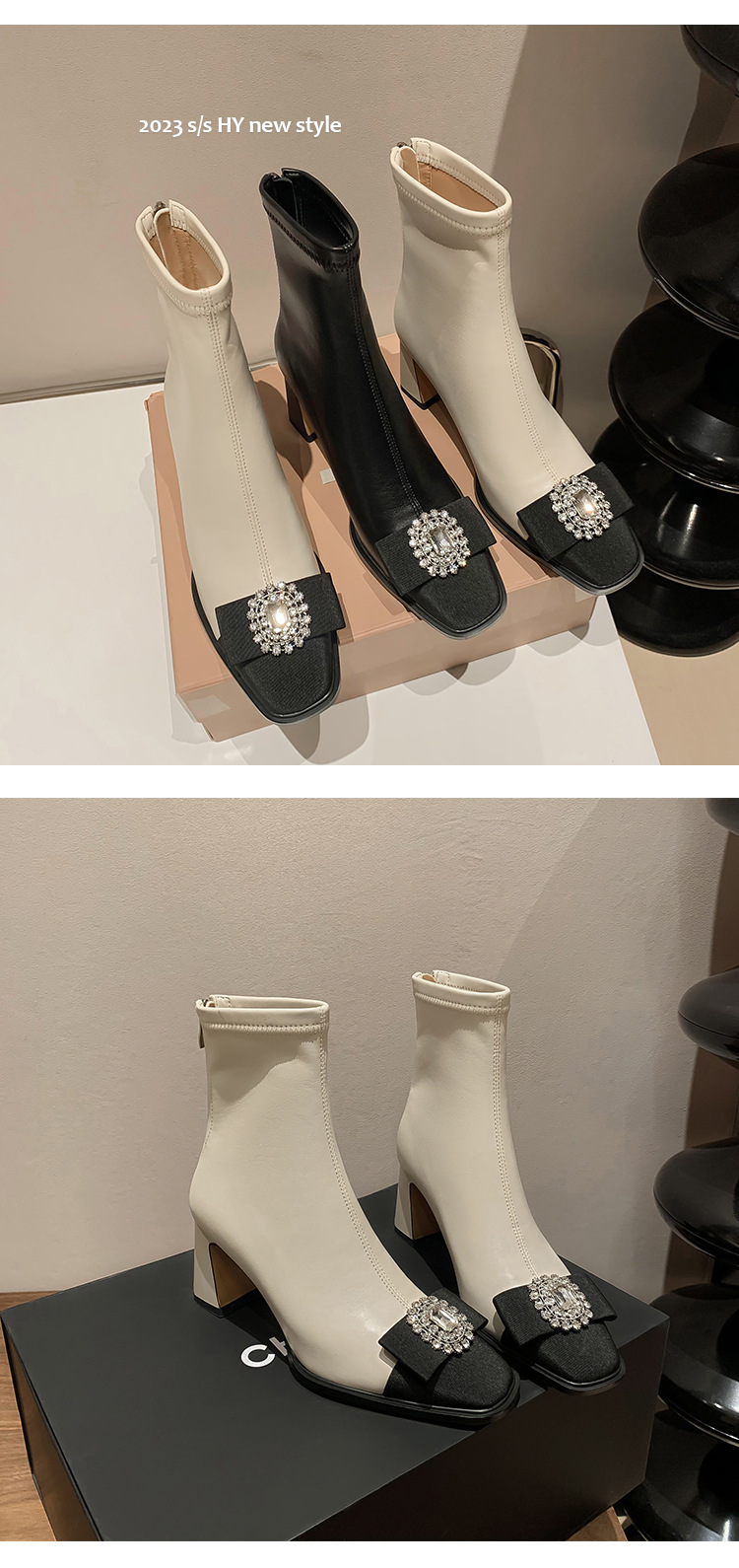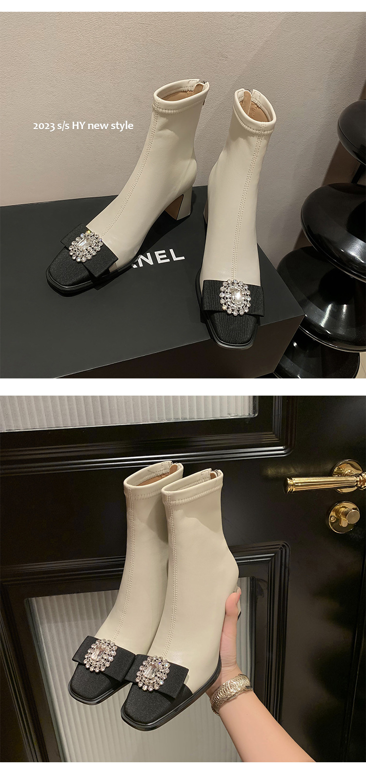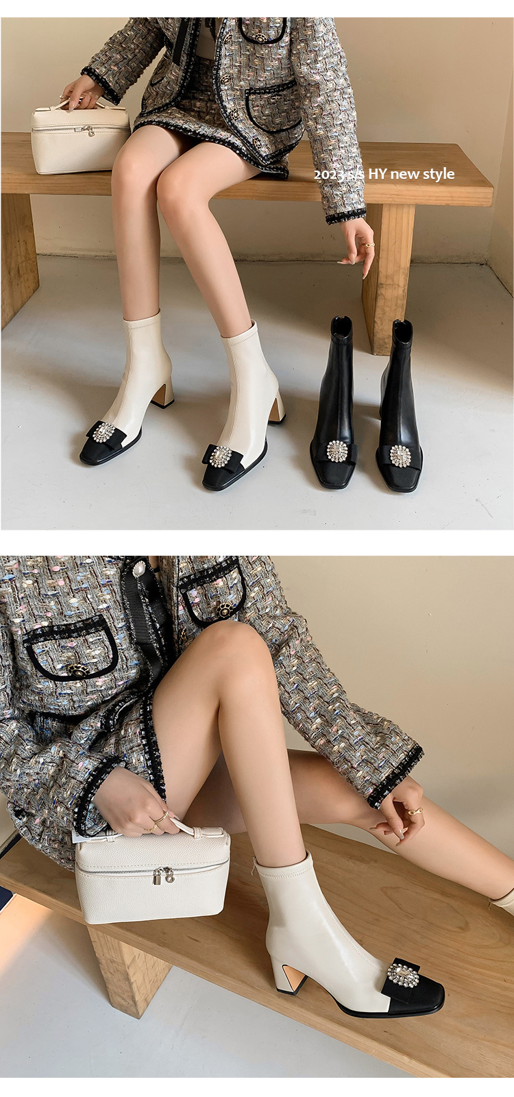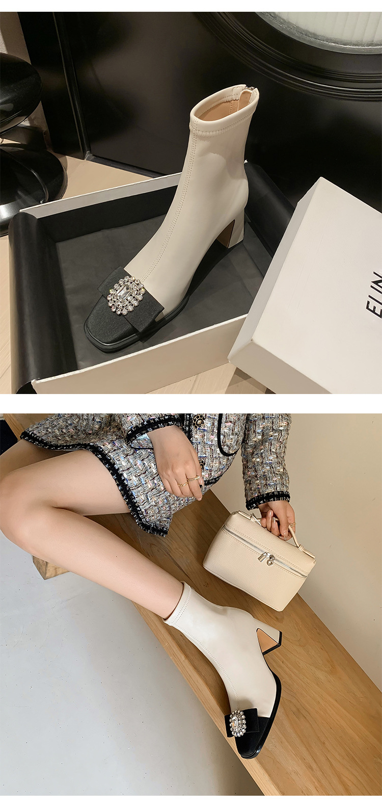 프랑스 스타일 샤넬 스타일 화이트 짧은 부츠 여성의 겨울 컬러 블록 작은 두꺼운 힐 하이힐 우아한 얇은 부츠 라인스톤 부츠스토어 가기