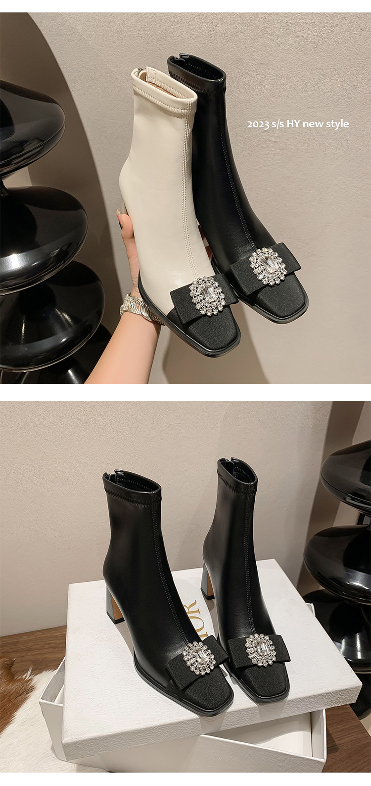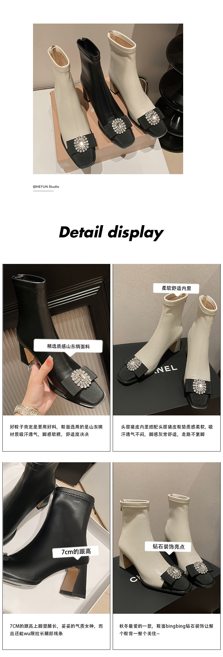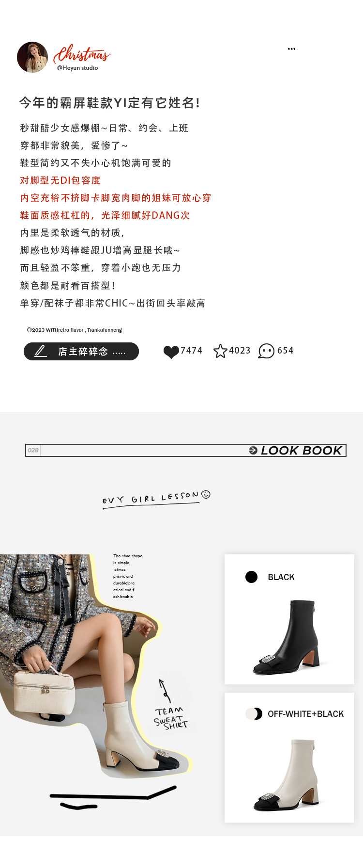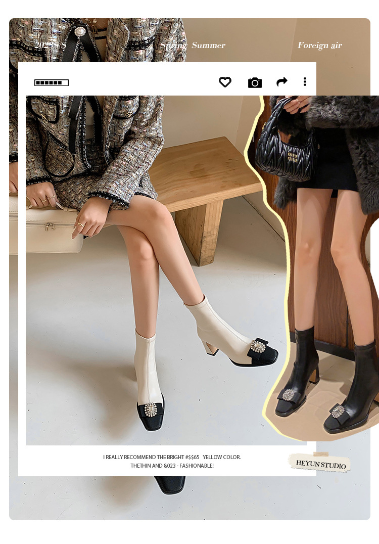 프랑스 스타일 샤넬 스타일 화이트 짧은 부츠 여성의 겨울 컬러 블록 작은 두꺼운 힐 하이힐 우아한 얇은 부츠 라인스톤 부츠스토어 가기