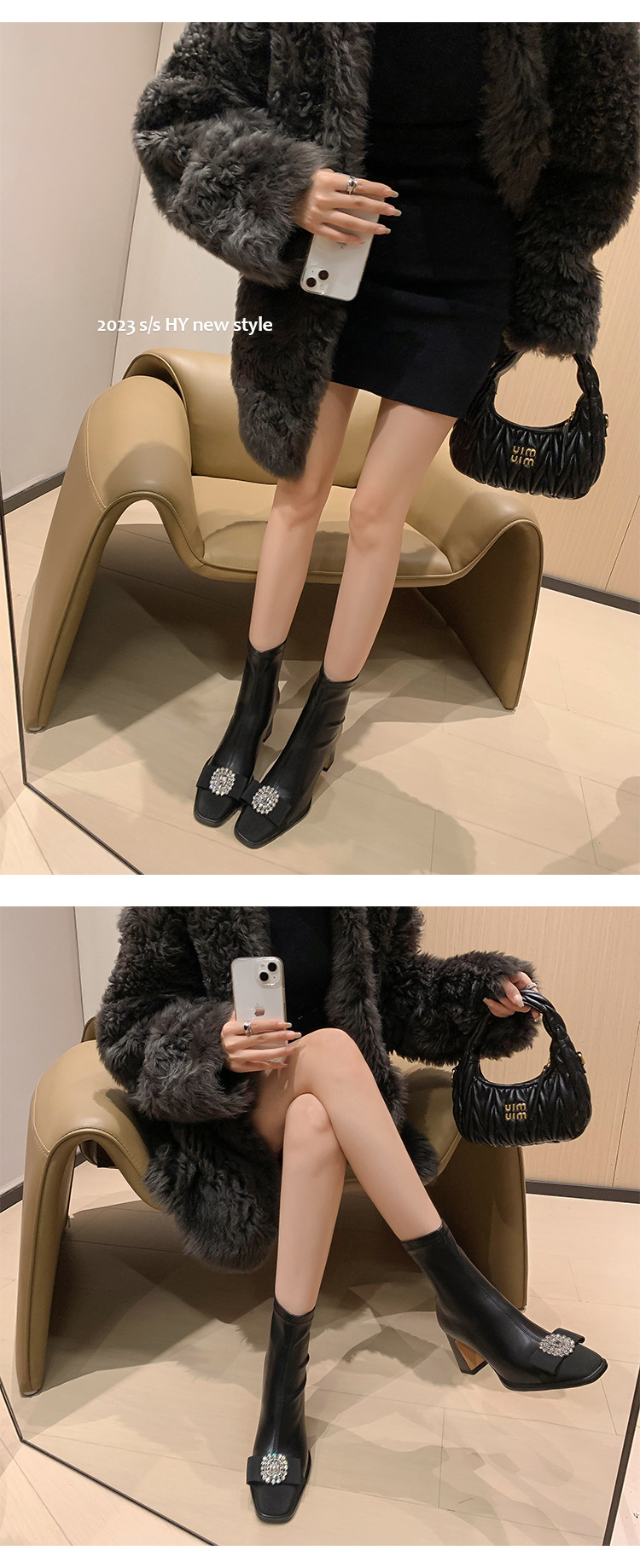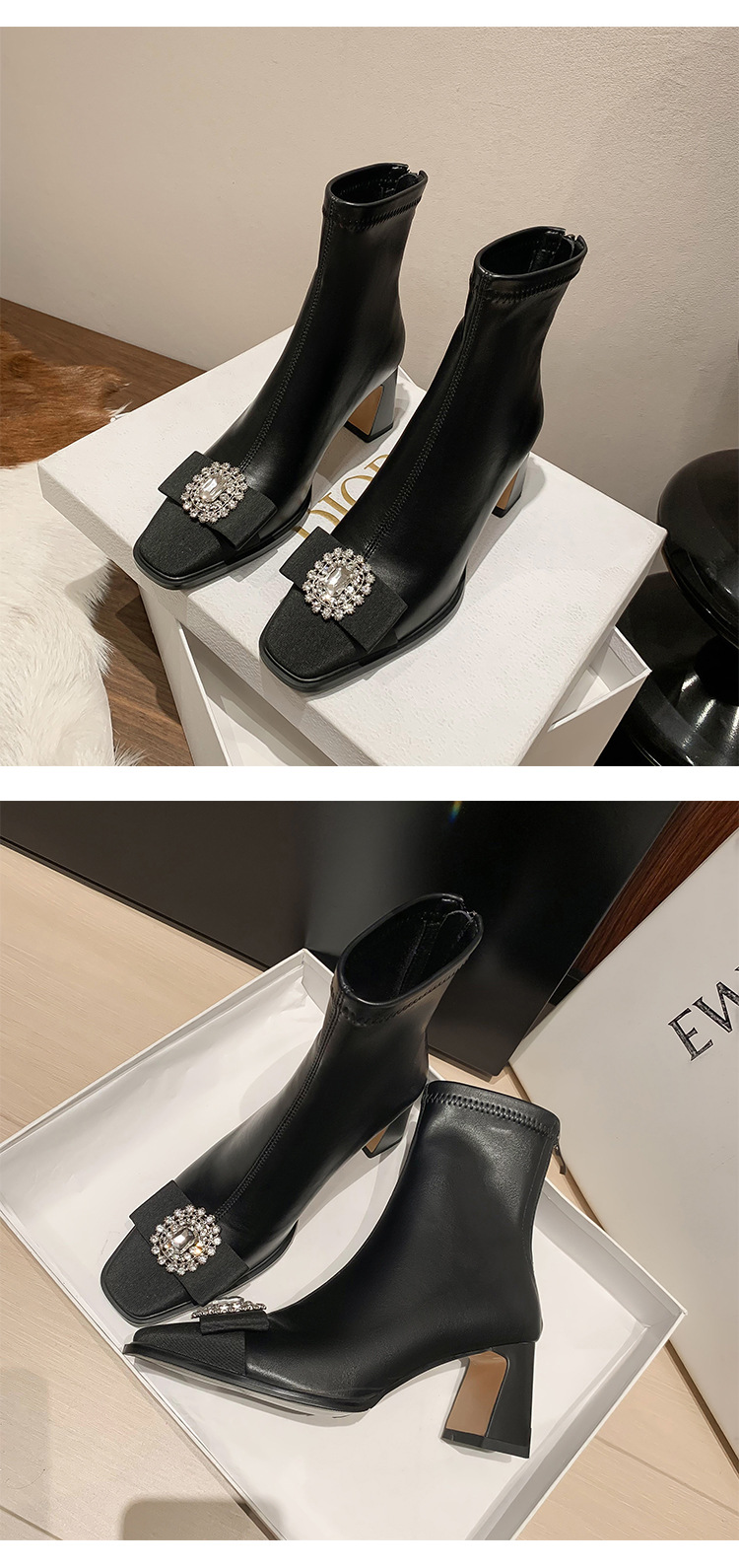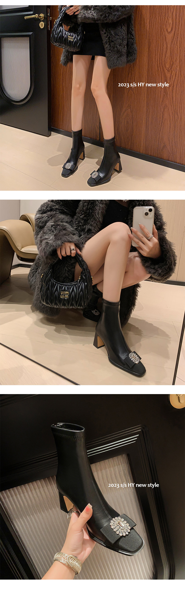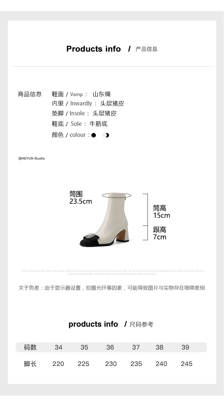 프랑스 스타일 샤넬 스타일 화이트 짧은 부츠 여성의 겨울 컬러 블록 작은 두꺼운 힐 하이힐 우아한 얇은 부츠 라인스톤 부츠스토어 가기