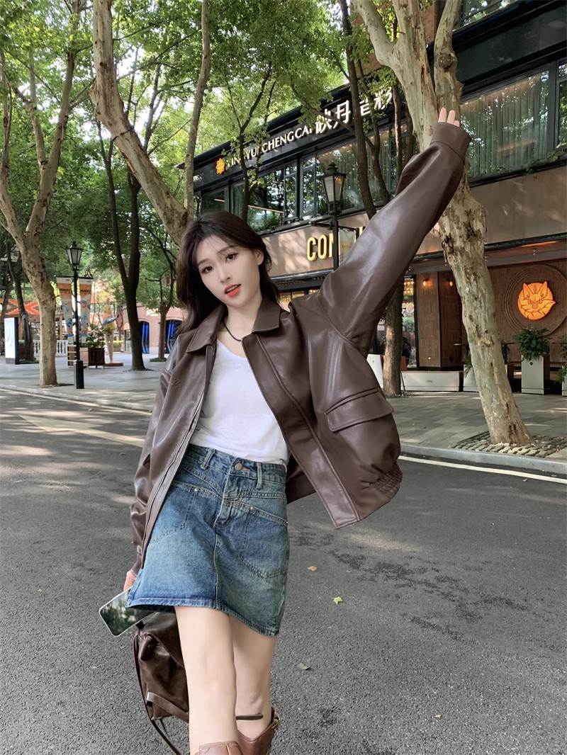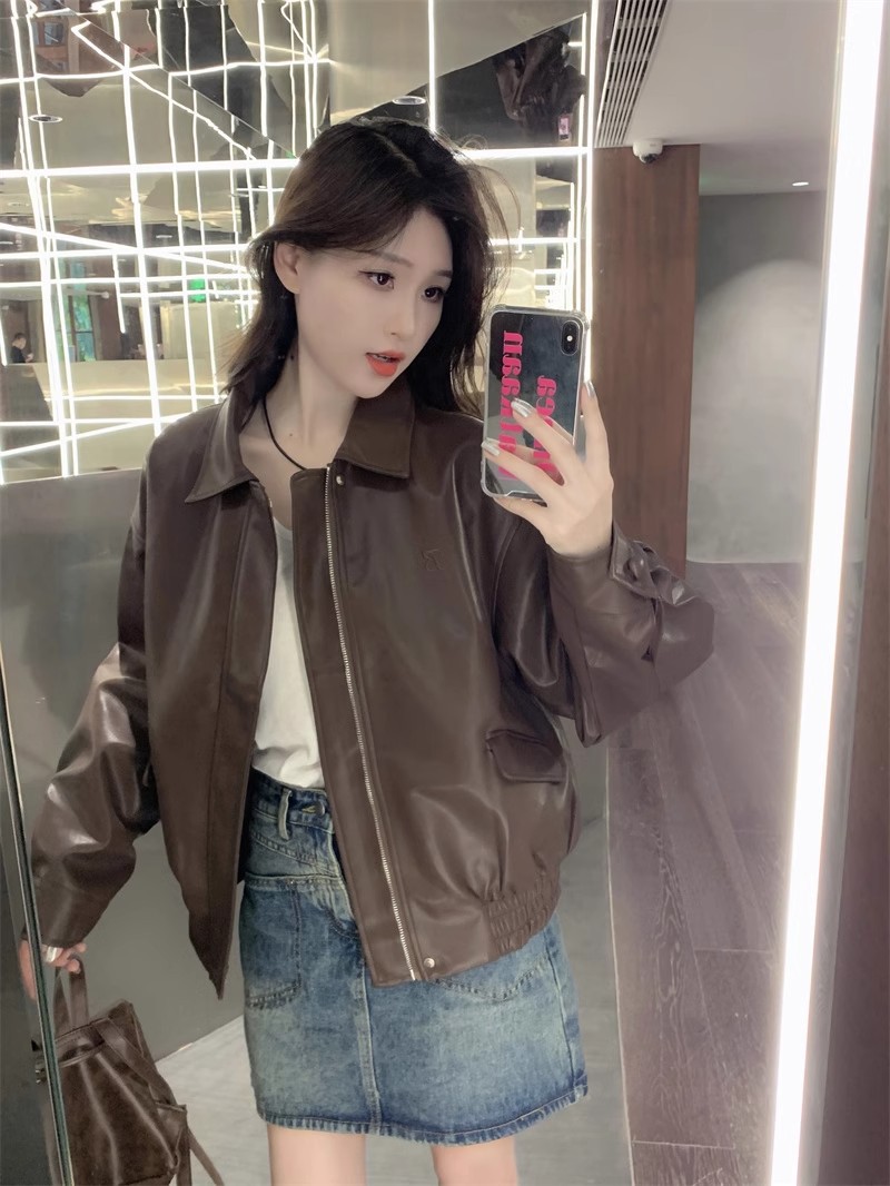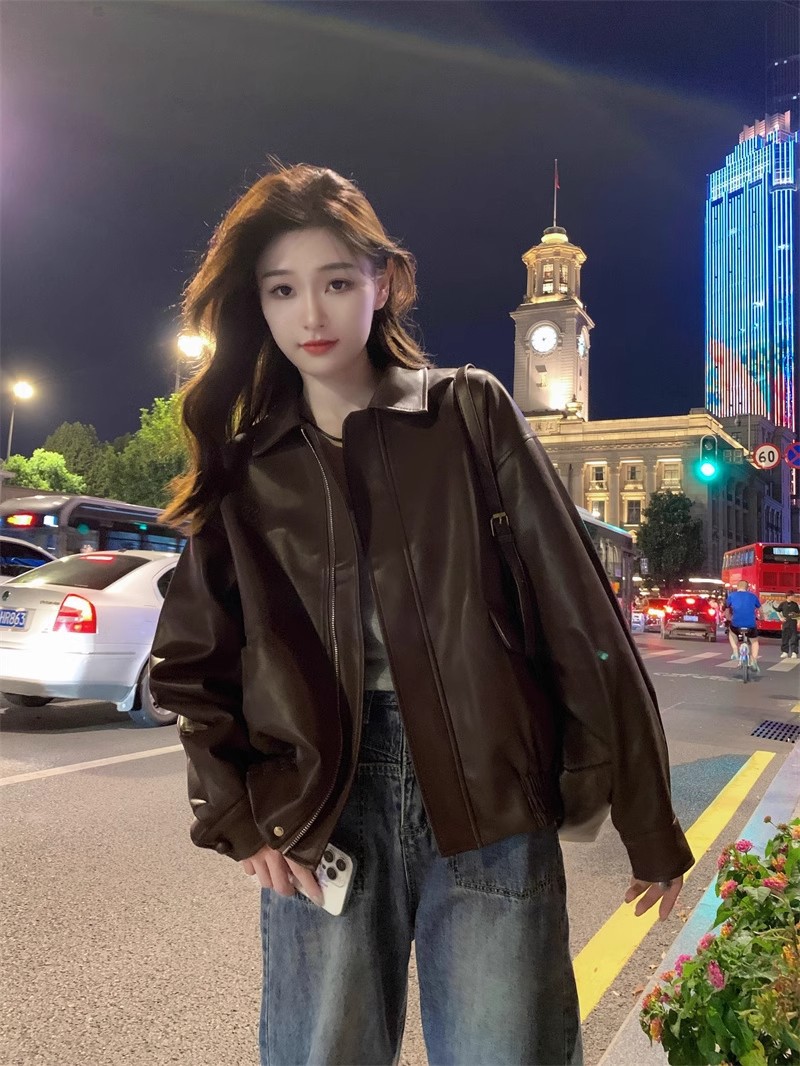 홍콩 스타일 레트로 스트리트 패션 가죽 자켓 여성의 2024 가을 새로운 여성 오토바이 다크 브라운 미국 재킷 탑