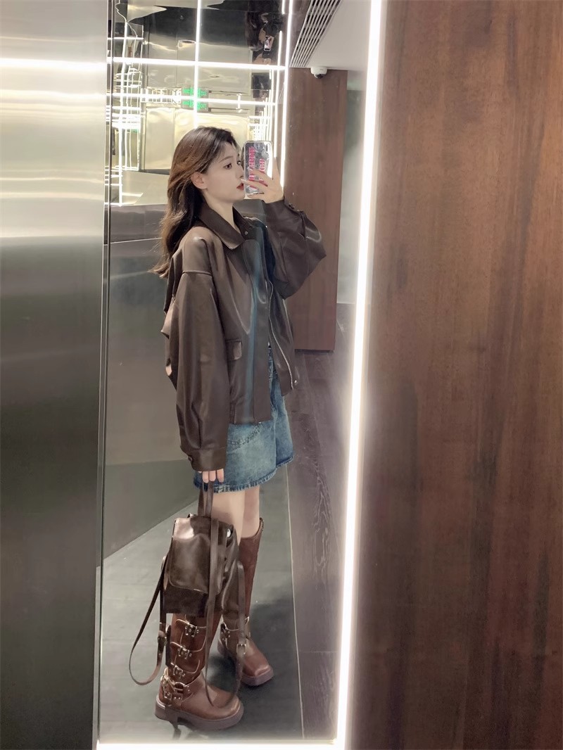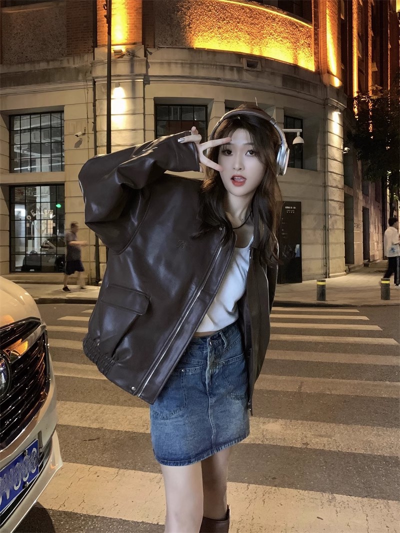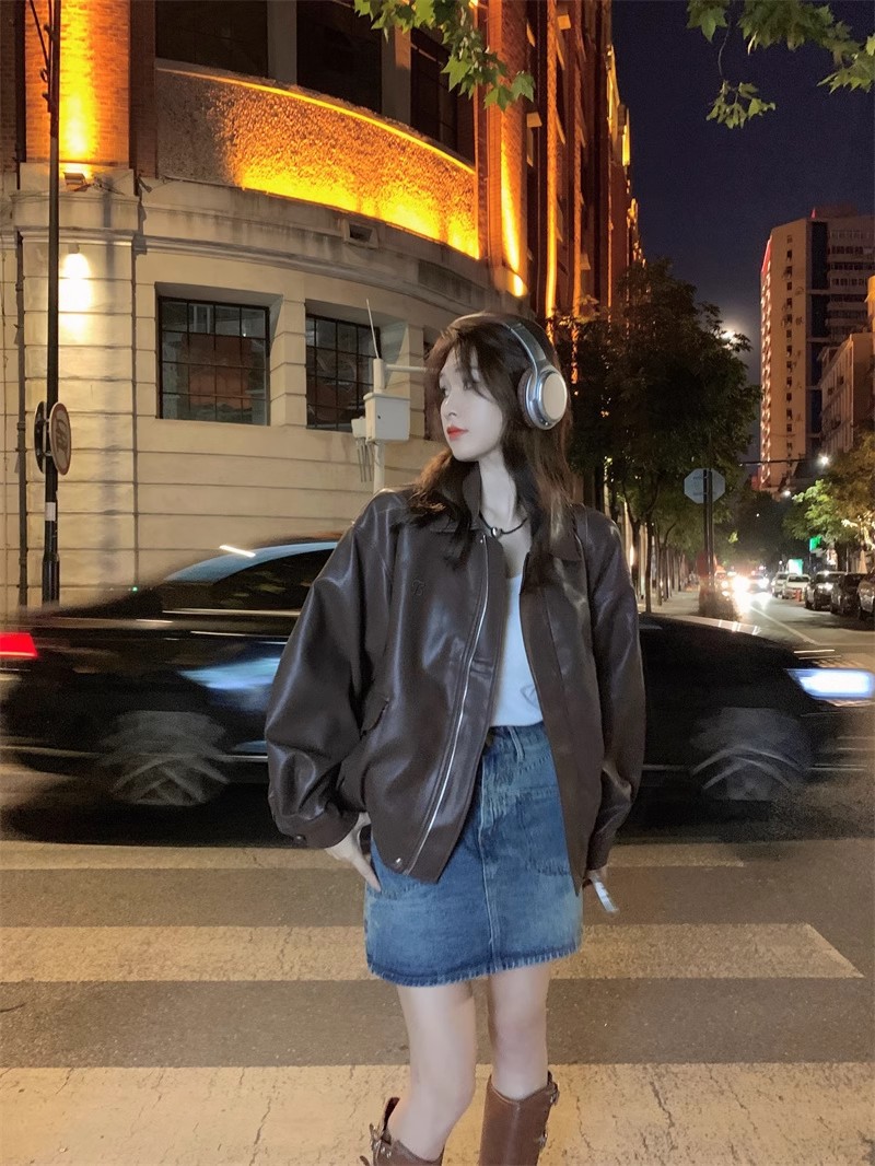 홍콩 스타일 레트로 스트리트 패션 가죽 자켓 여성의 2024 가을 새로운 여성 오토바이 다크 브라운 미국 재킷 탑스토어 가기
