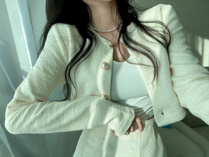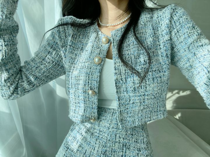 국경 간 한국 우아한 샤넬 스타일 라운드 넥 펄 싱글 브레스트 쇼트 코트 하이 웨이스트 트위드 와이드 레그 반바지스토어 가기