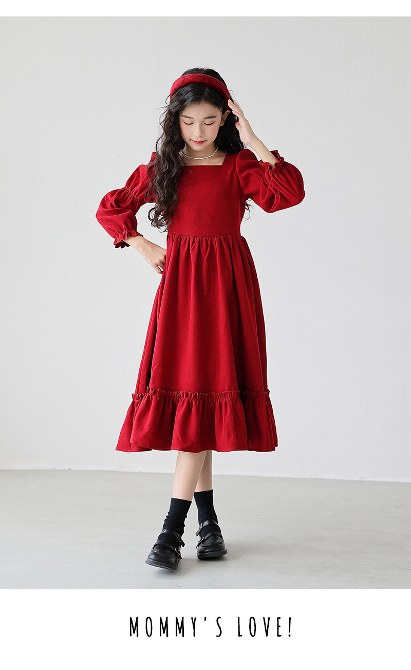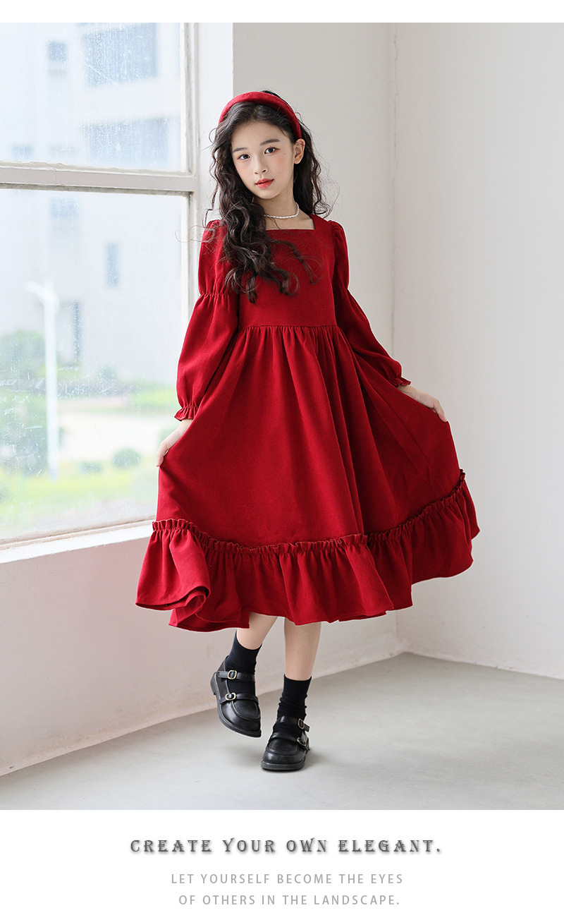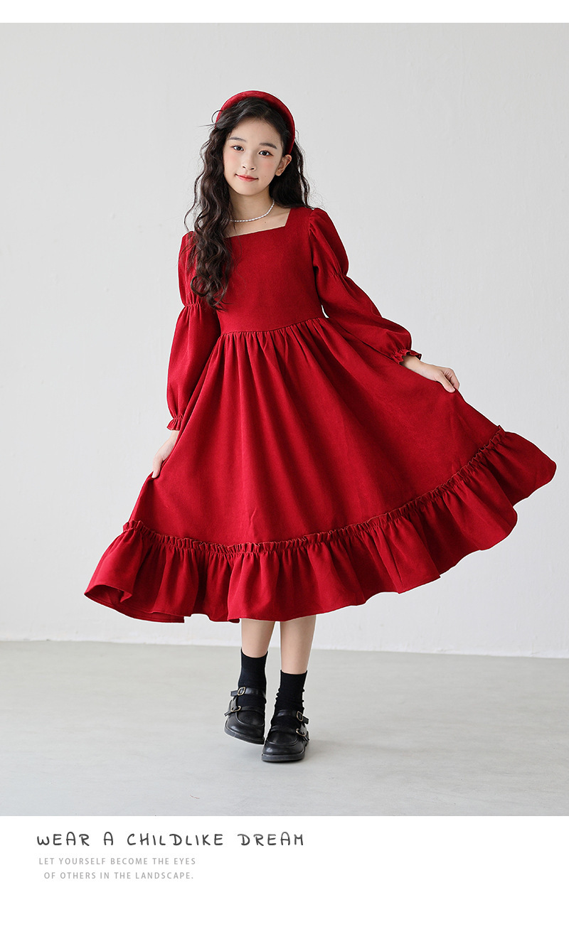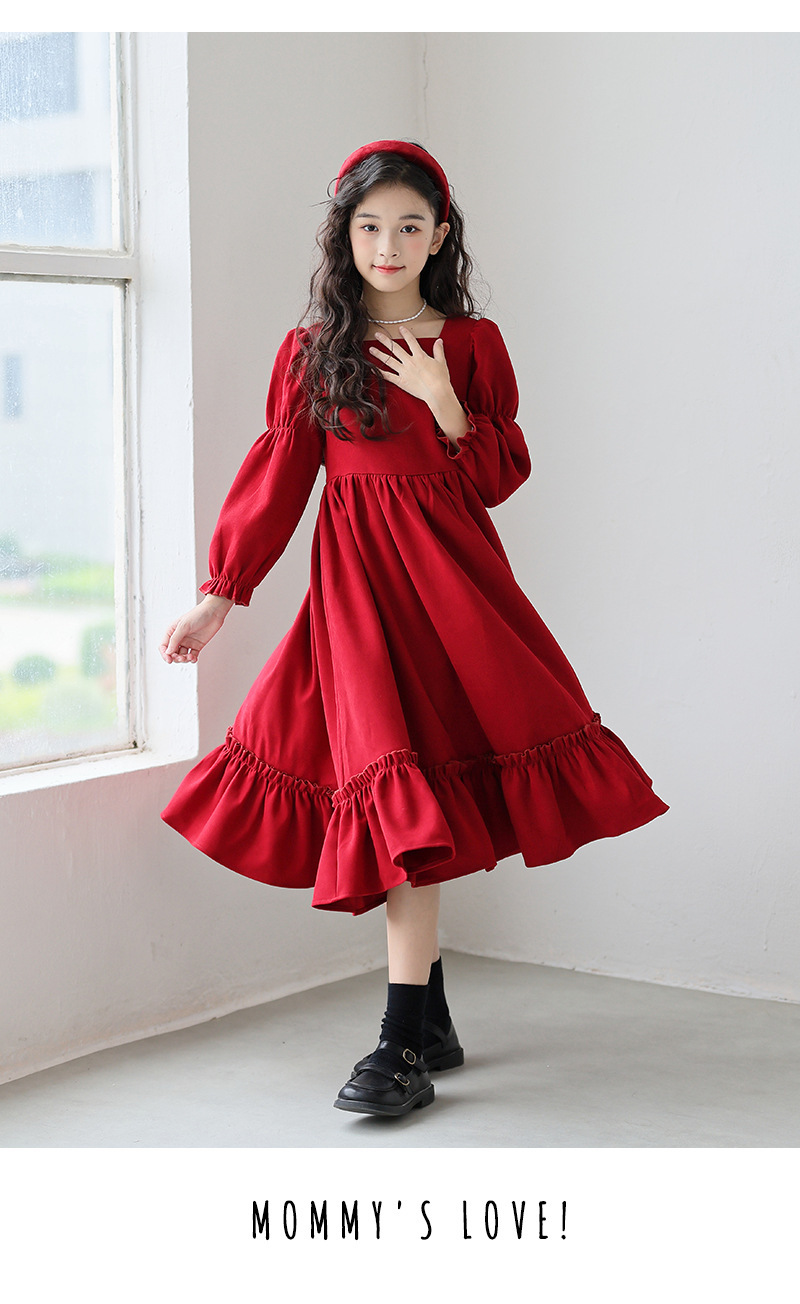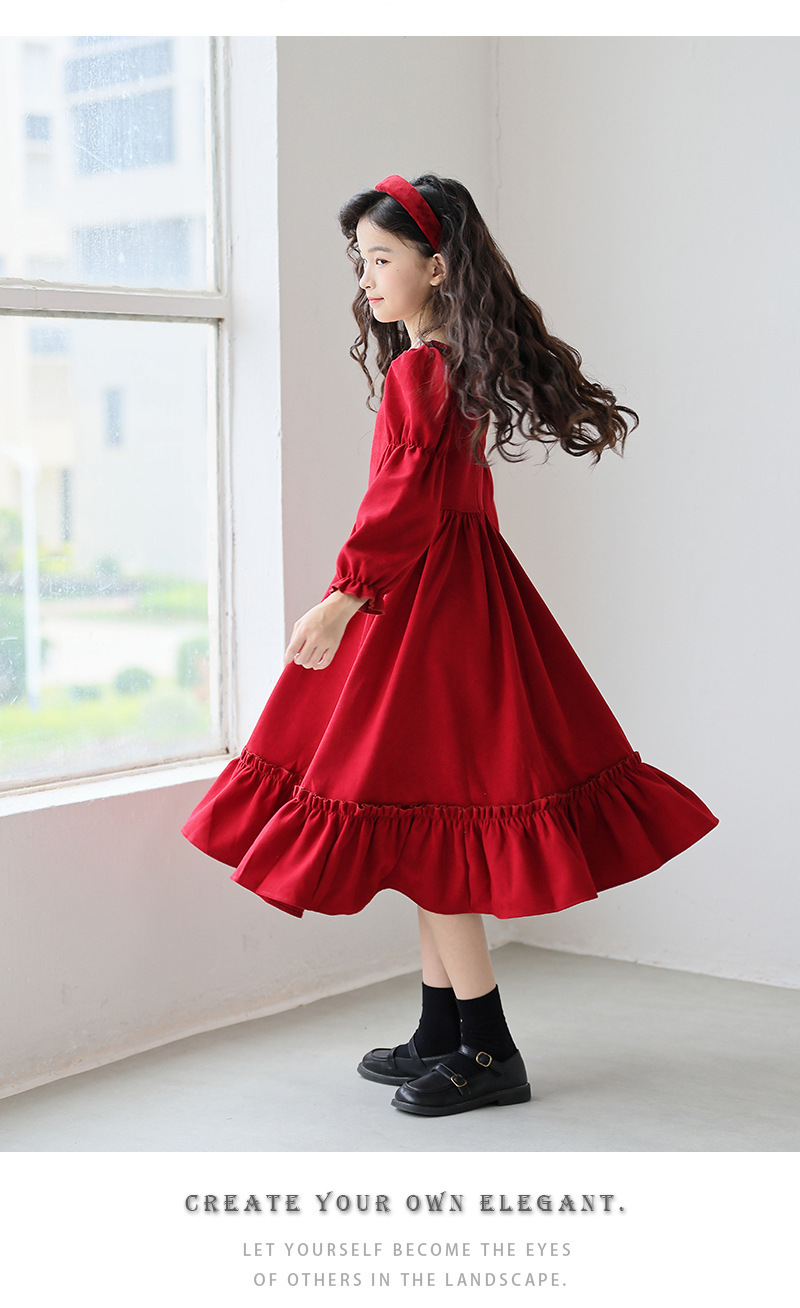 소녀 긴 소매 원피스 가을 봄과 가을 새로운 어린이 공주 원피스 소녀 광장 칼라 레드 웨스턴 스타일 스커트스토어 가기