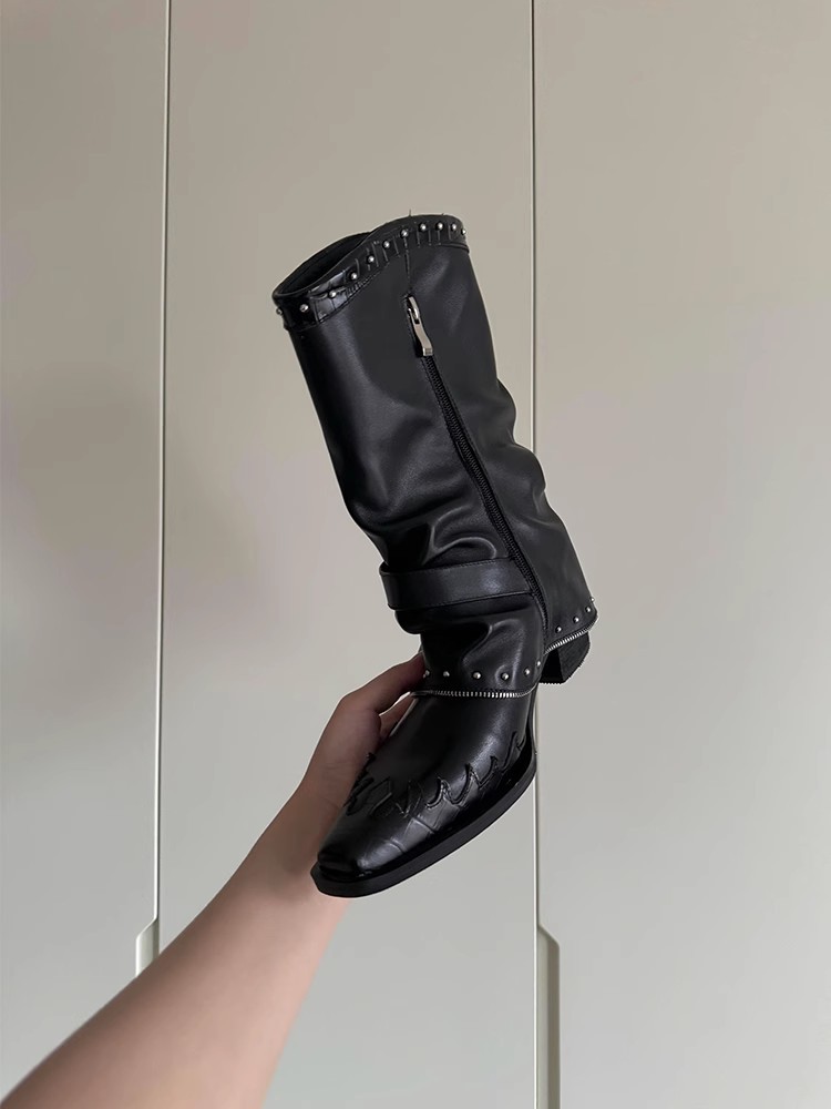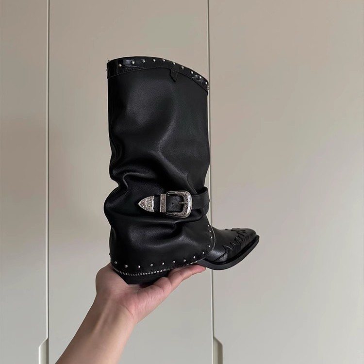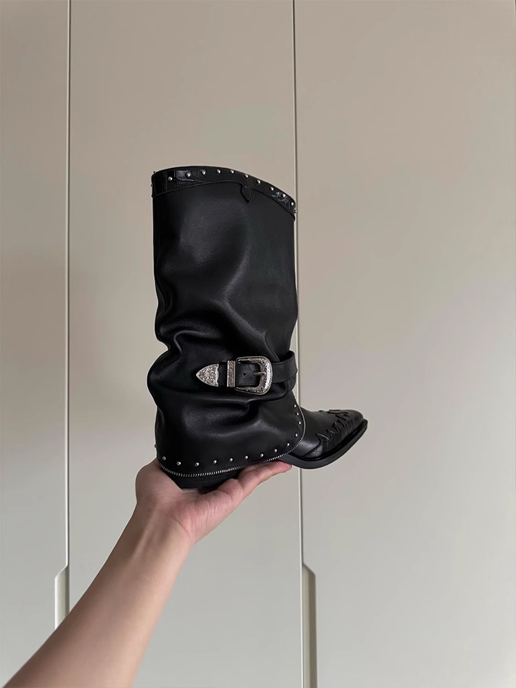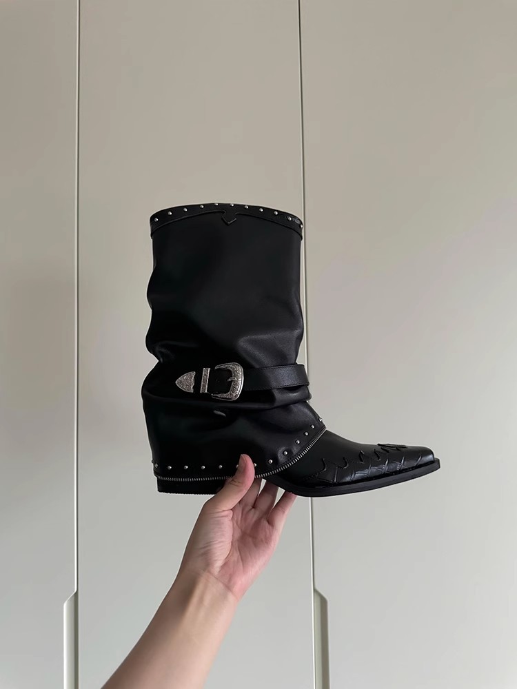 Cowhide 버전 ~ 펑크 오토바이 스타일 포인팅 우아한 바지 부츠 여성 두꺼운 힐 벨트 버클 리벳 주름 웨스턴 부츠스토어 가기