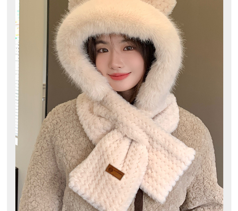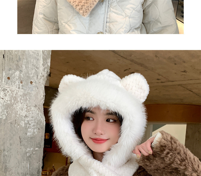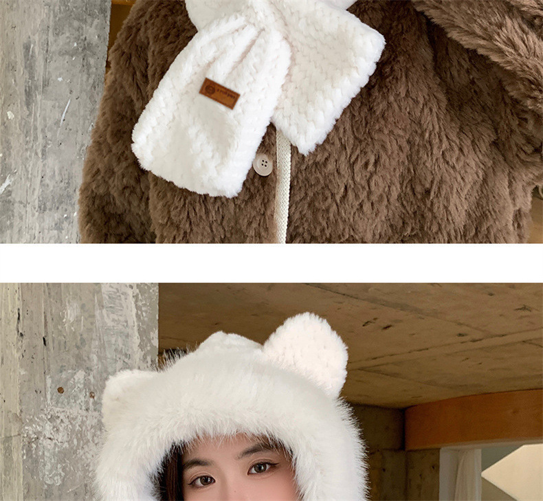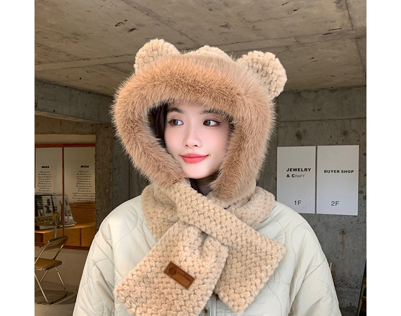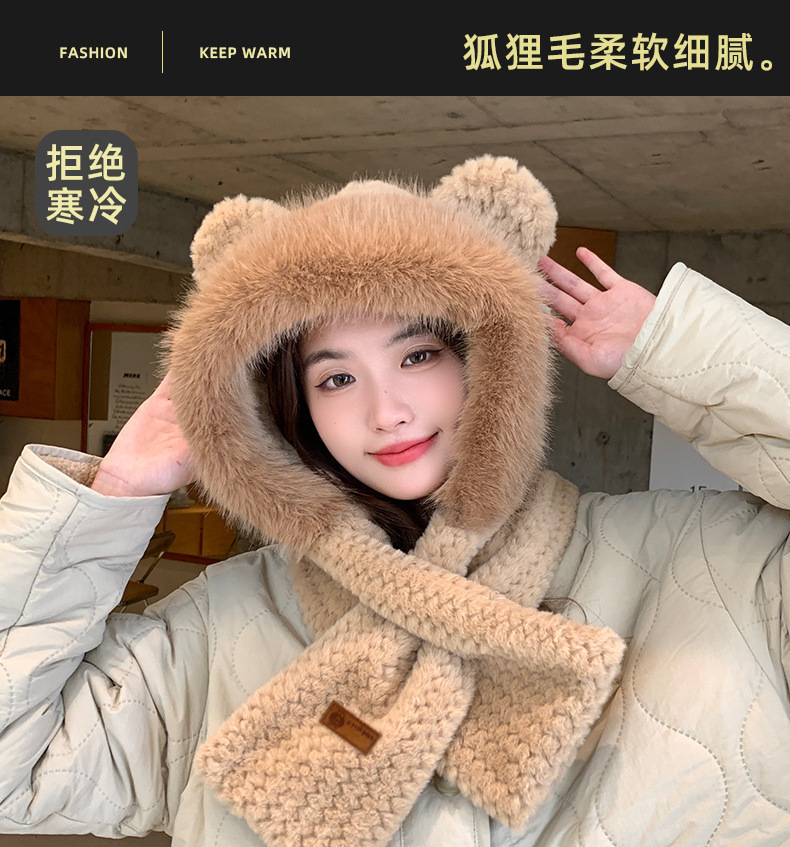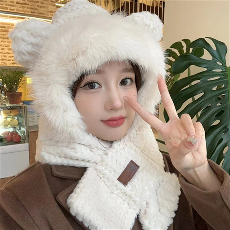 귀여운 곰 모자와 스카프 통합 여성의 겨울 푹신한 모자 여성의 겨울 기모 따뜻한 귀 보호 냉장 모자 물결