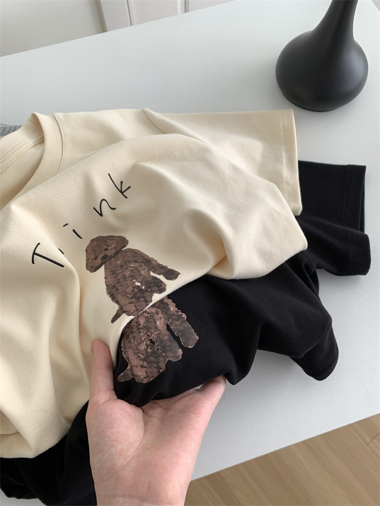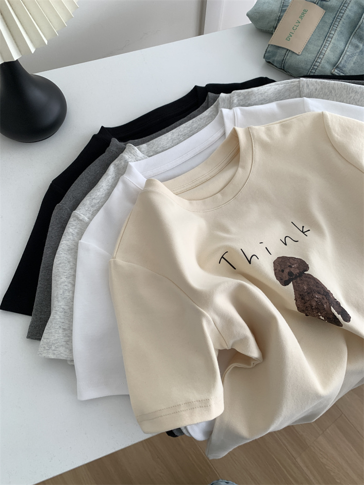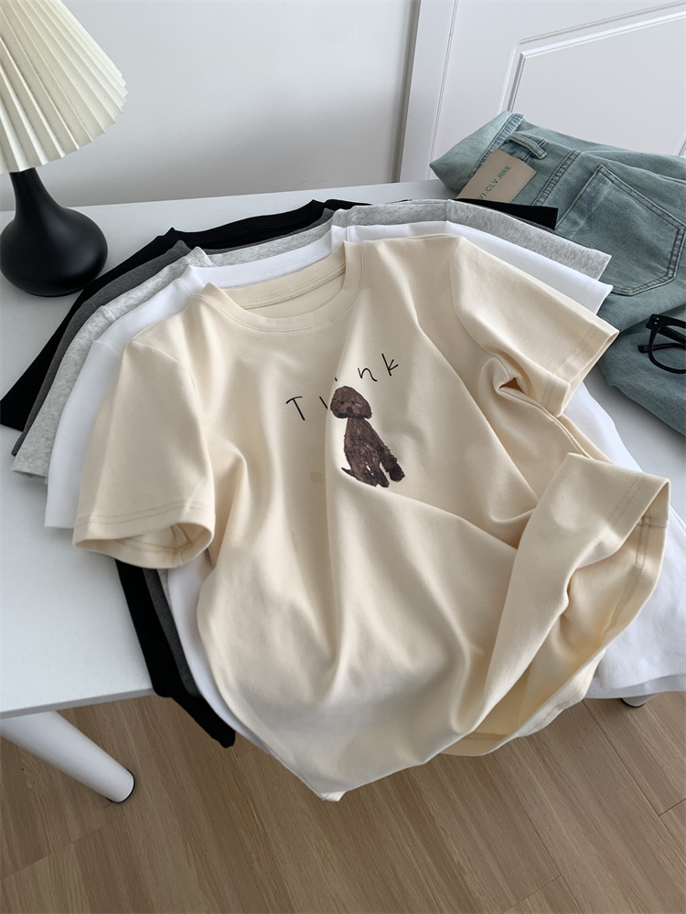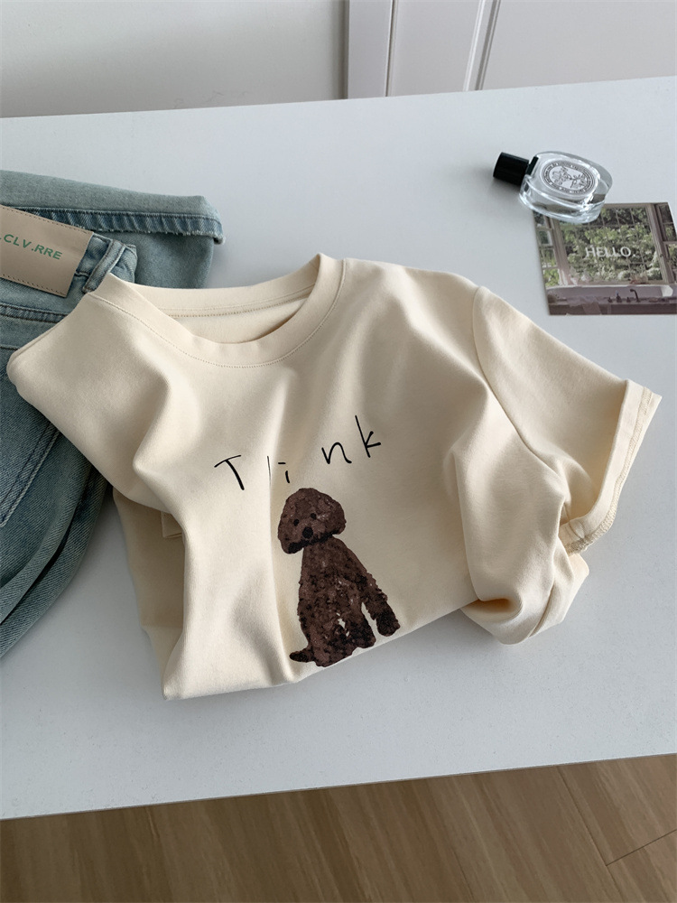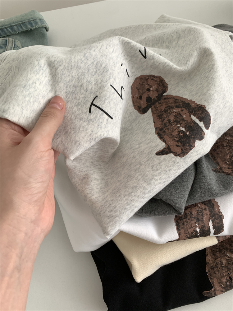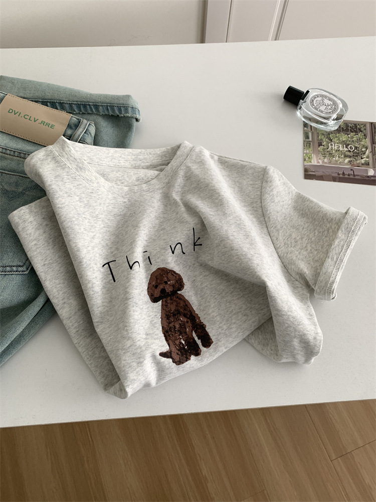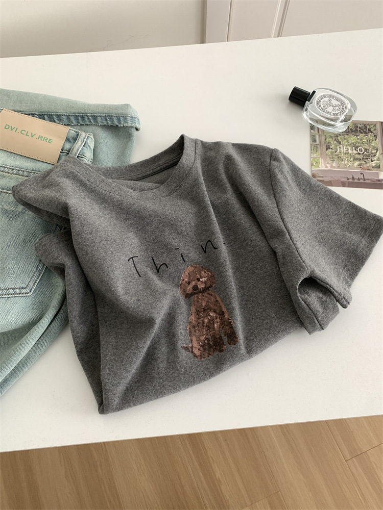 이른 가을 새 만화 강아지 샌딩 티셔츠 여성용 느슨한 캐주얼 통근 모두 두꺼운 소프트 왁스 반소매 베이스 셔츠
