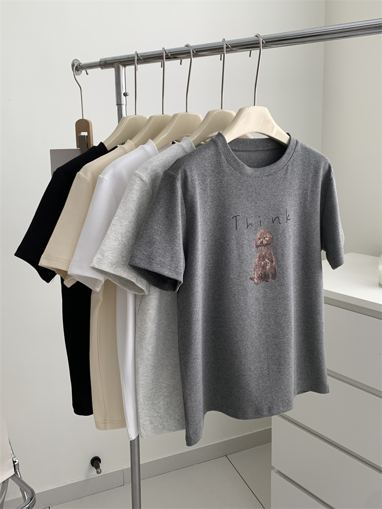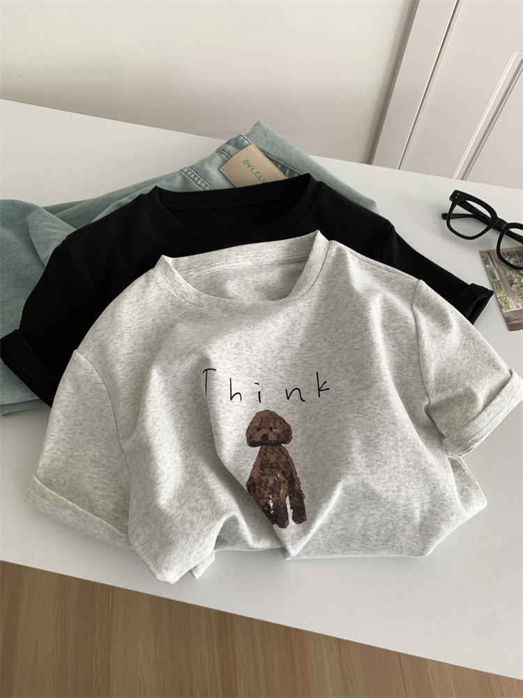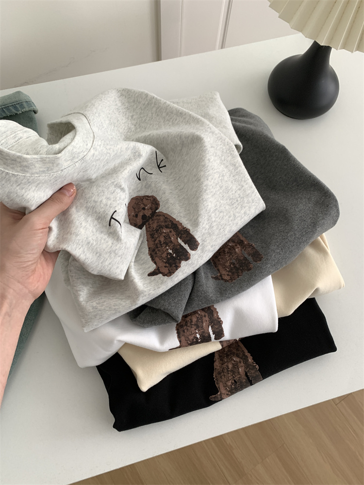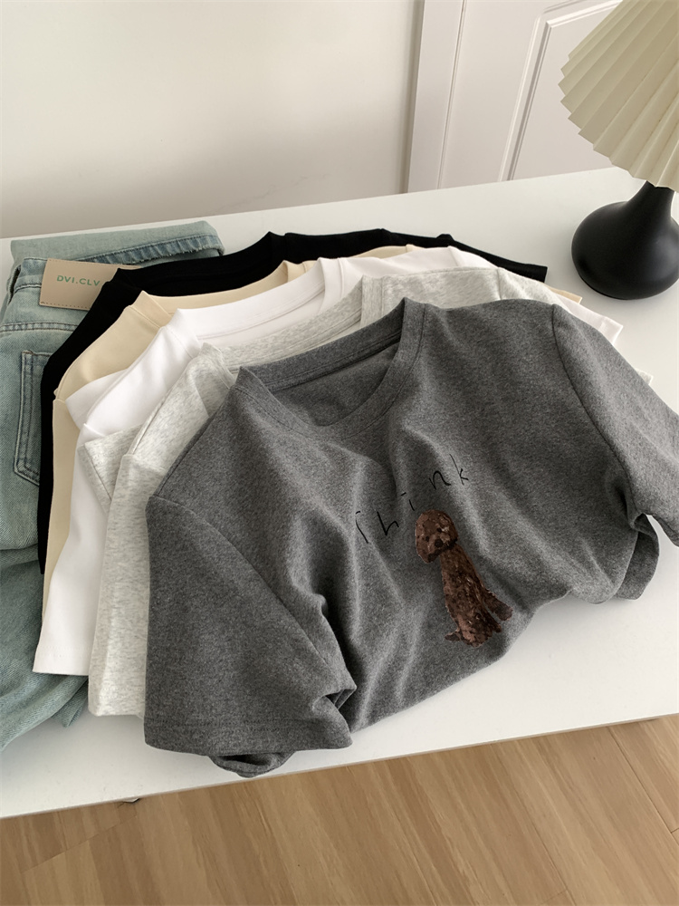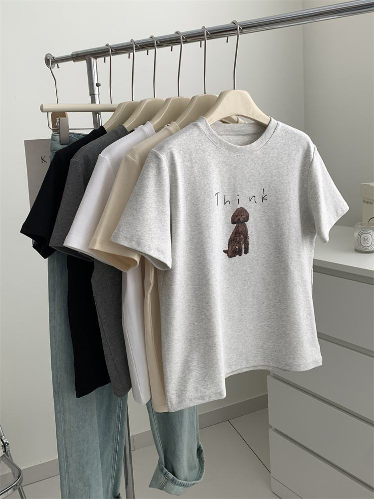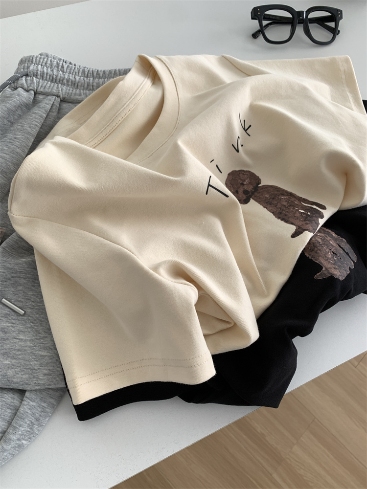 이른 가을 새 만화 강아지 샌딩 티셔츠 여성용 느슨한 캐주얼 통근 모두 두꺼운 소프트 왁스 반소매 베이스 셔츠