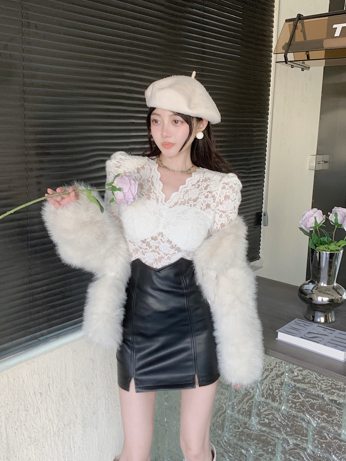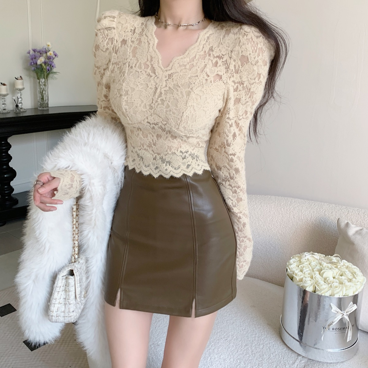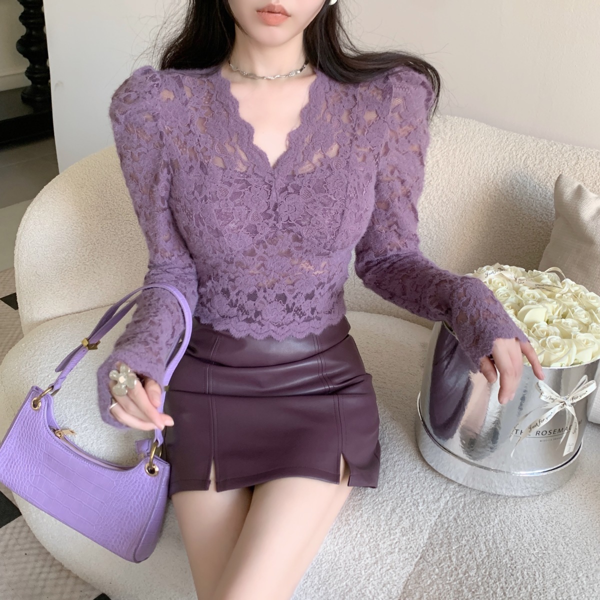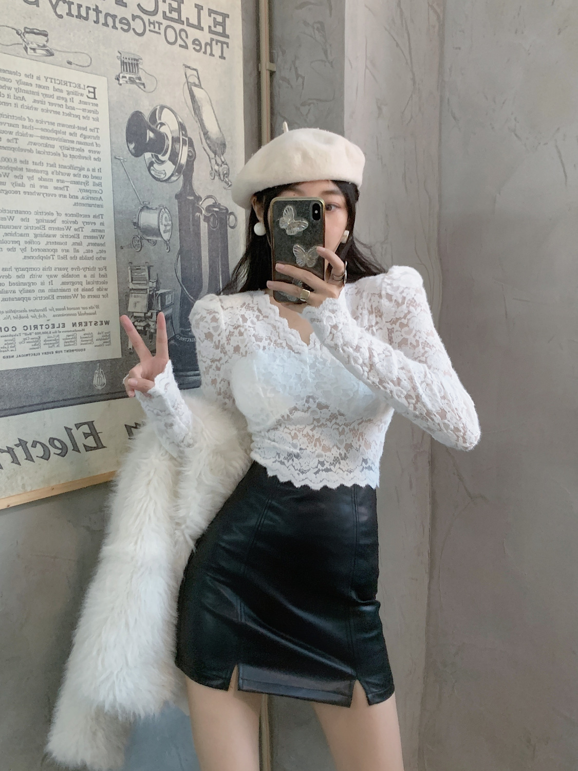 기모 샌딩 V 넥 레이스베이스 셔츠 여성의 가을과 겨울 새로운 디자인 센스 퍼프 슬리브 아름다운 탑 란지스토어 가기