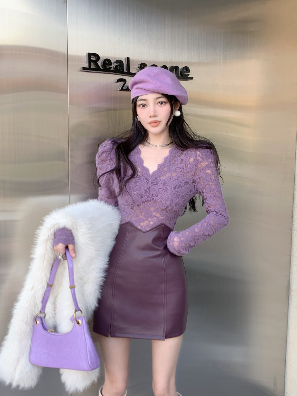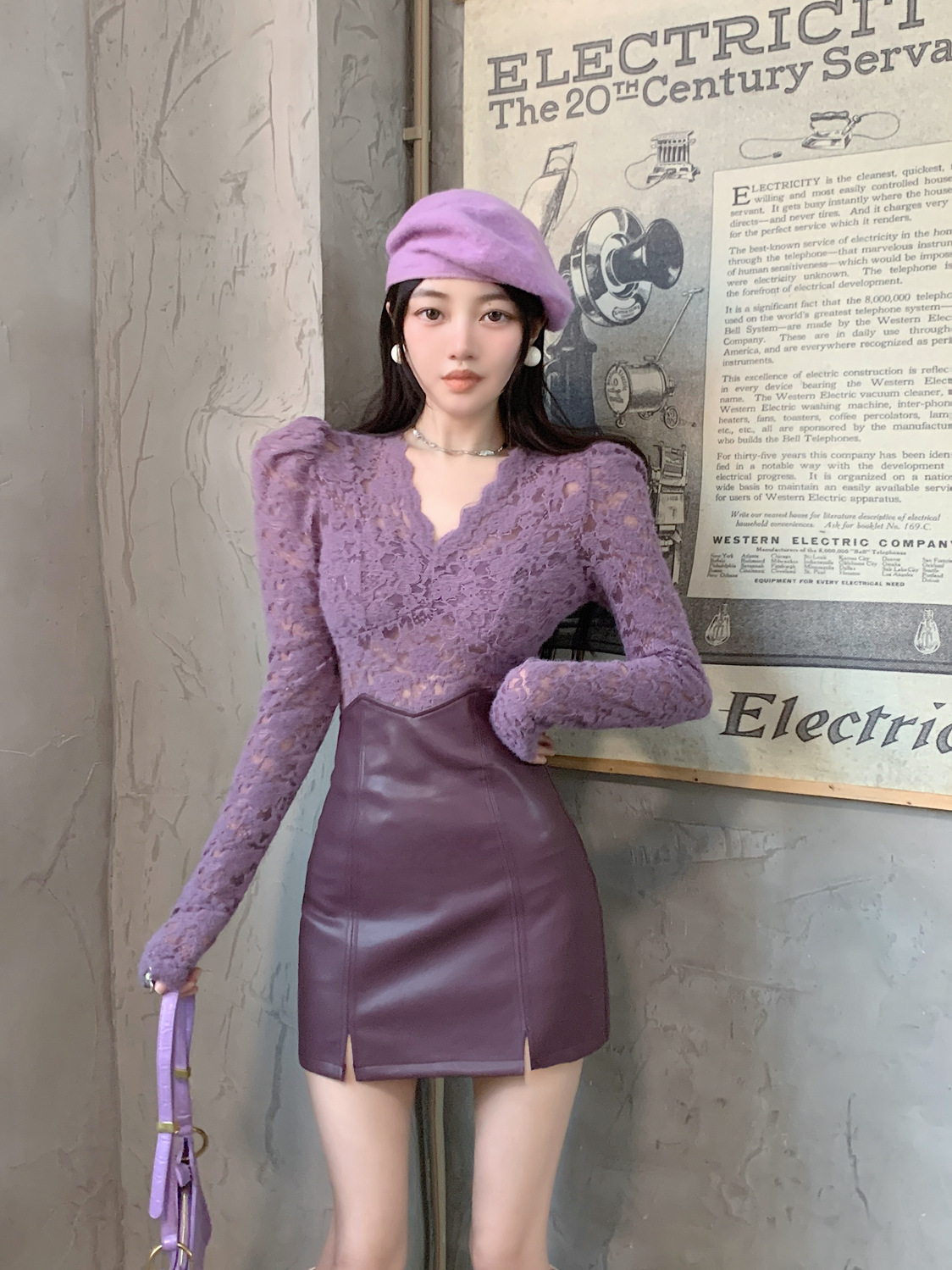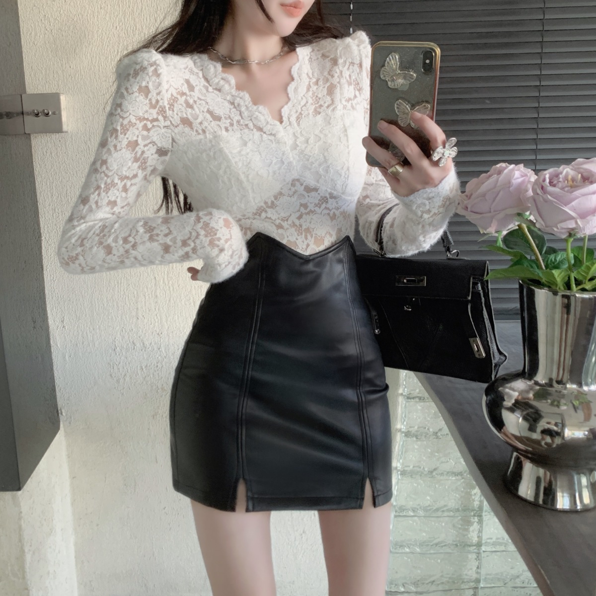 기모 샌딩 V 넥 레이스베이스 셔츠 여성의 가을과 겨울 새로운 디자인 센스 퍼프 슬리브 아름다운 탑 란지스토어 가기