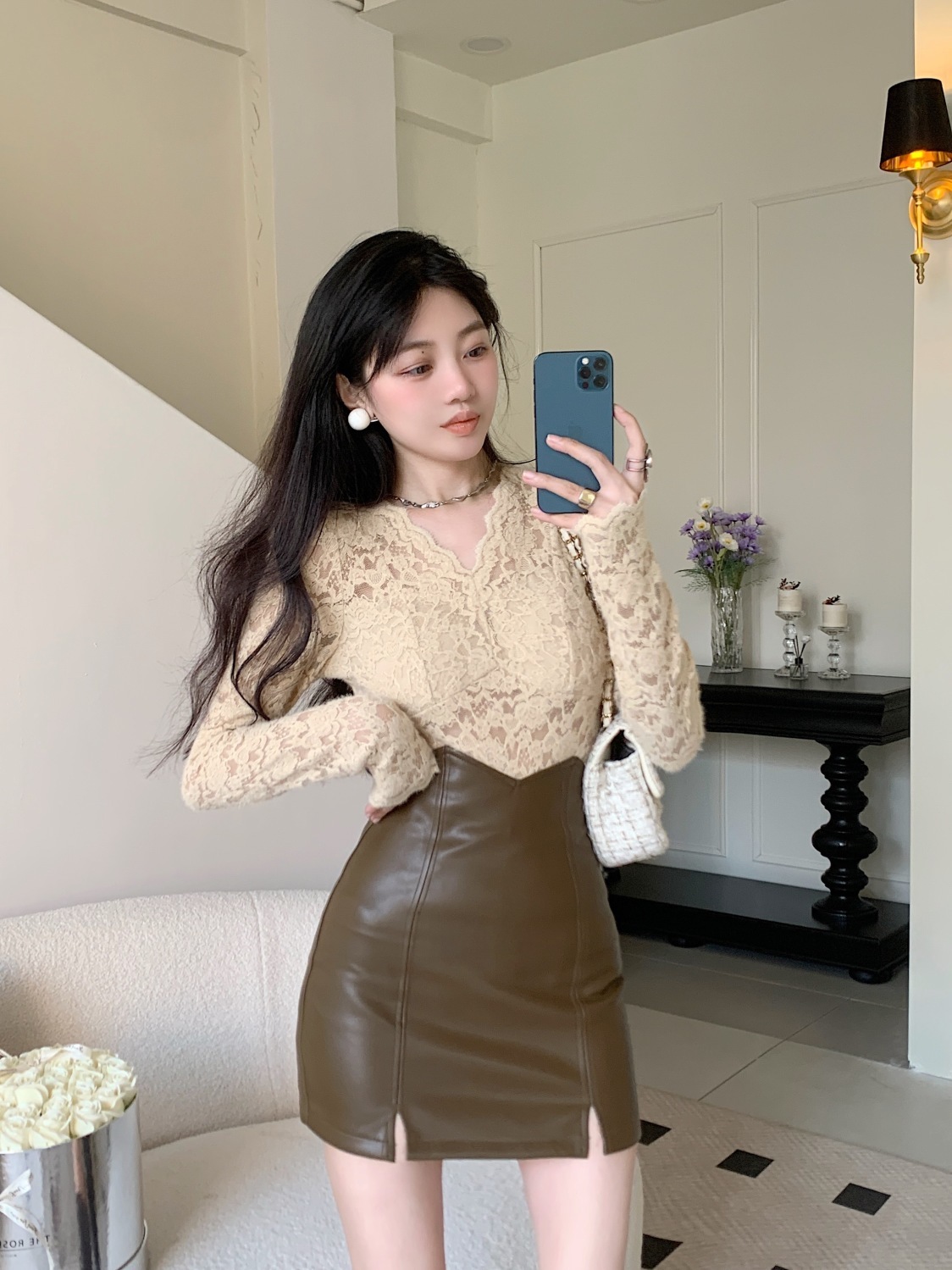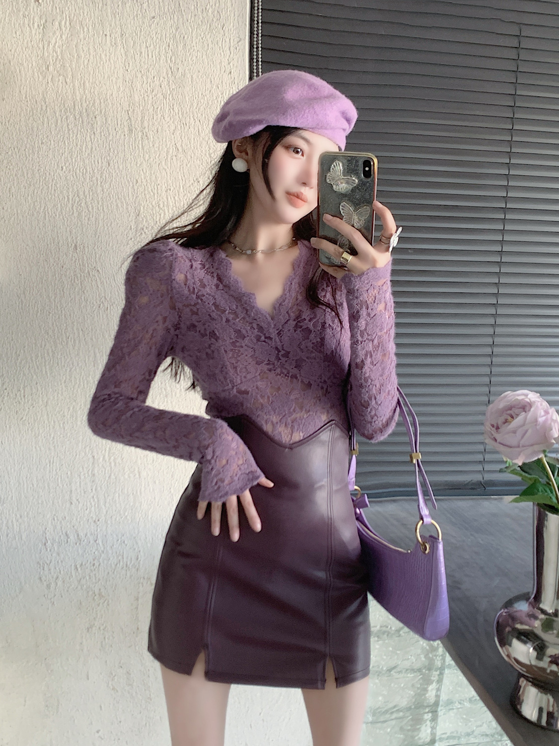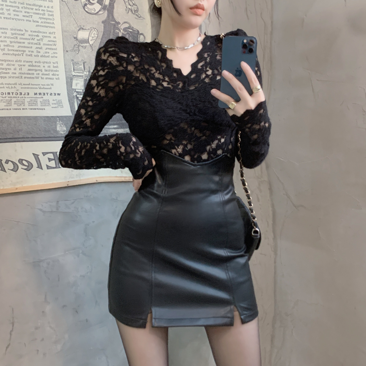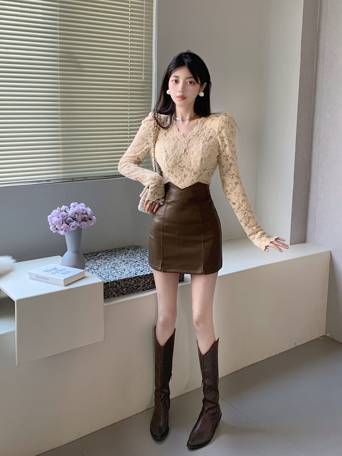 기모 샌딩 V 넥 레이스베이스 셔츠 여성의 가을과 겨울 새로운 디자인 센스 퍼프 슬리브 아름다운 탑 란지스토어 가기