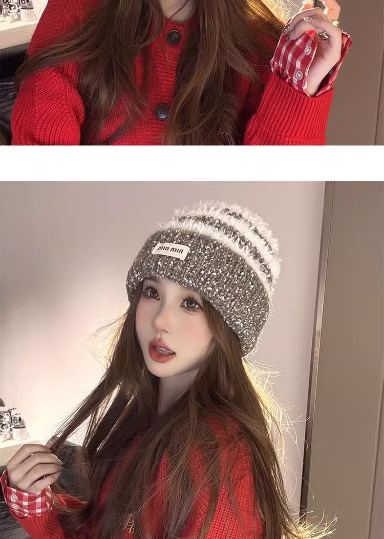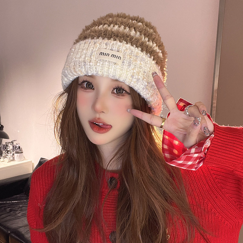 2024 ~ ~ ~ 큰 머리 둘레 패치 줄무늬 니트 더미 모자 가을과 겨울 따뜻한 귀 보호 울 모자의 한국어 버전스토어 가기