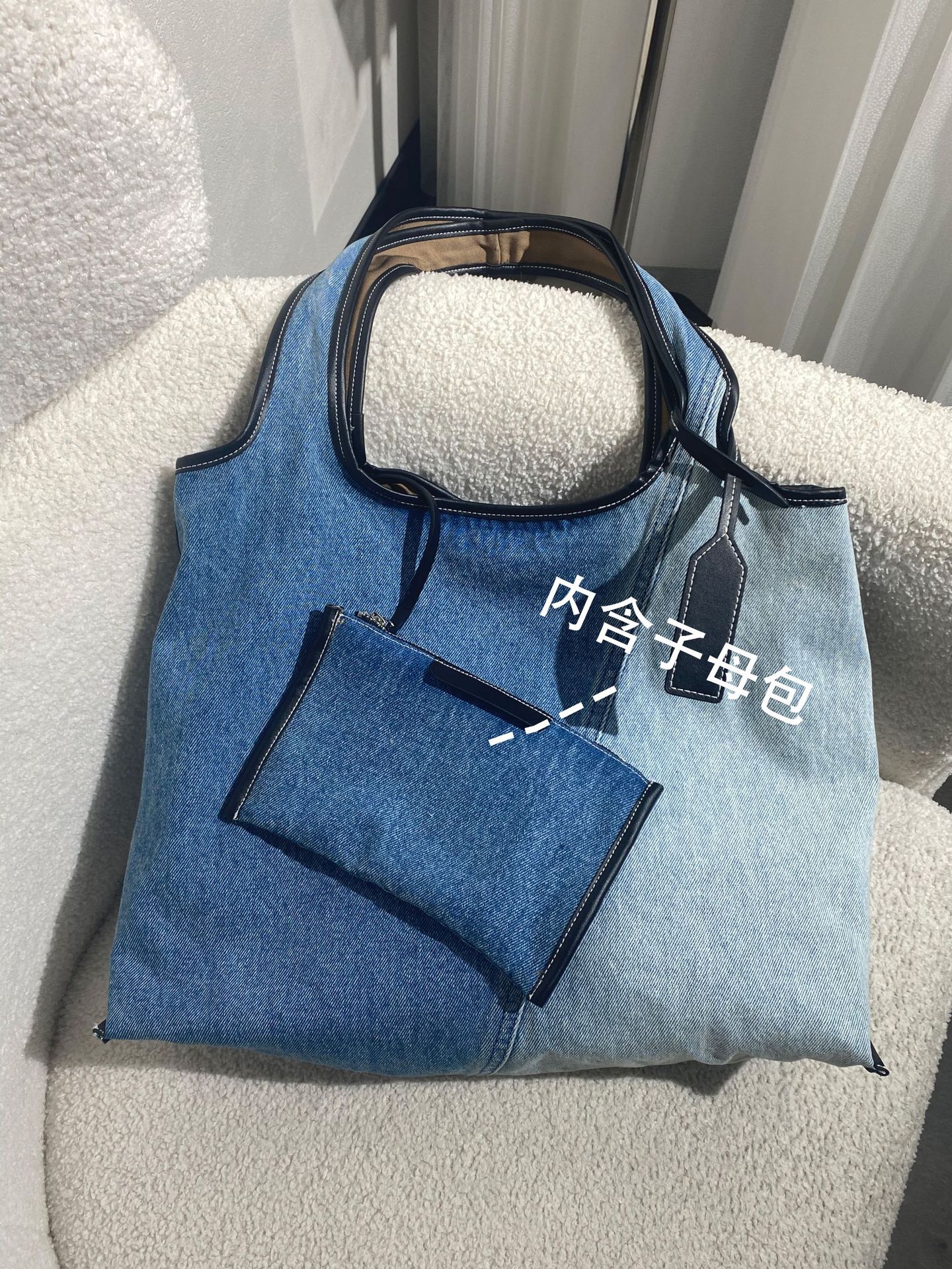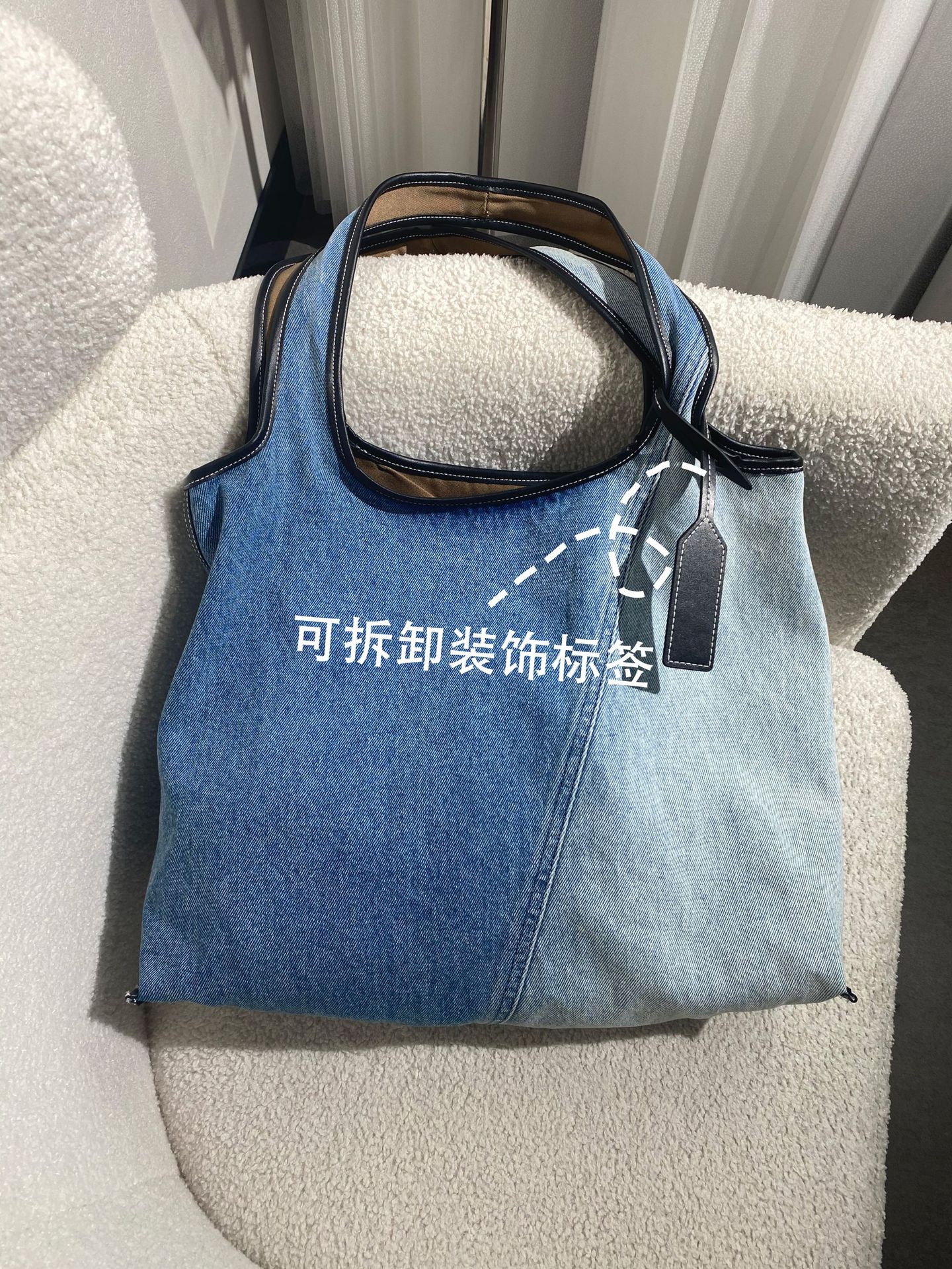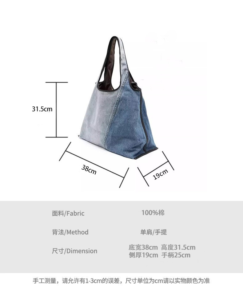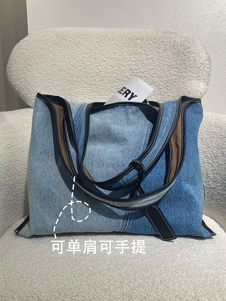 Xiaozhong 2024 새로운 어깨 핸드백 대비 데님 바느질 토트 백 여성용 대용량 언더암 가방스토어 가기