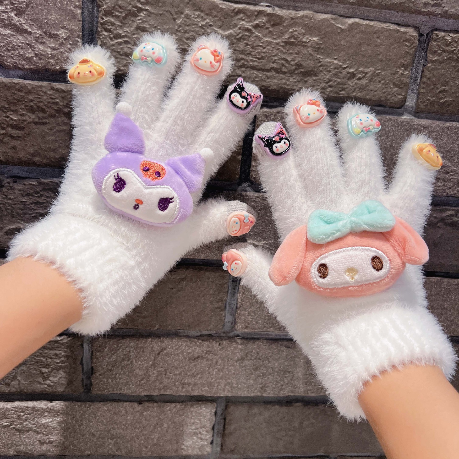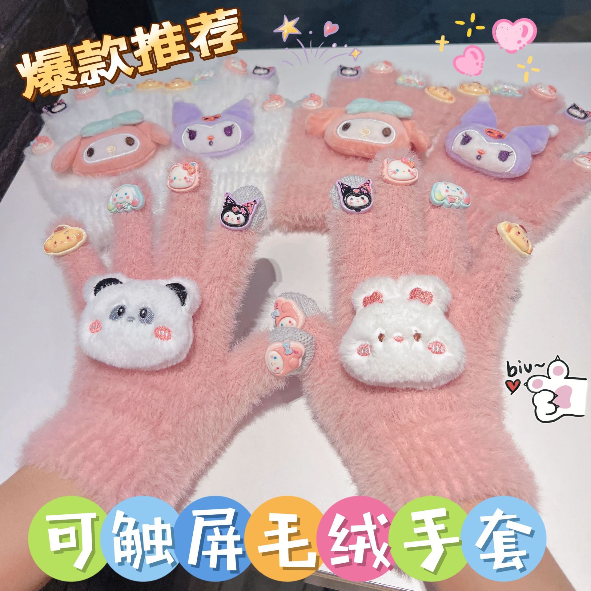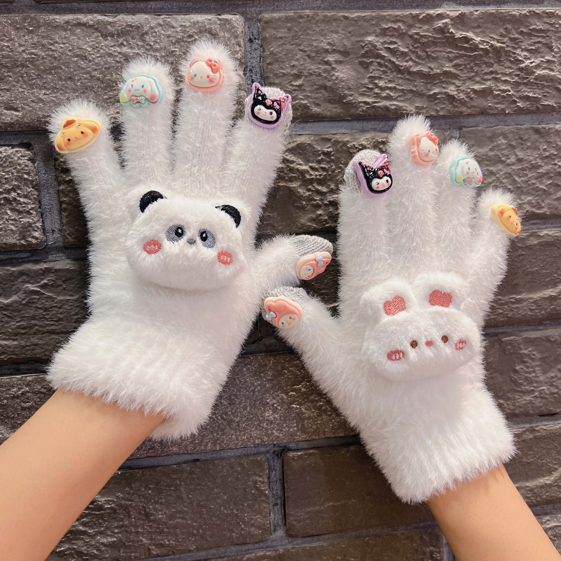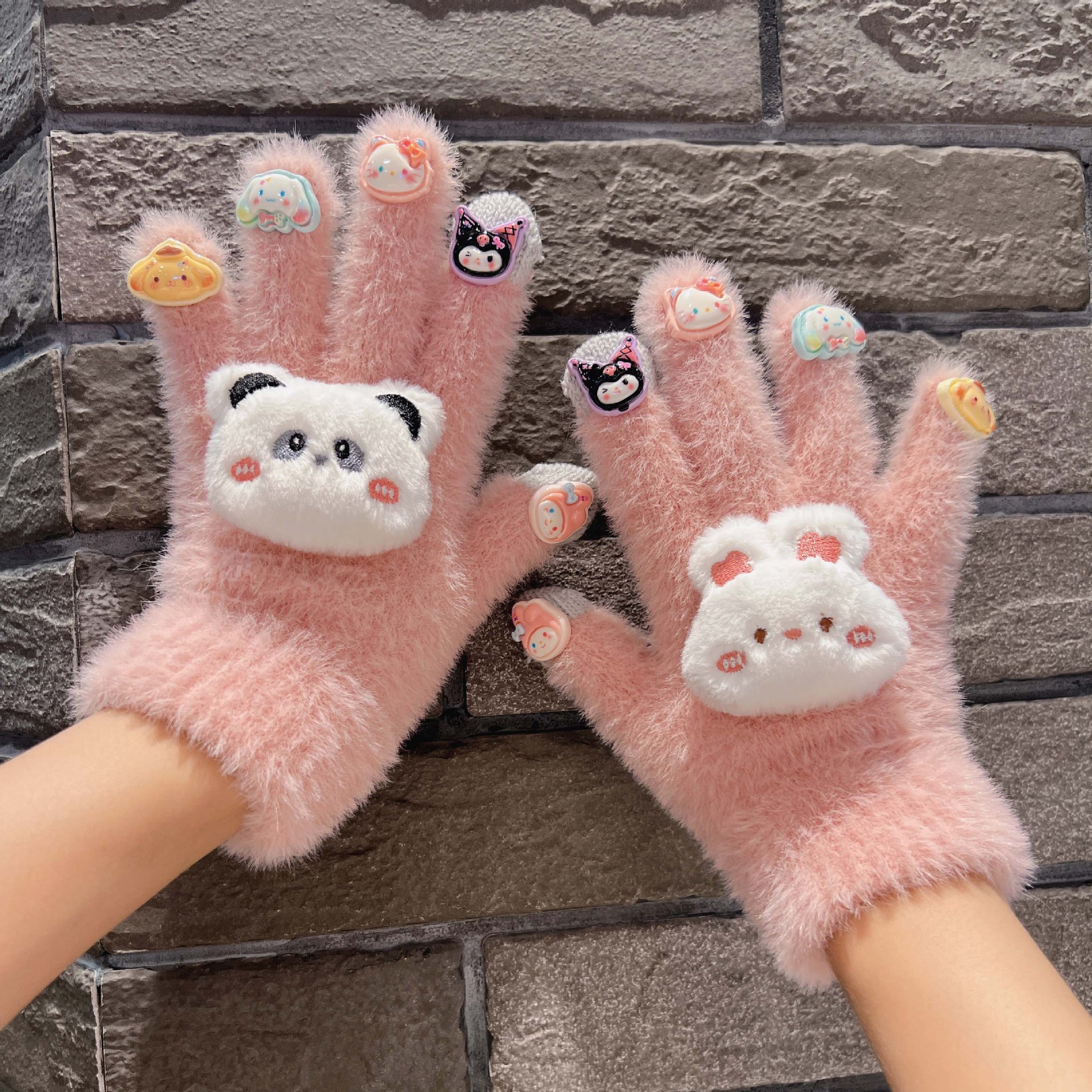 터치스크린용 쿠로미 팬더 플러시 장갑 여성용 겨울 학생용 사이클링용 따뜻하고 귀여운 만화 니트 장갑