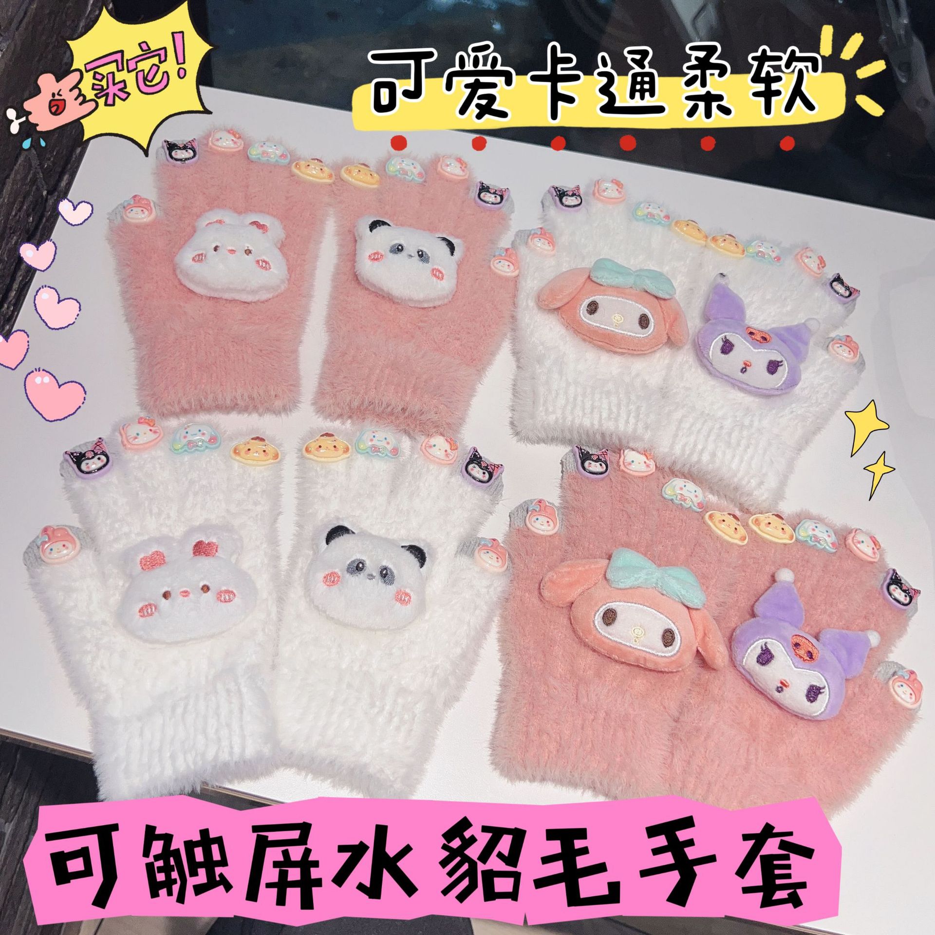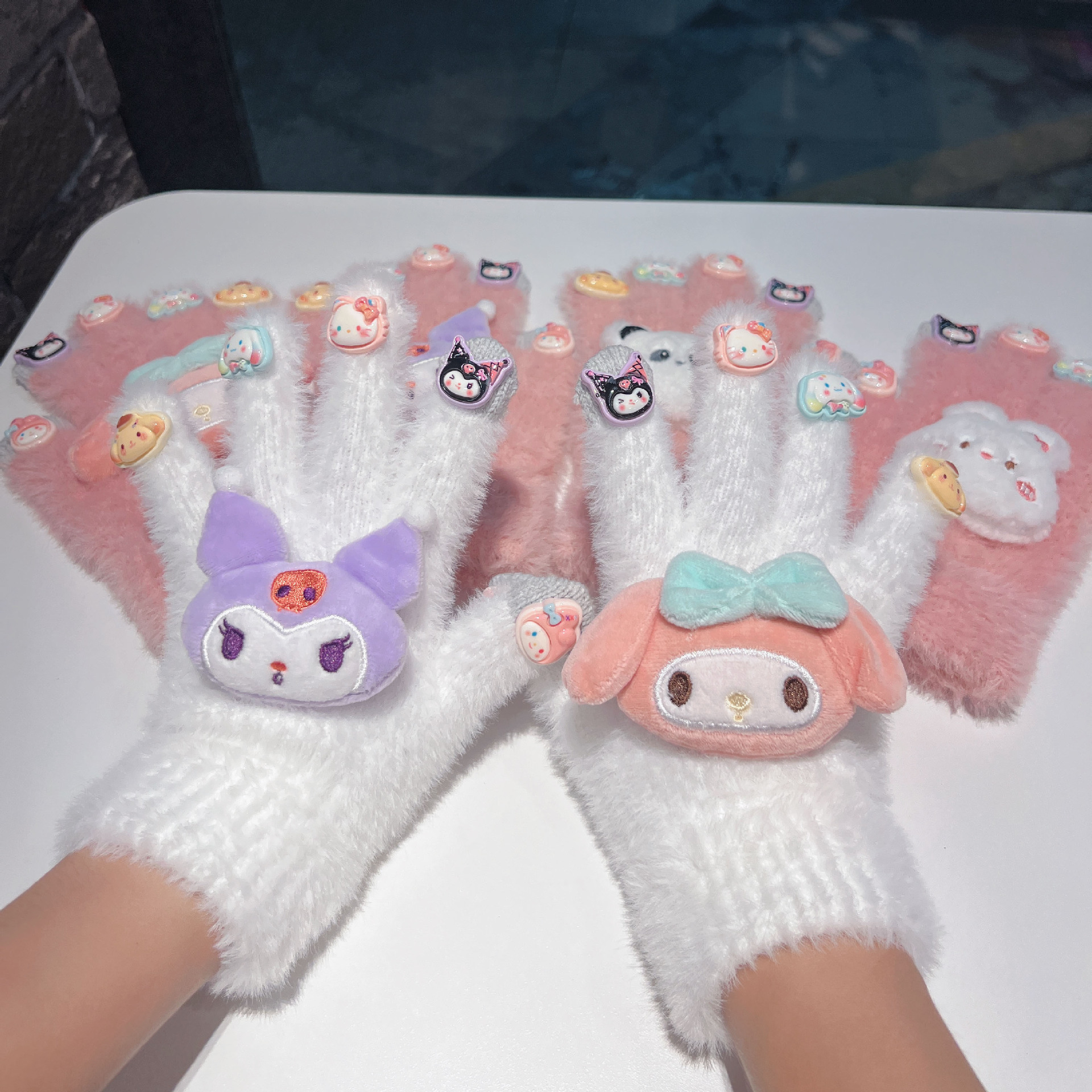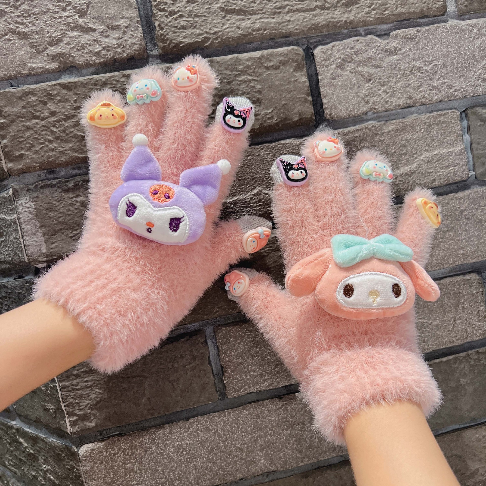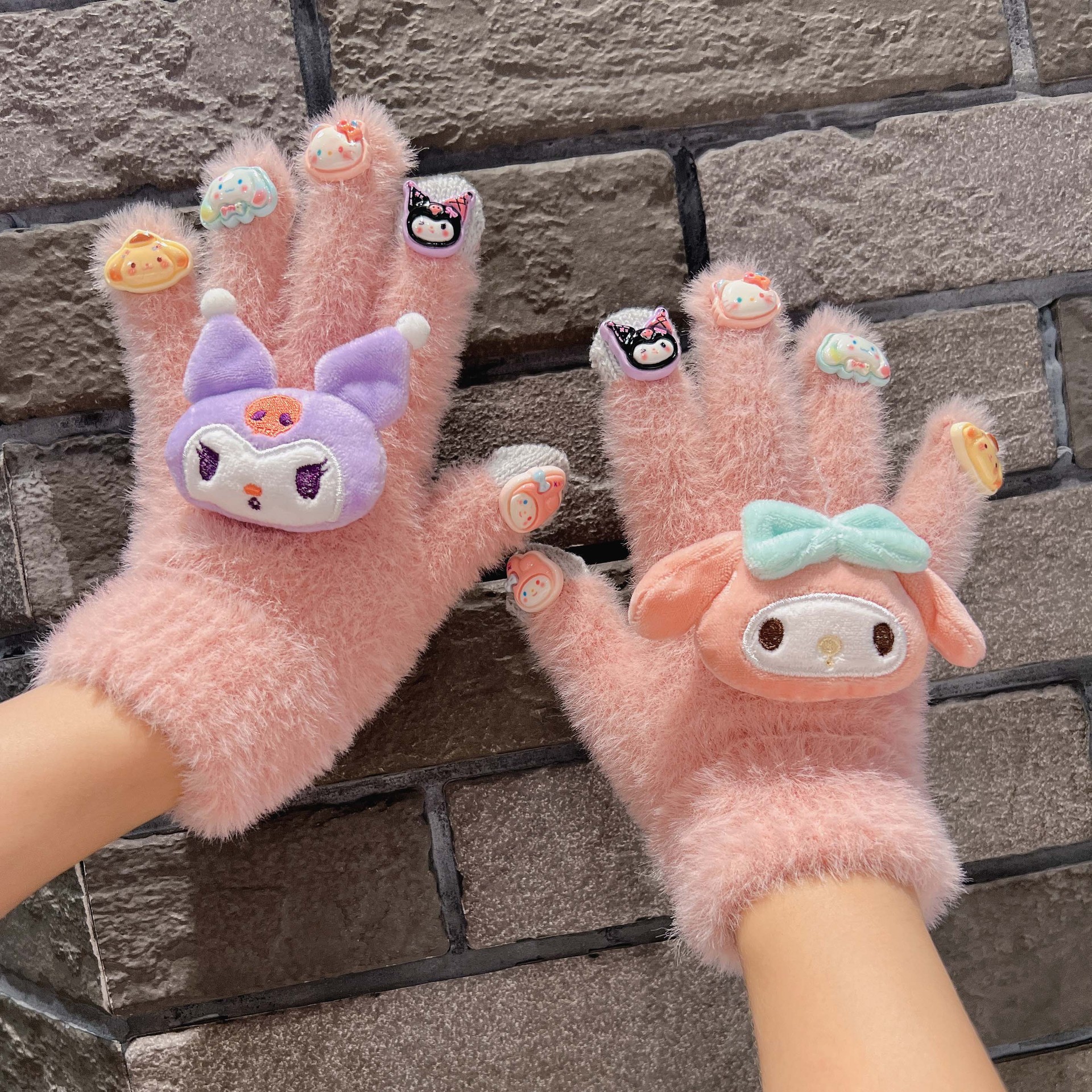 터치스크린용 쿠로미 팬더 플러시 장갑 여성용 겨울 학생용 사이클링용 따뜻하고 귀여운 만화 니트 장갑