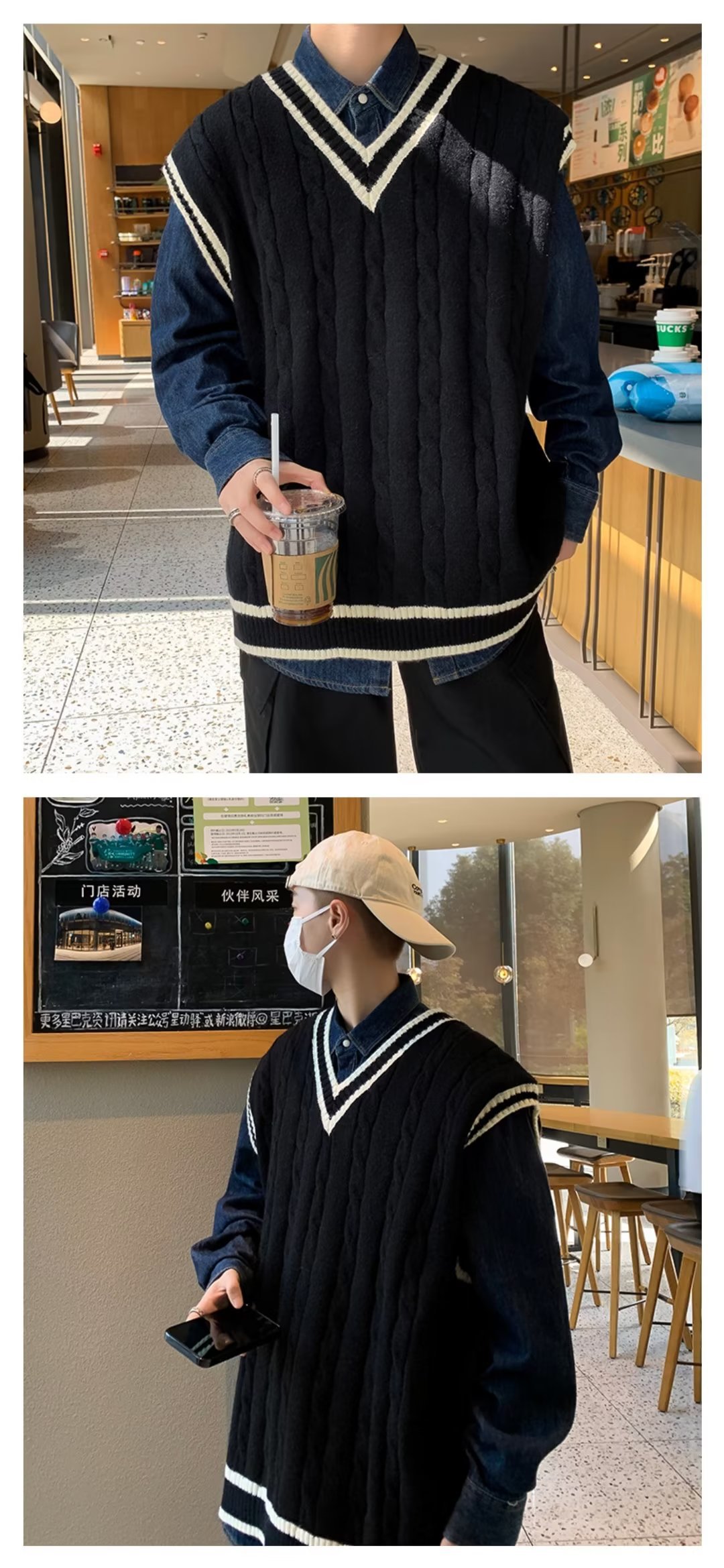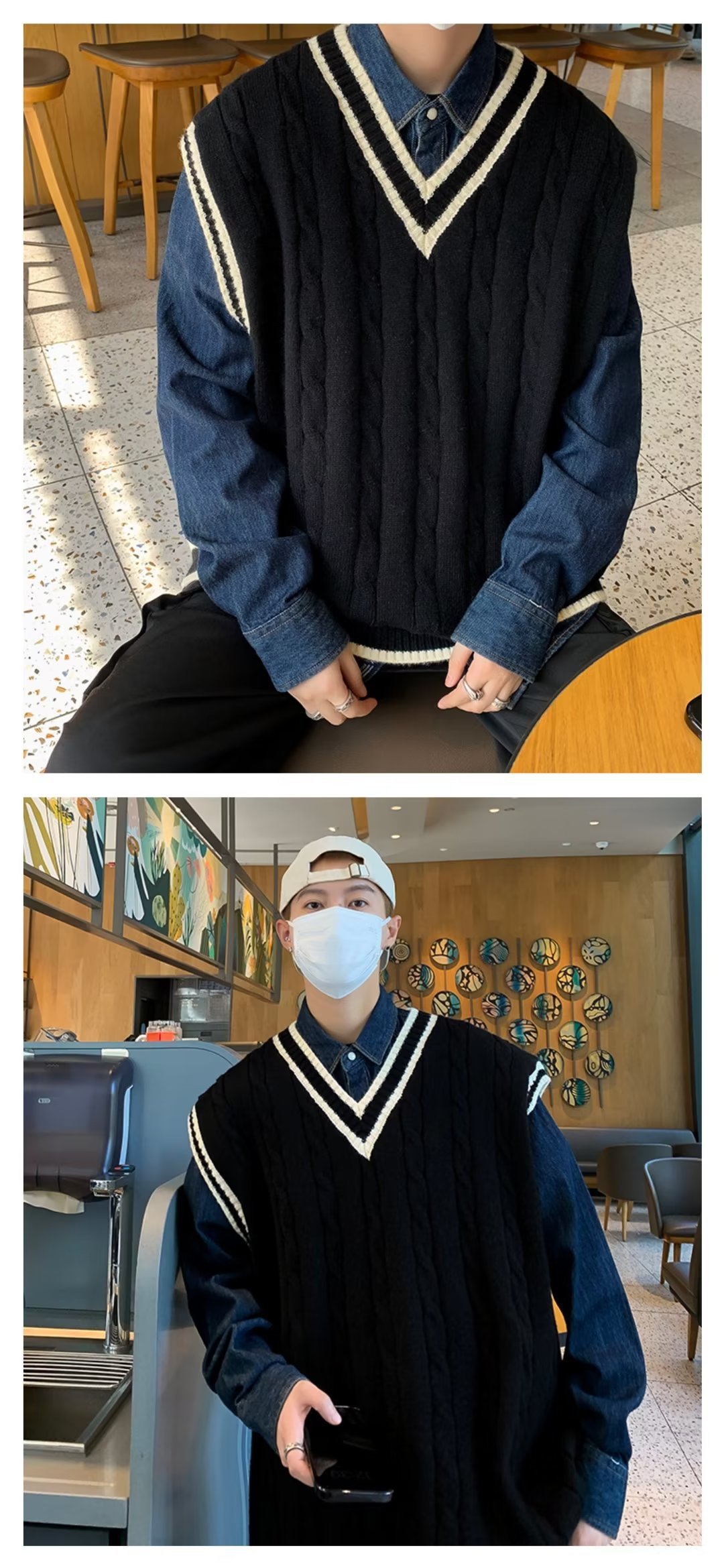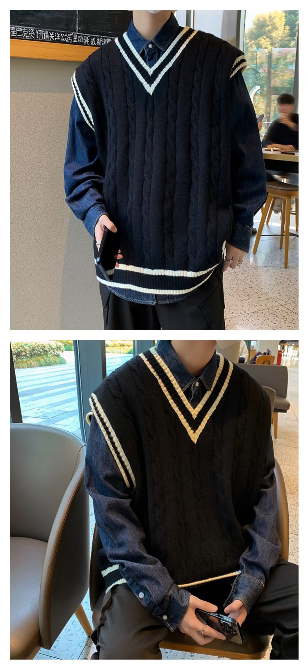 아메리칸 스타일 스웨터 조끼 남자의 가을과 겨울 Ins 패셔너블 루즈 V 넥 웨이슬 니트 일본 스타일 대학 스타일 조끼 스웨터스토어 가기